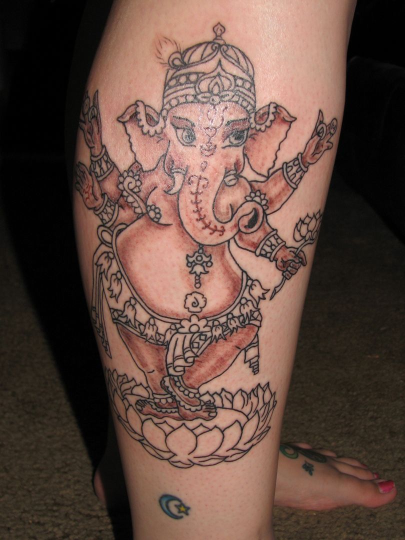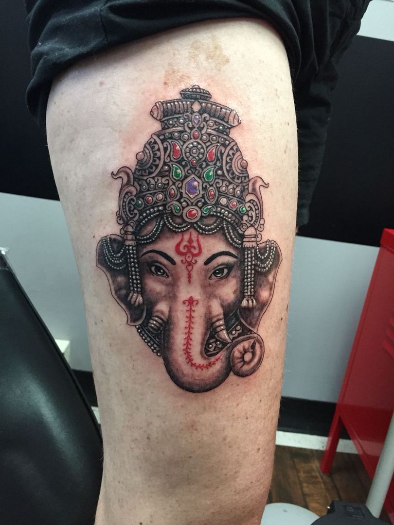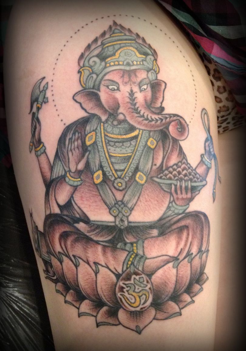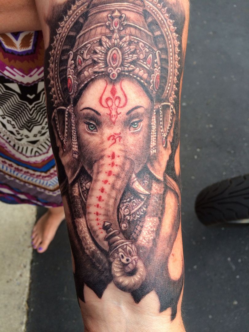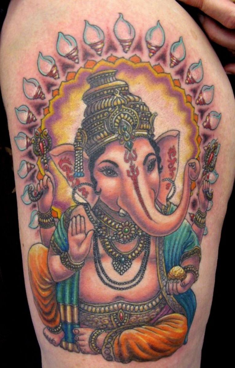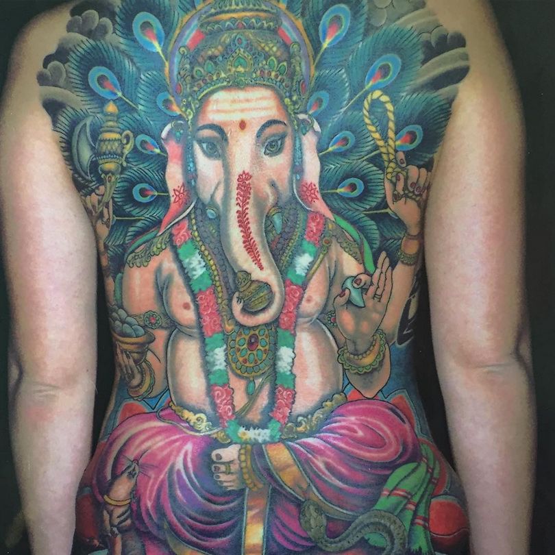 Ganesha-tatueringen symboliserar en ärofull man, en mäktig krigare. Det betyder visdom och förmågan att kommunicera sina tankar till andra. Gudomen förknippas med andlig tillväxt och därför är bilden så populär.