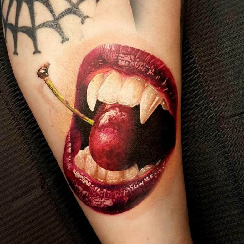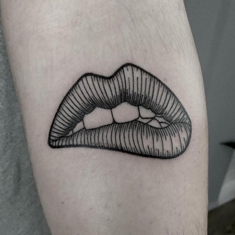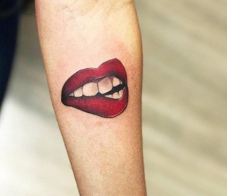 Läpptatuering passar människor med ett positivt sinnelag och kärlek till världen runt omkring dem. Sådana människor tror inte på ödet utan bestämmer själva över sina liv. En bild av en passionerad kyss indikerar att bäraren blåsig i ett förhållande och är inte lämplig för ett seriöst förhållande. Tänder symboliserar rädsla för flickor, medan lätt öppna läppar visar att den unge mannen har för avsikt att inleda ett förhållande inom en snar framtid.