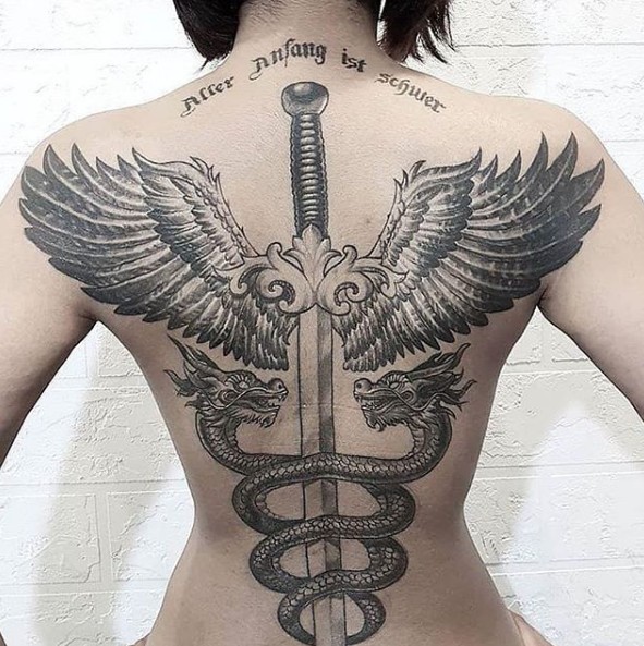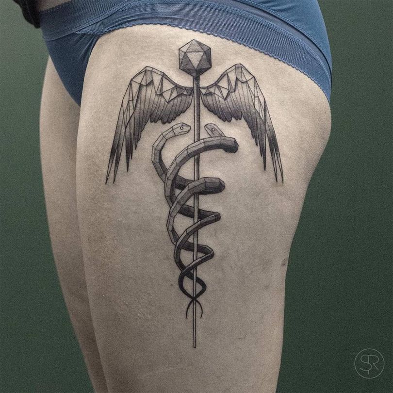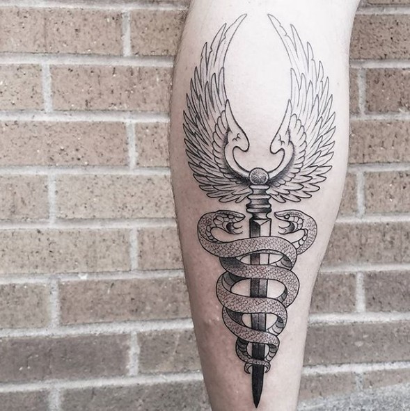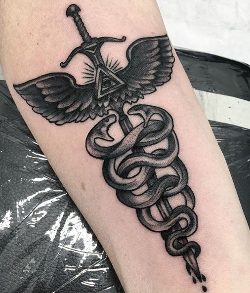 Det finns otroligt många alternativ för kaduceus-tatueringar. Det finns skisser där staven spelar rollen som svärd, dolk, dragen ryggrad. Ofta är vingarna på stavens topp noggrant återgivna med biologisk precision, de ersätts av en örn, duva eller korp. Ormarna kan ändra position och antalet ringar runt staven varierar också.