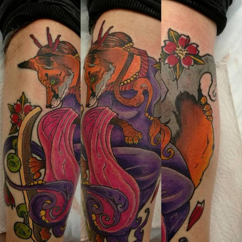 Efter hundra år kan en räv anta vilken mänsklig form som helst, men denna rit kräver en skalle på huvudet. En tatuerad kitsune med en dödskalle över sig betyder därför uthållighet och visdom.Ibland vill en person tatuera en kitsune i skepnad av en geisha. Den symboliserar intelligens, mystisk skönhet och dessutom många hemligheter. En man kan låta tatuera sig för att visa sin kärlek till attraktiva, diskreta kvinnor.