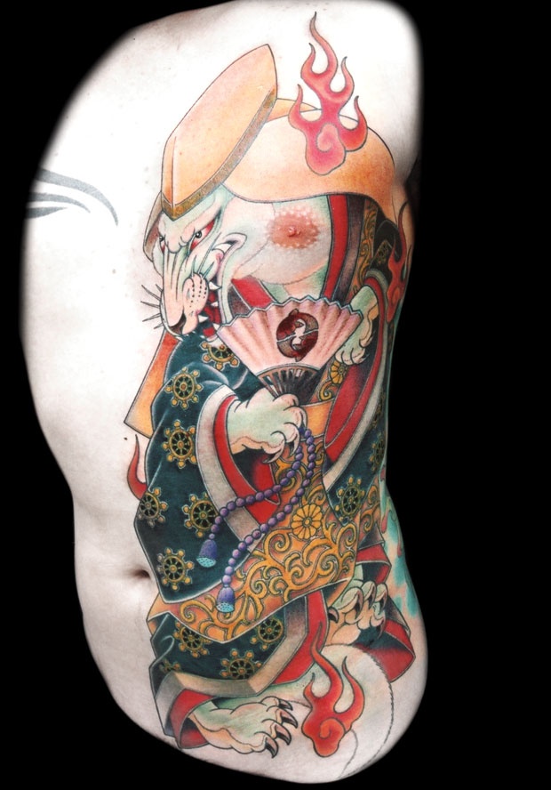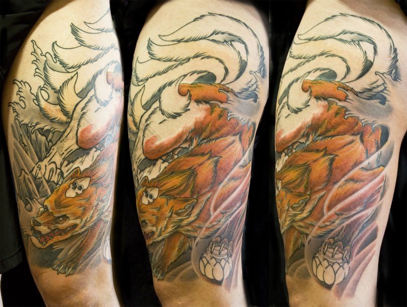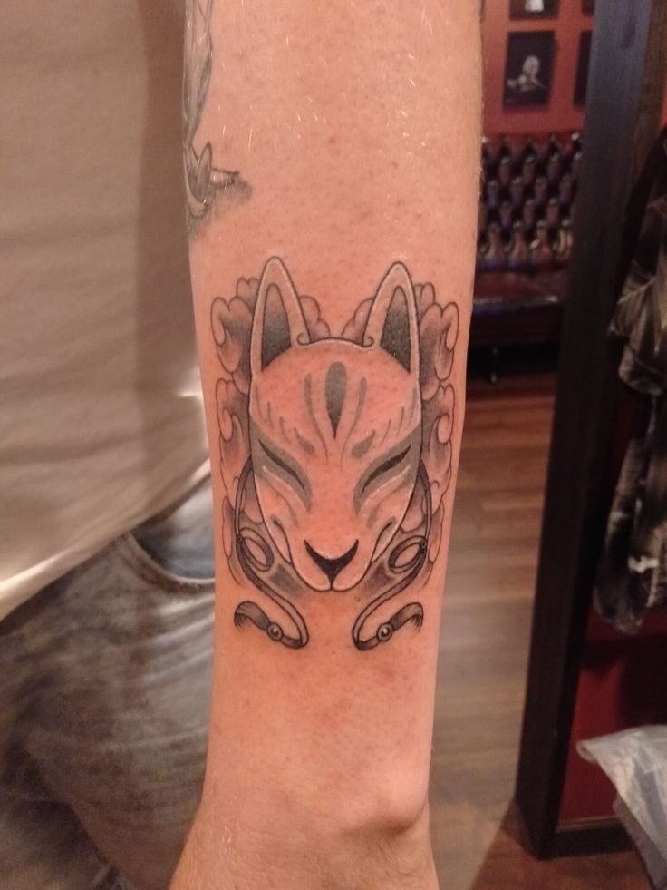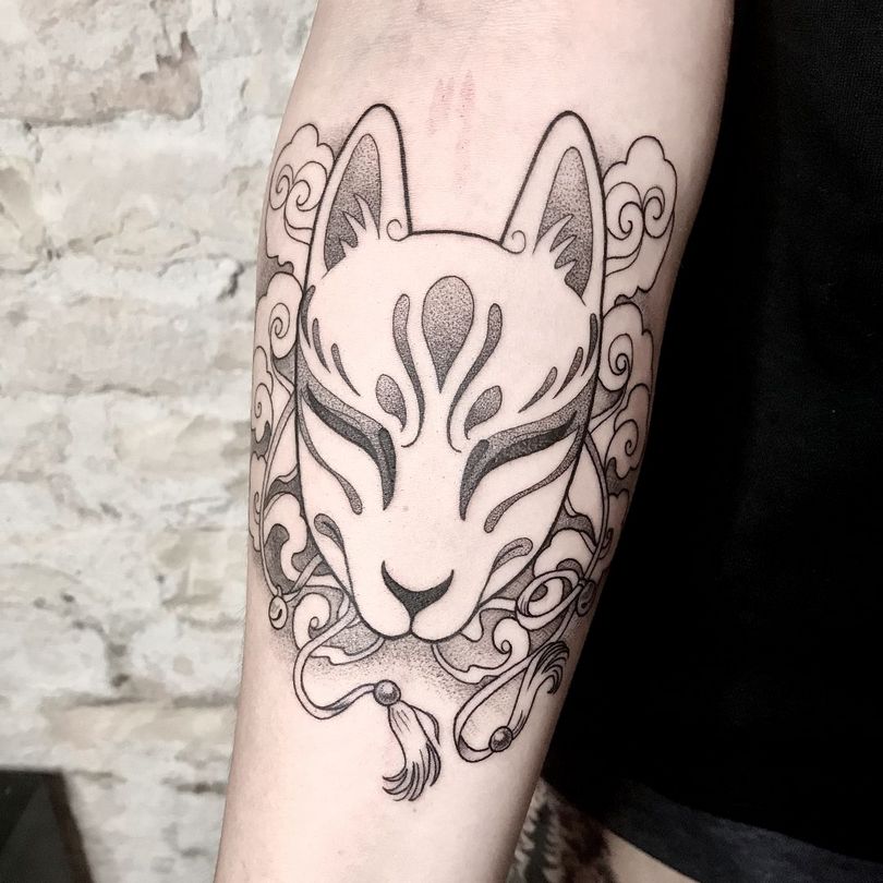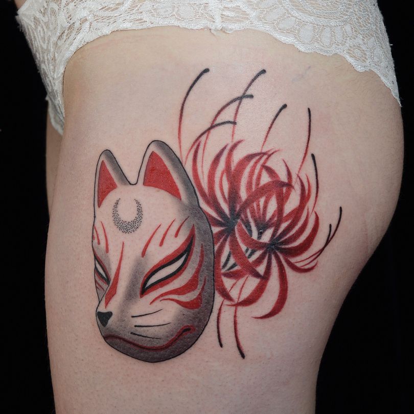 En kitsune som föreställer en dödskalle. Beroende på var skallen är placerad i förhållande till räven ändras tatueringens betydelse. Om räven till exempel finns i skallen förknippas teckningen med återfödelsens oundviklighet. Det antyder att det oförklarliga, övernaturliga finns i ens liv.