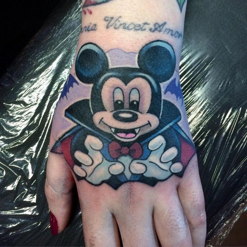 Tattoo Mickey Mouse - en fullständig beskrivning, betydelse för tjejer, var man ska applicera (på armen, benet), roliga skisser och foton.