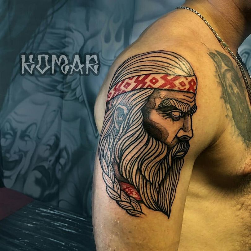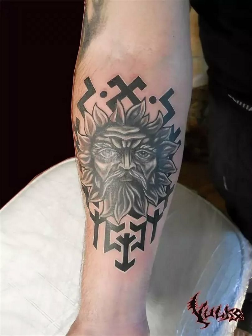 Den här tatueringen, som är gjord i traditionell stil, sammanfattar alla de modigaste egenskaperna hos en sann slav. Tatueringen är perfekt för dem för vilka samvete, heder eller stolthet inte tillåter att de flyr från faran, från sin fiende. En som kan få fienden att fly med sin oräddhet och styrka och som visar en verkligt stark uthållighet och karaktärsfasthet. En sådan person kännetecknas av en önskan att få en bild av den slaviska guden målad på sin kropp.