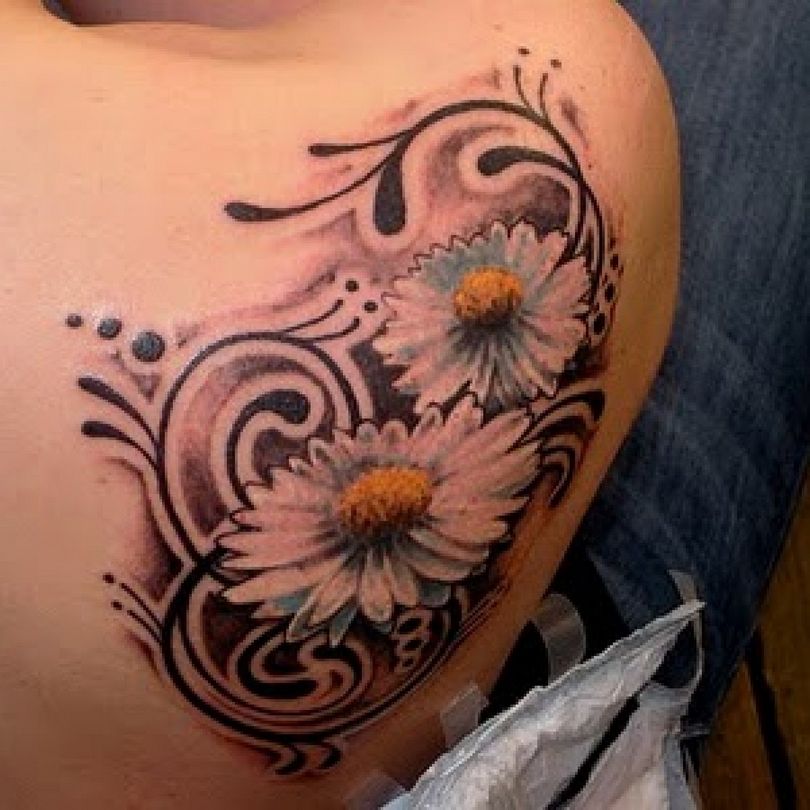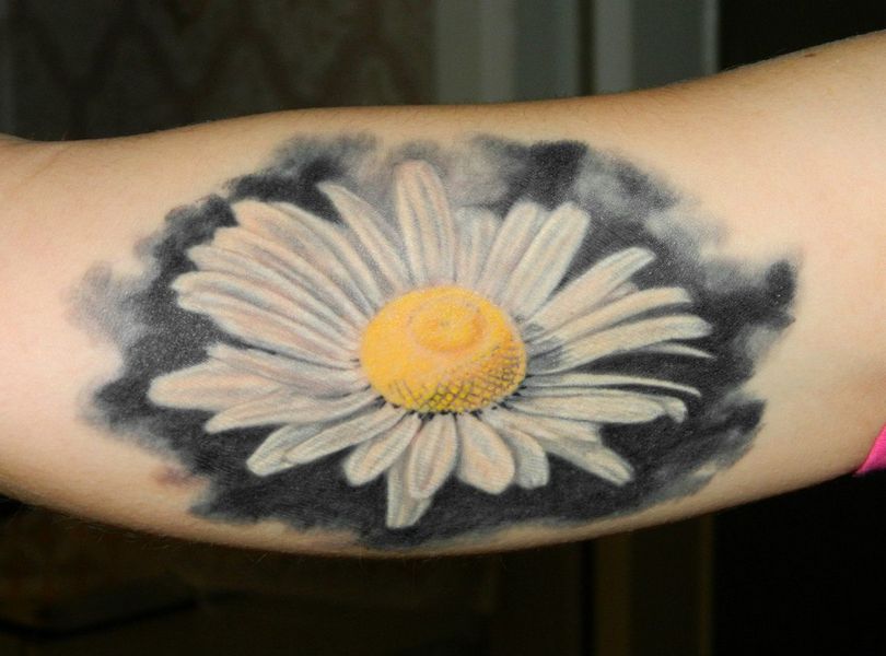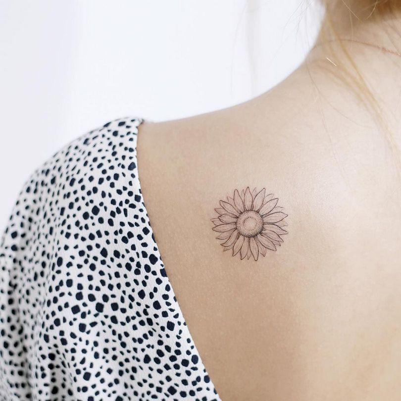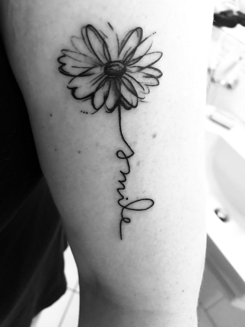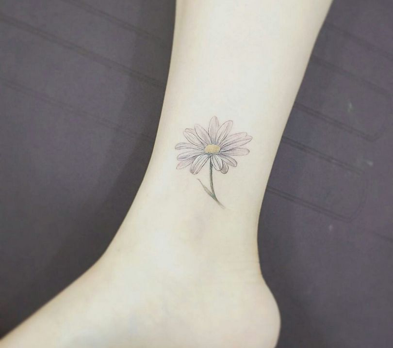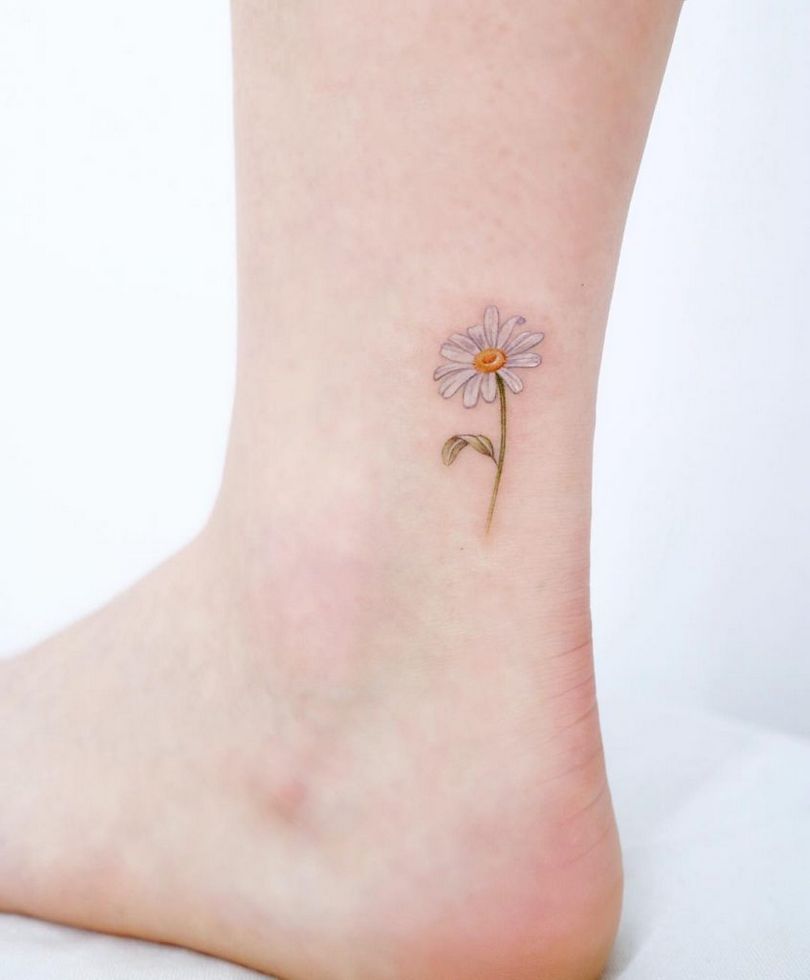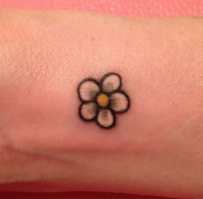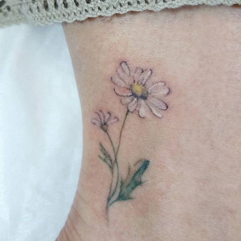 Blomman kan kompletteras med olika detaljer - mönster, blad, ornament, Yin-Yang-symbol, fjärilar, roliga ansikten, smiley-ansikten. Små tusensköna tatueringar är ett mycket populärt tema. Det är en vacker och söt feminin dekoration som inte har något negativt med sig.