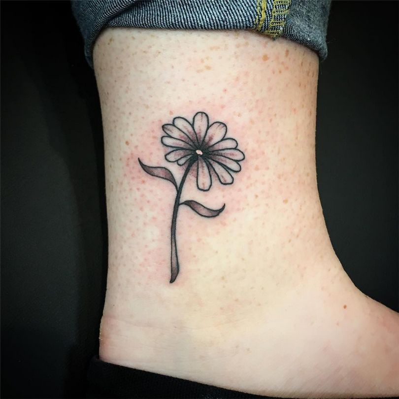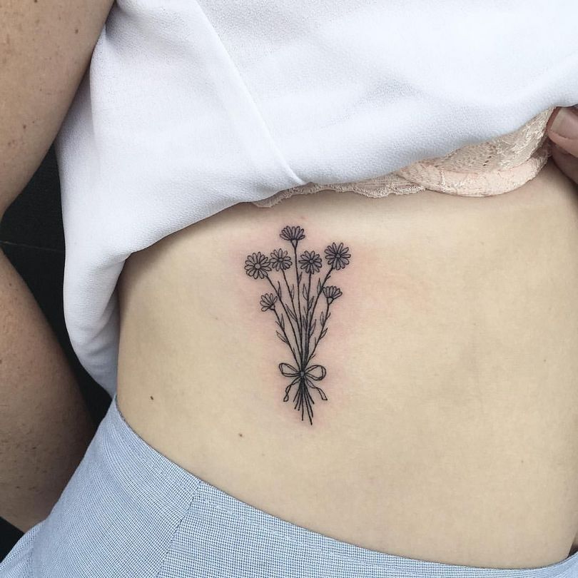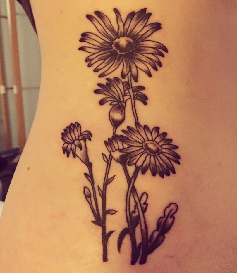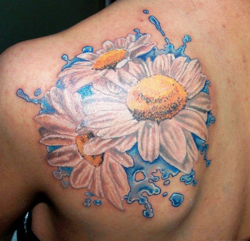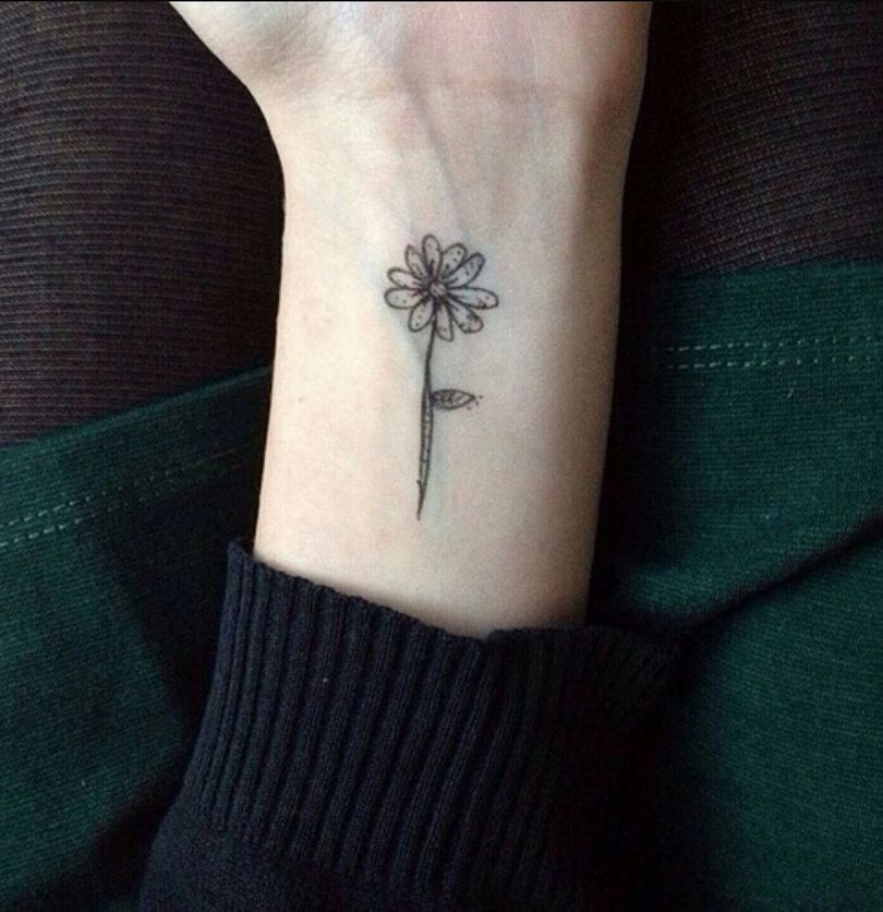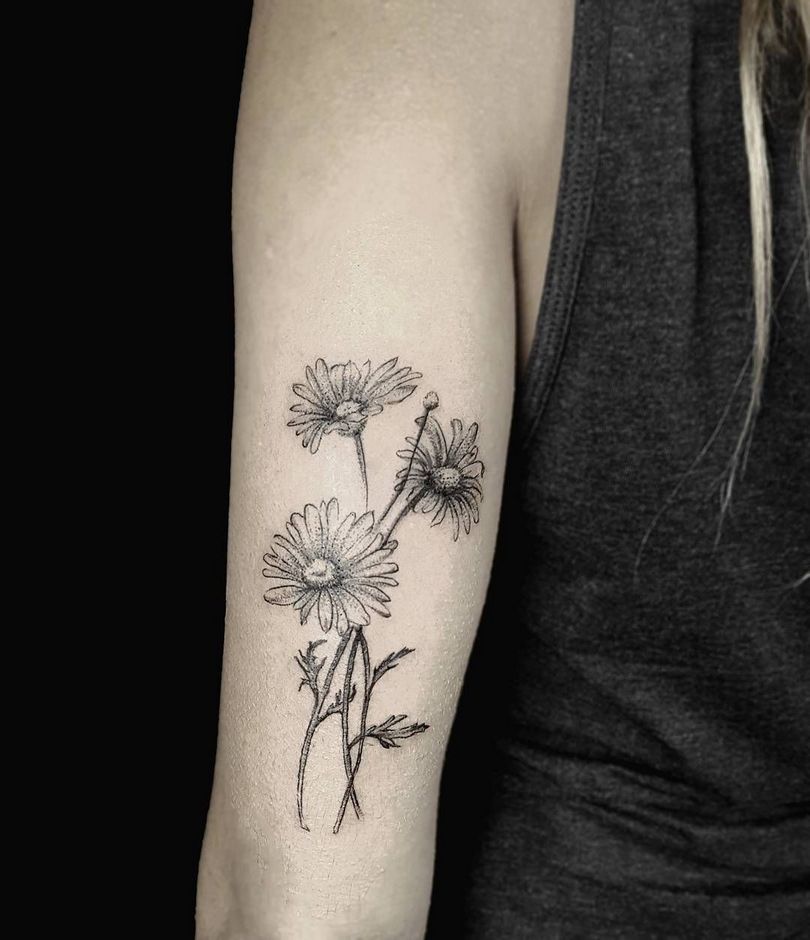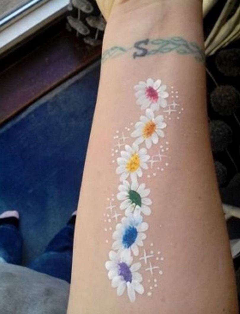 Blomman kan kompletteras med olika detaljer - mönster, blad, ornament, Yin-Yang-symbol, fjärilar, roliga ansikten, smiley-ansikten. Små tusensköna tatueringar är ett mycket populärt tema. Det är en vacker och söt feminin dekoration som inte har något negativt med sig.