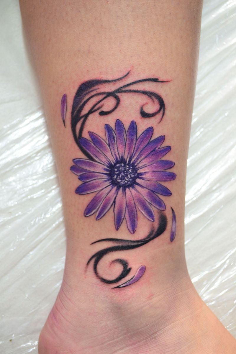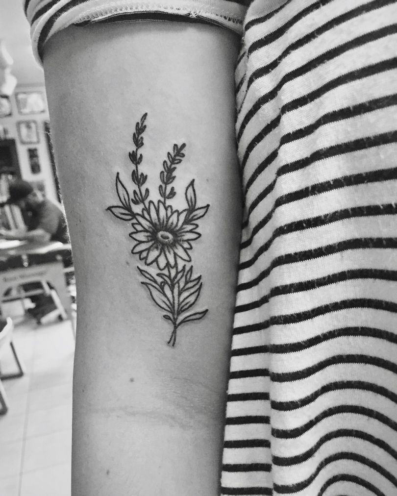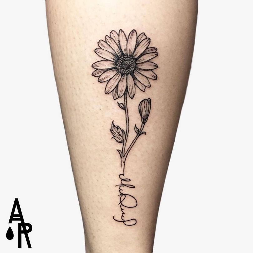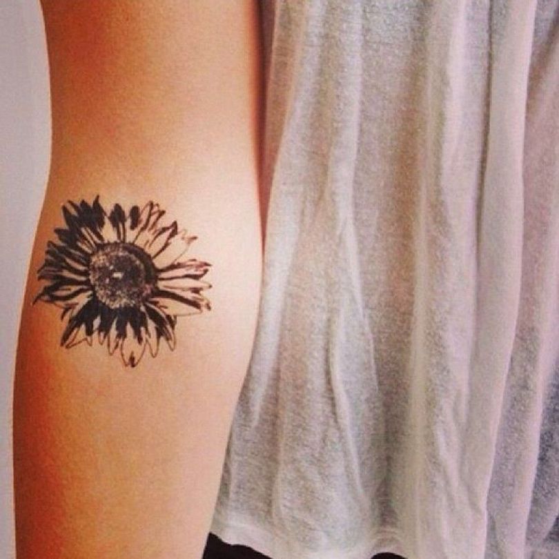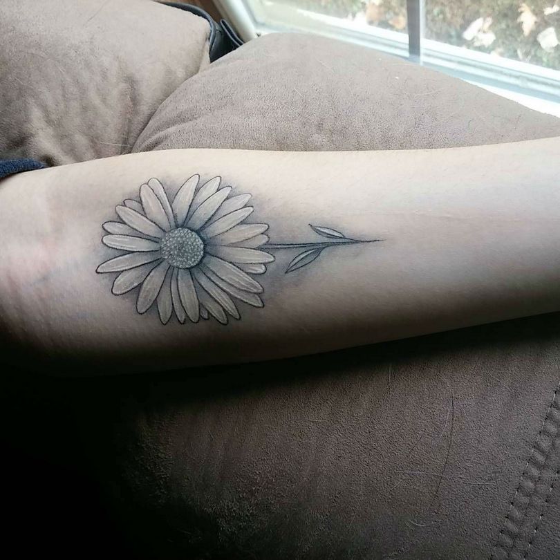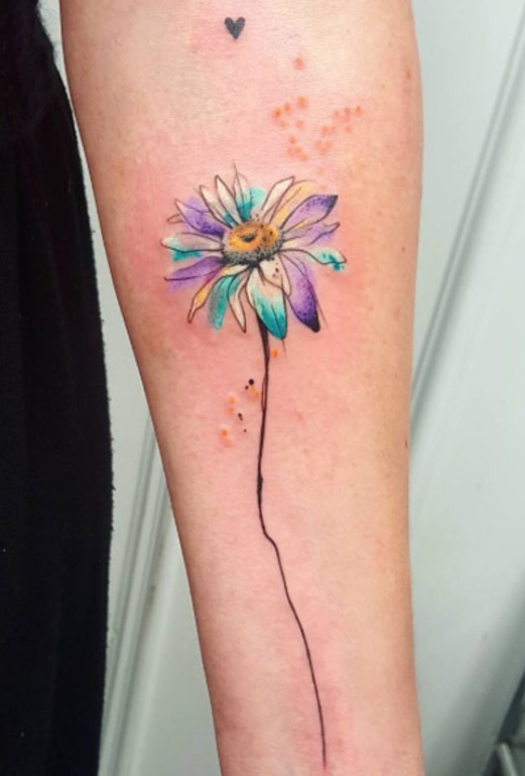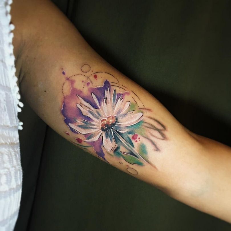Blomman kan kompletteras med olika detaljer - mönster, blad, ornament, Yin-Yang-symbol, fjärilar, roliga ansikten, smiley-ansikten. Små tusensköna tatueringar är ett mycket populärt tema. Det är en vacker och söt feminin dekoration som inte har något negativt med sig.