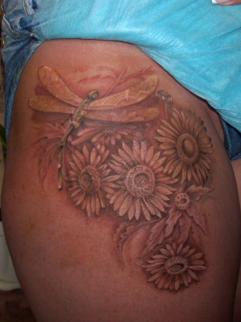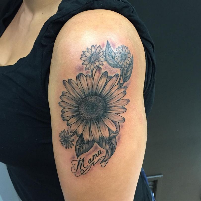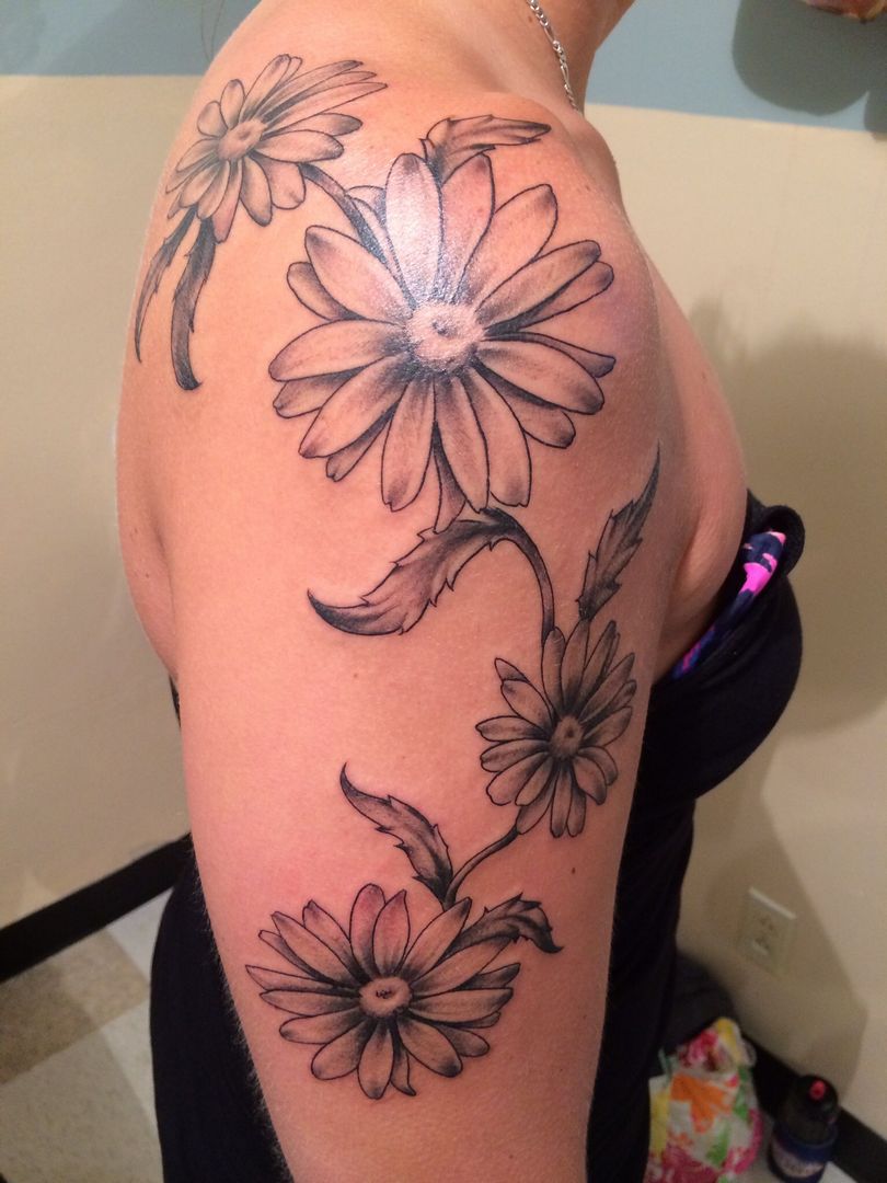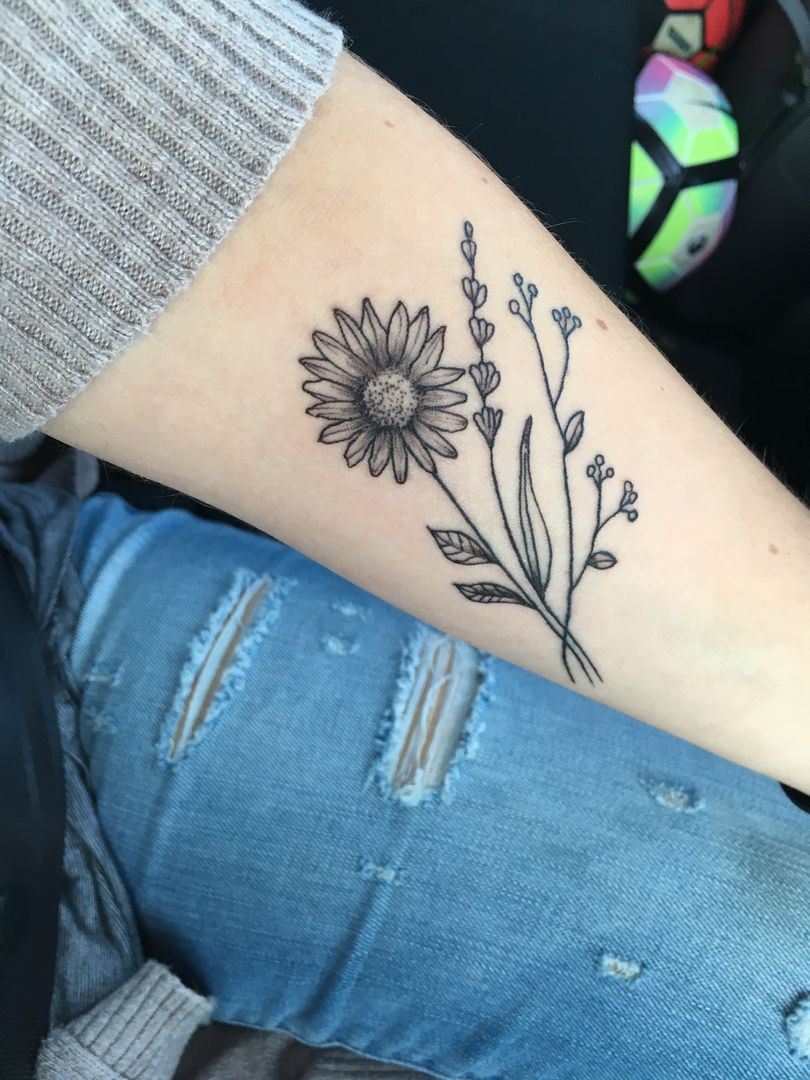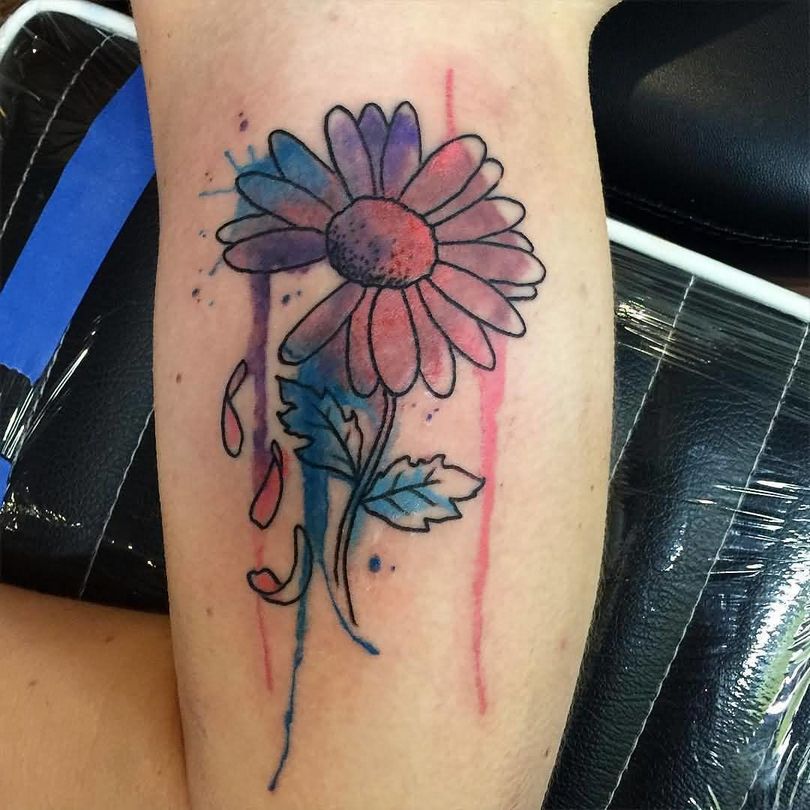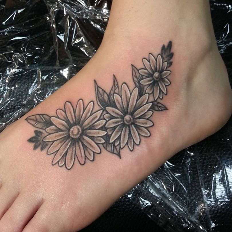 Blomman kan kompletteras med olika detaljer - mönster, blad, ornament, Yin-Yang-symbol, fjärilar, roliga ansikten, smiley-ansikten. Små tusensköna tatueringar är ett mycket populärt tema. Det är en vacker och söt feminin dekoration som inte har något negativt med sig.