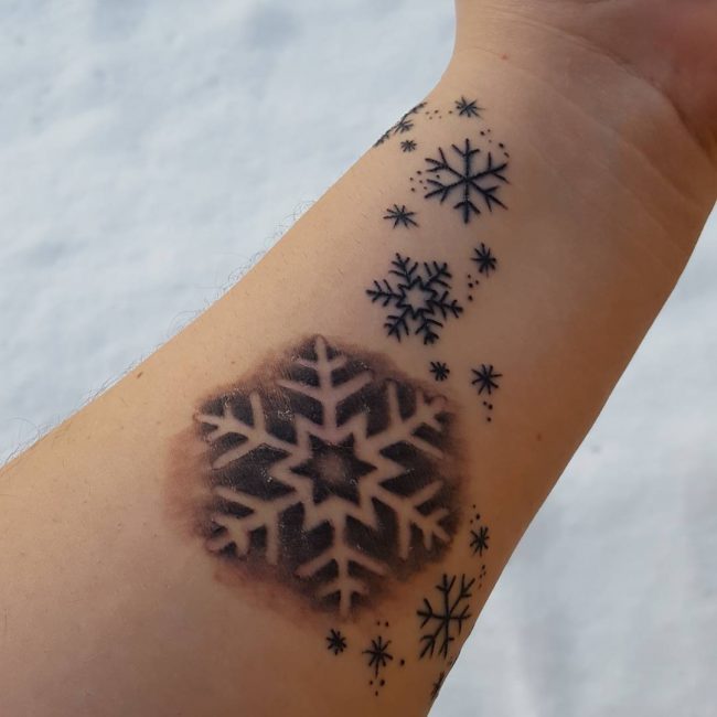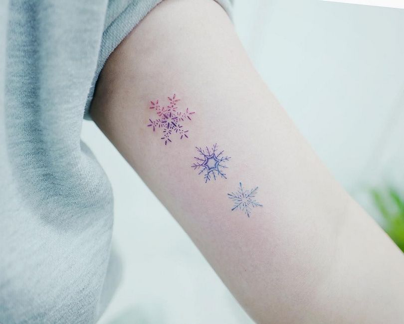 Snöflingor kan göras i olika färger. De tecknas vanligen i blå och lila nyanser eller i svart. Snöflingetatueringarna kan också göras i vitt, vilket gör dem minimala och känsliga. Eftersom snöflingor är vita är det en bra idé att prova en snöflingetatuering med vitt bläck.