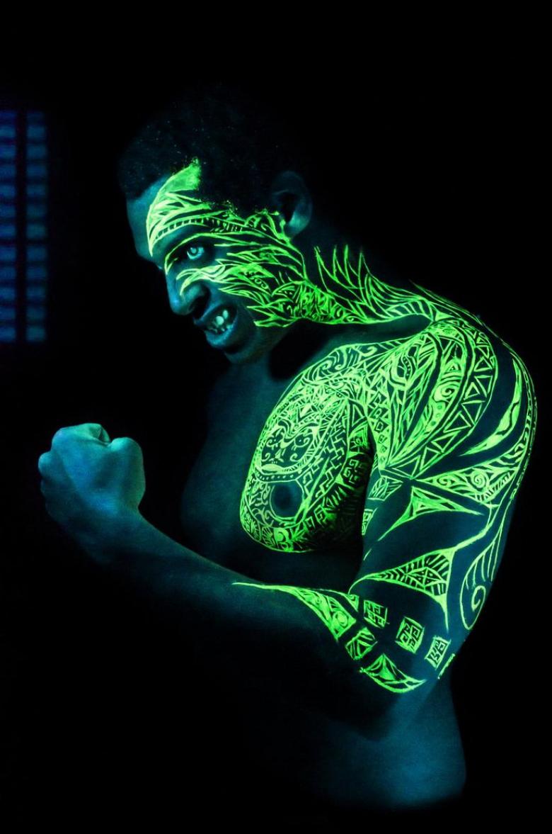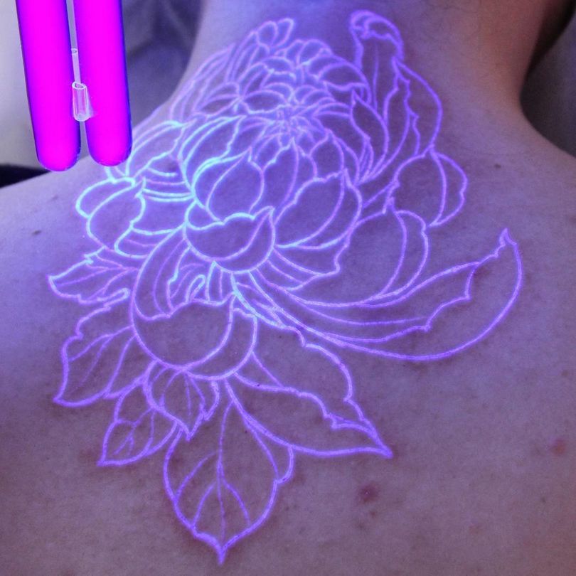 Le maître tatoueur applique de l'encre blanche, qui contient des pigments réactifs aux UV, grâce auxquels le tatouage brille. Pendant la journée, l'image ressemble à un dessin corporel normal, mais la nuit ou dans l'obscurité, elle brille.