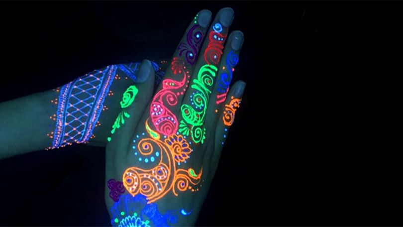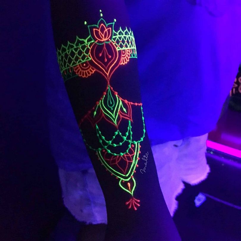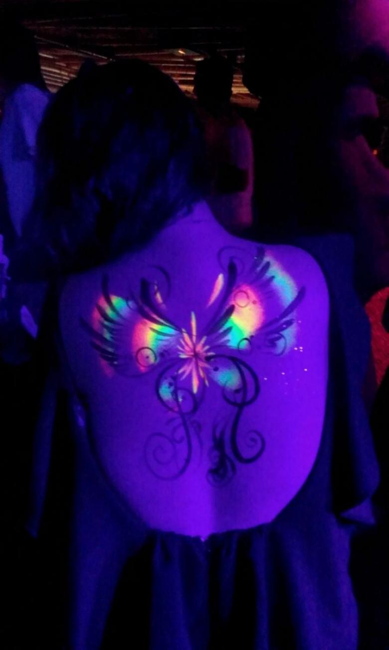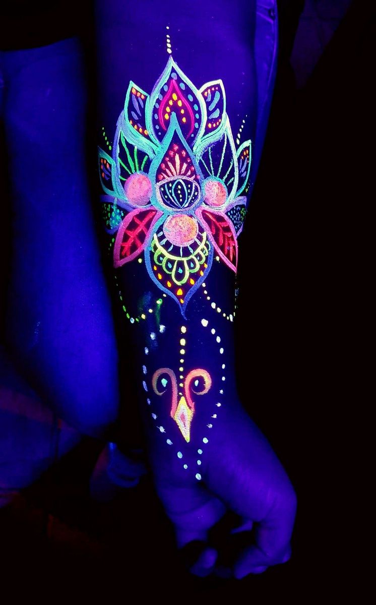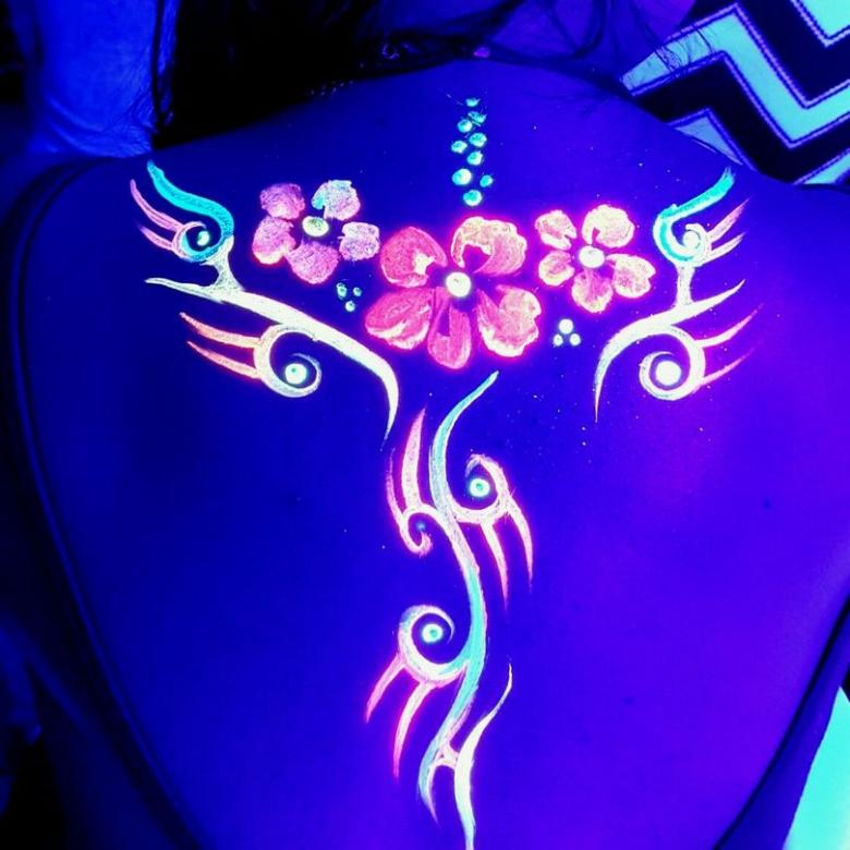 L'art corporel réalisé avec des encres contenant des pigments réactifs aux UV brille pour toujours. Ils n'ont pas de durée de vie.
