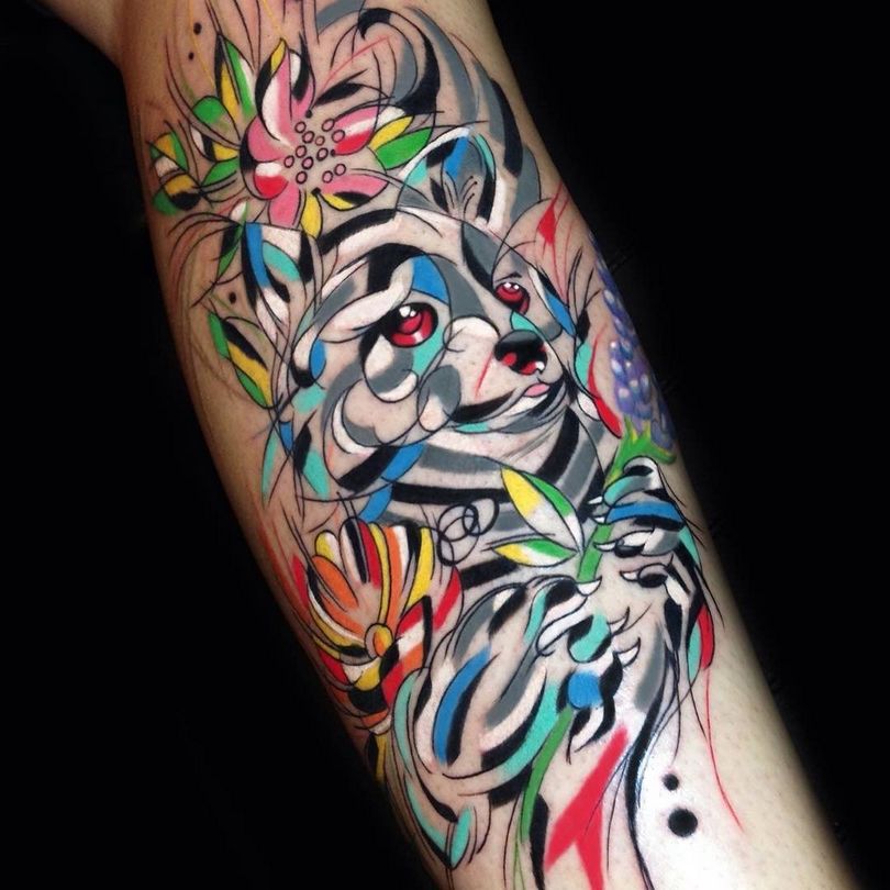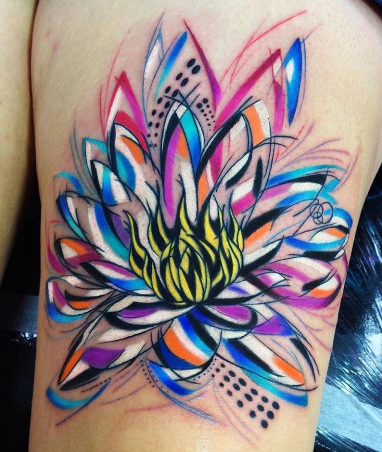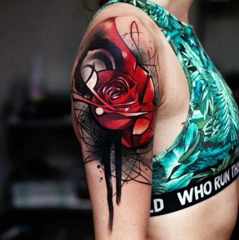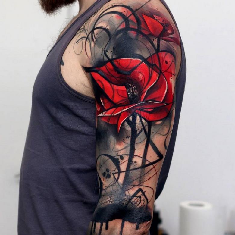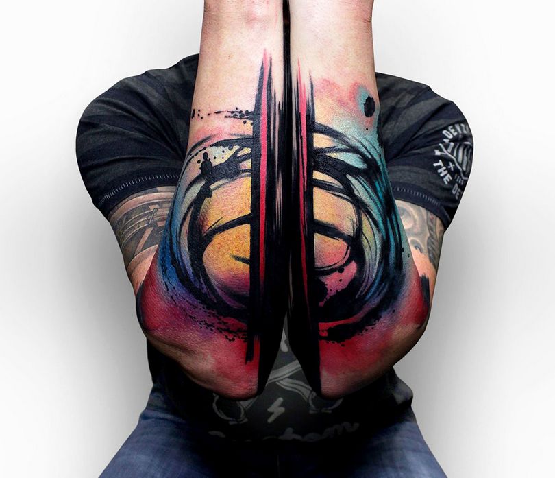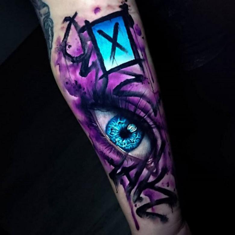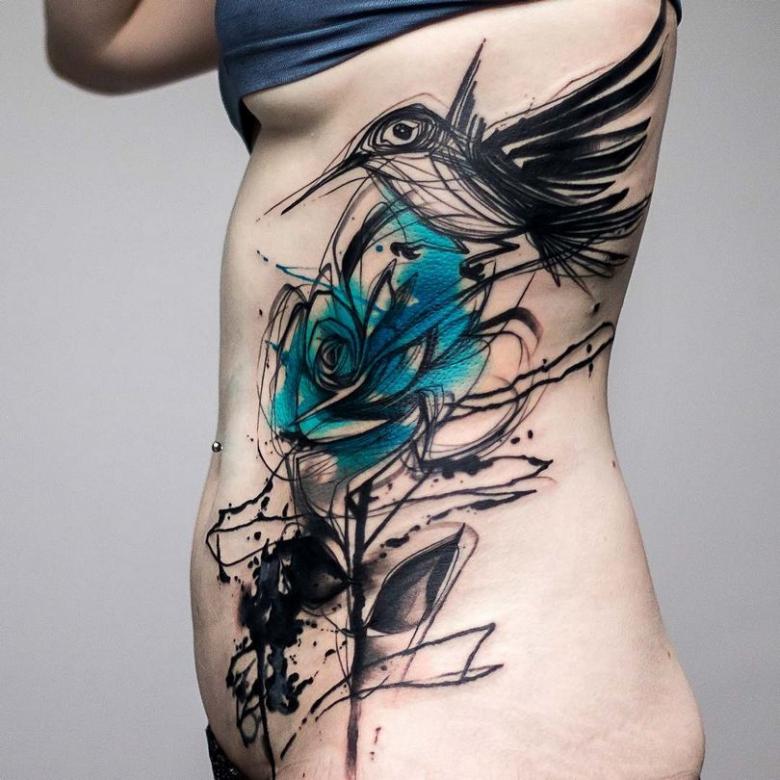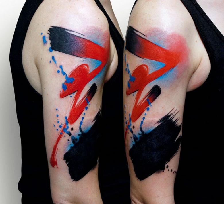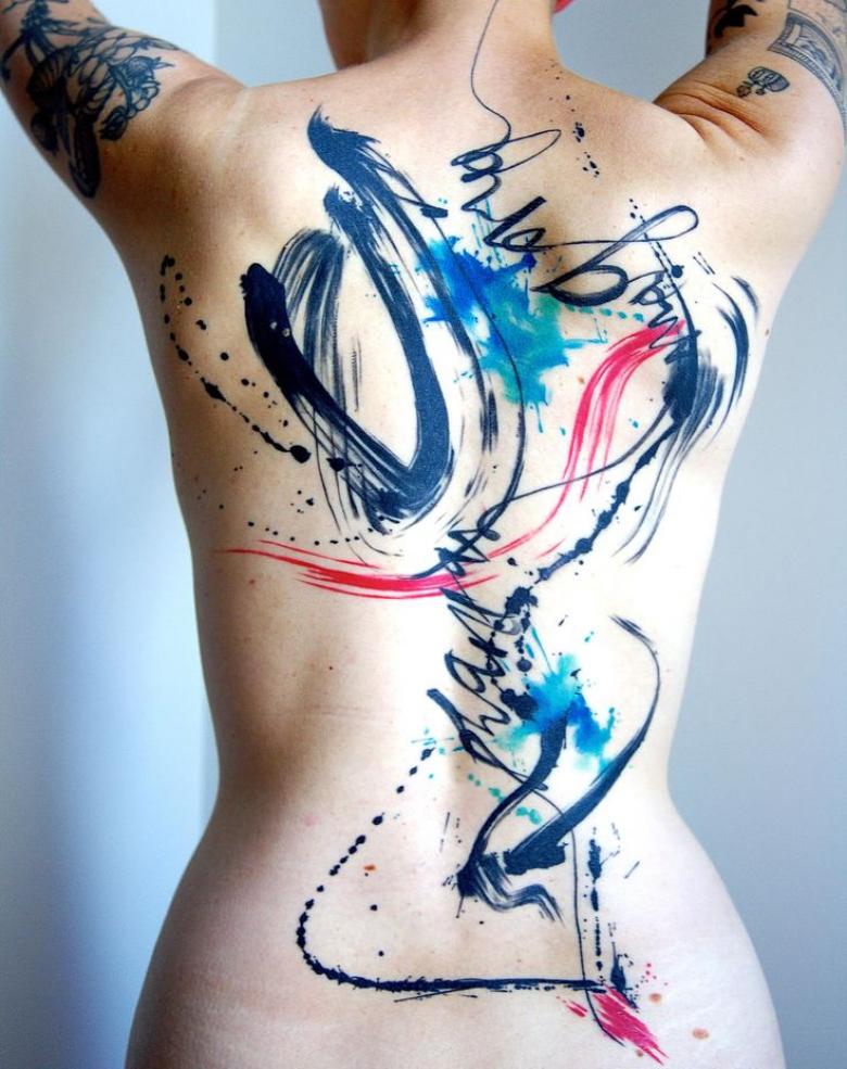 Des traits d'encre dégoulinante sont utilisés pour créer un nouveau look pour le porteur du tatouage et son âme créative. Ce type de dessin imite l'aquarelle et peut être combiné avec n'importe quelle image ou figure simple.
