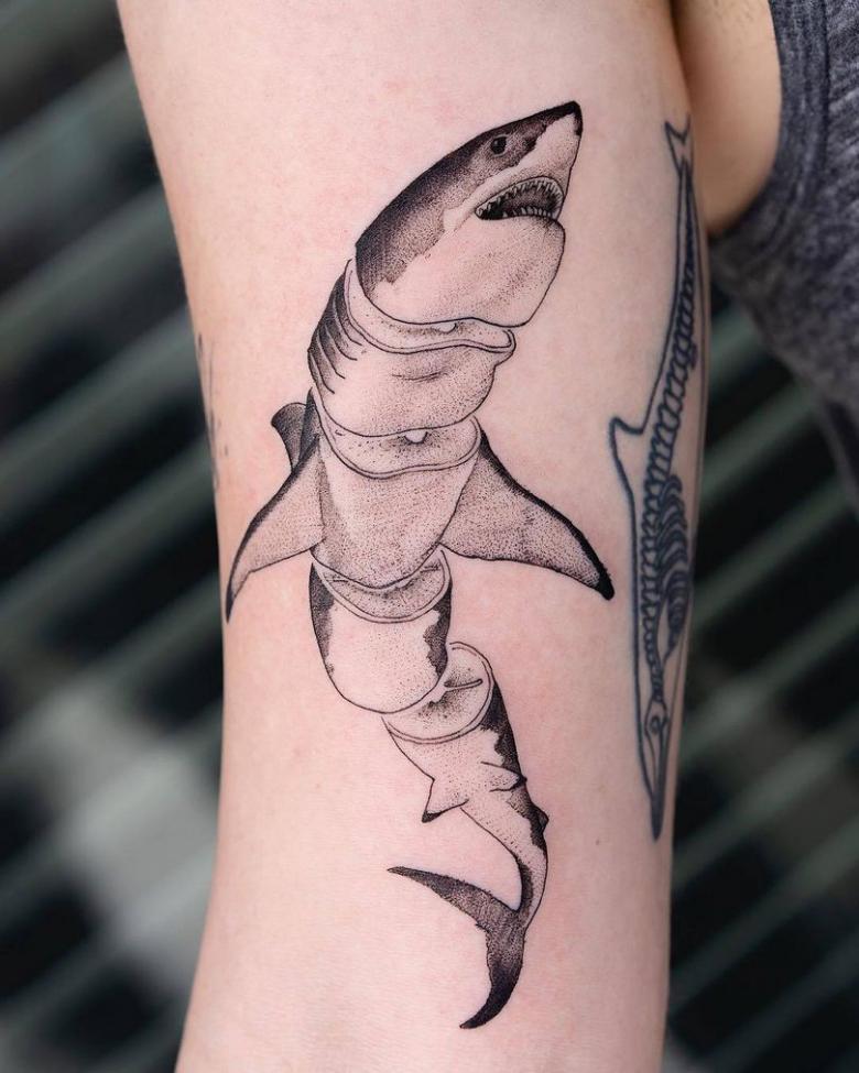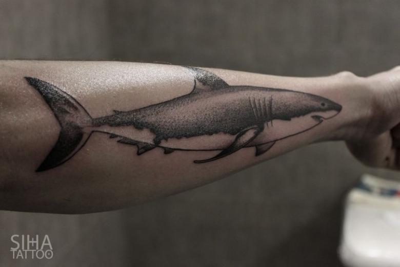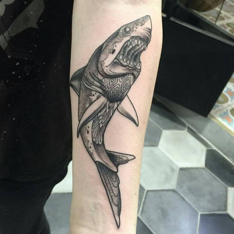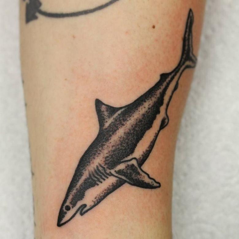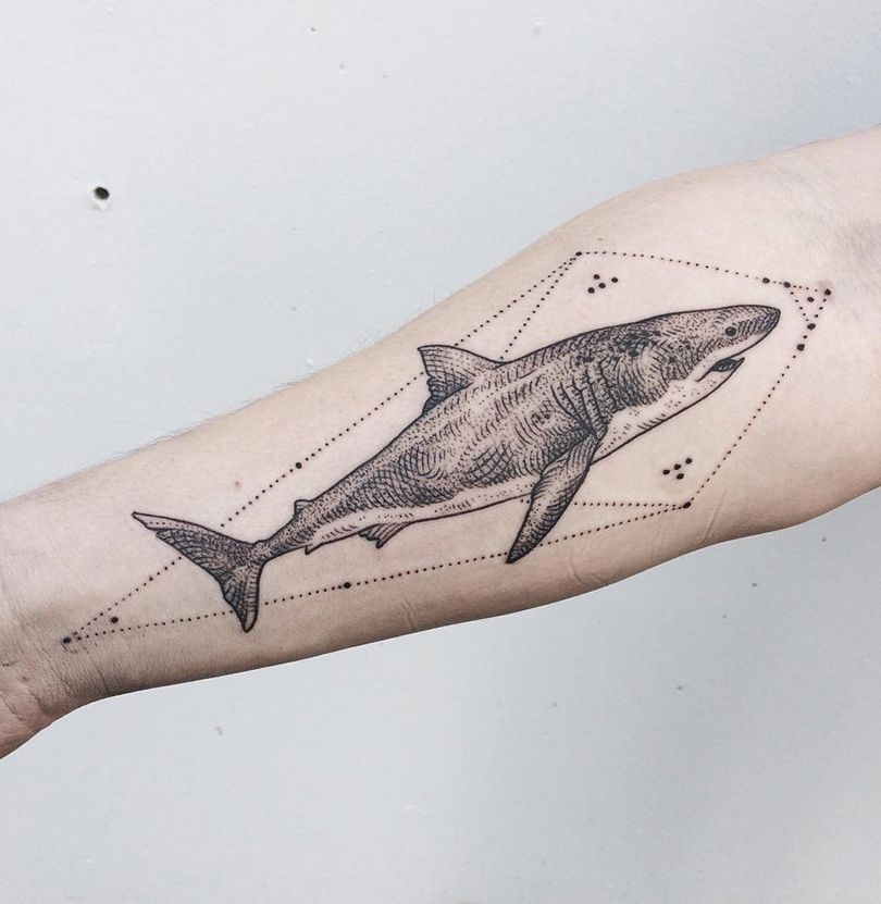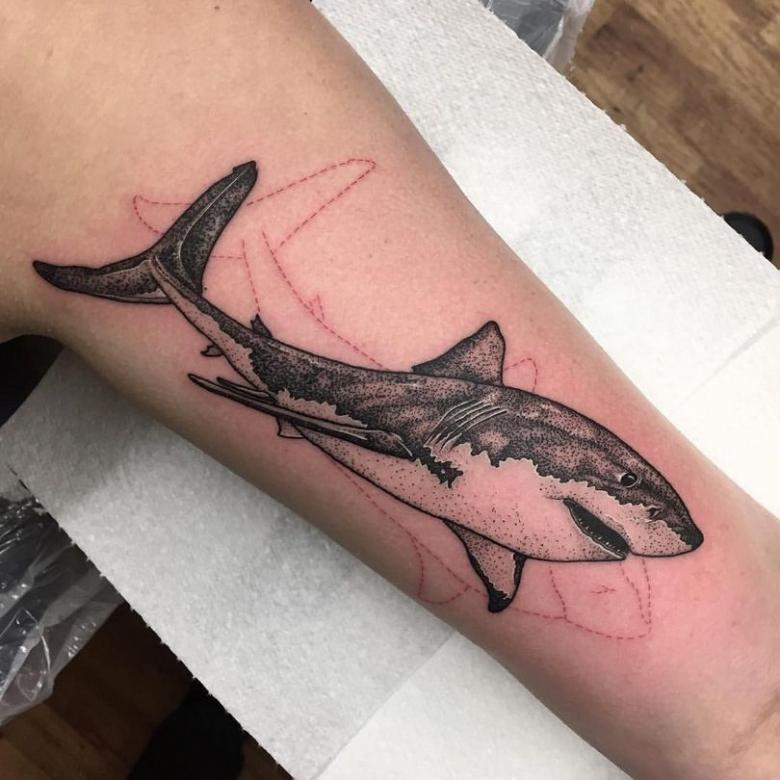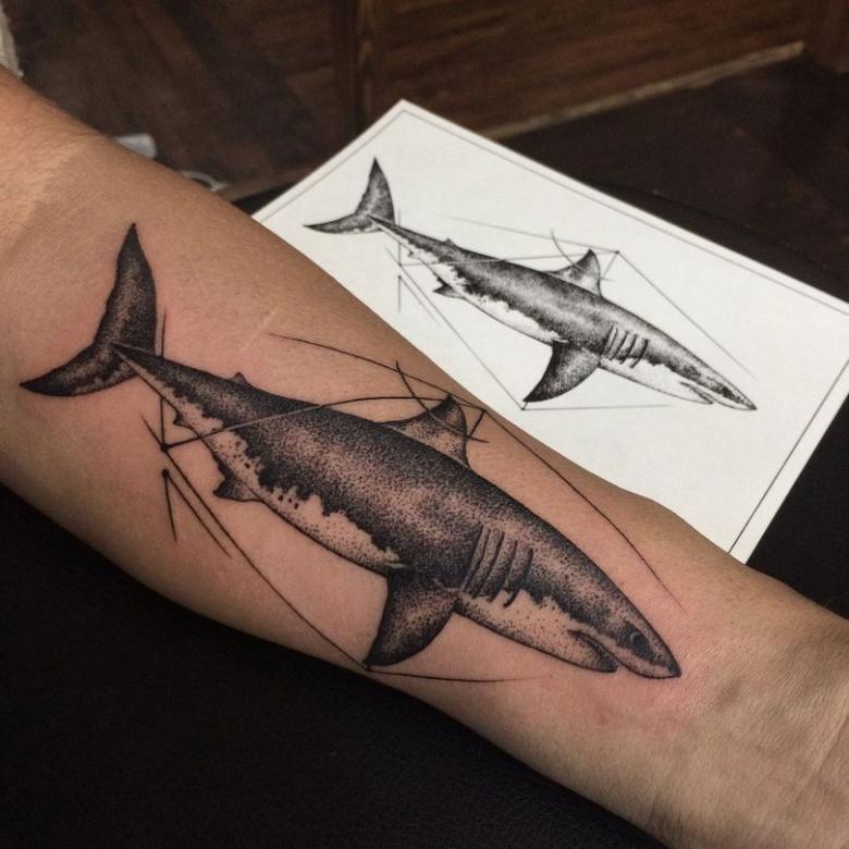 - Dotwork assure une composition sobre et propre là où le requin est utilisé. Les femmes sont plus susceptibles d'opter pour cette tendance ;