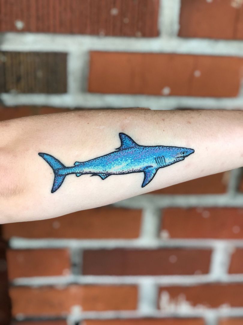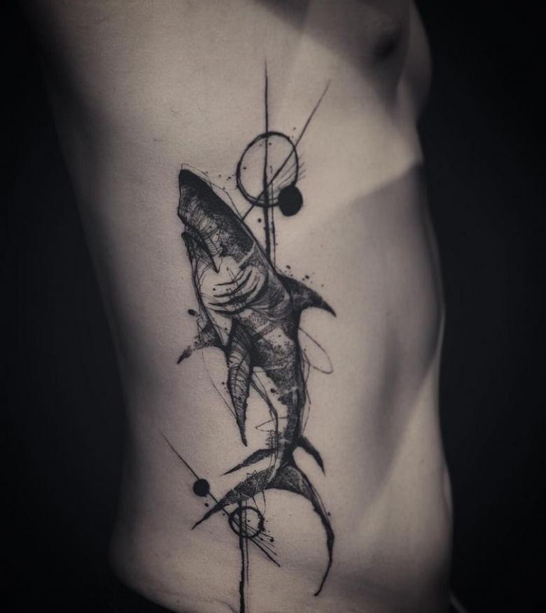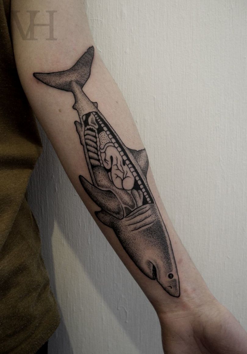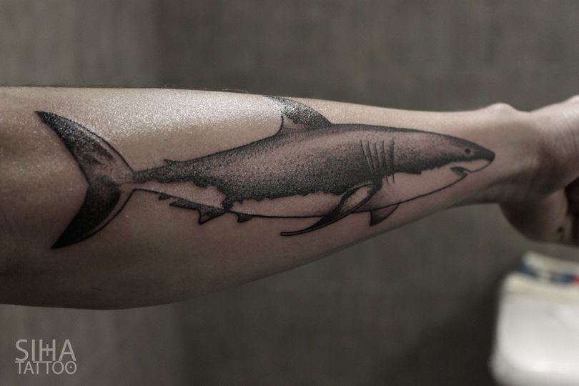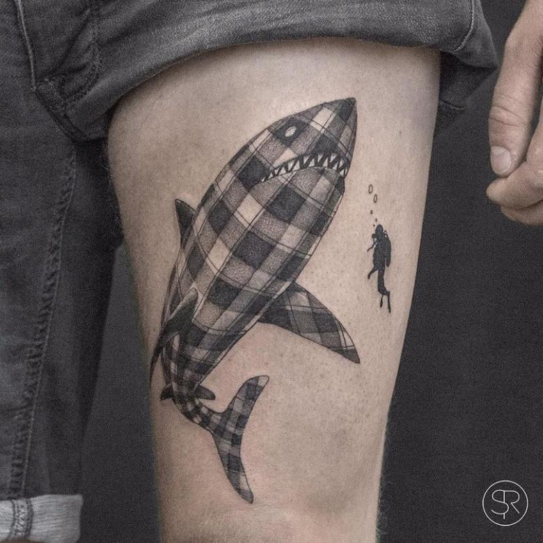- Dotwork assure une composition sobre et propre là où le requin est utilisé. Les femmes sont plus susceptibles d'opter pour cette tendance ;