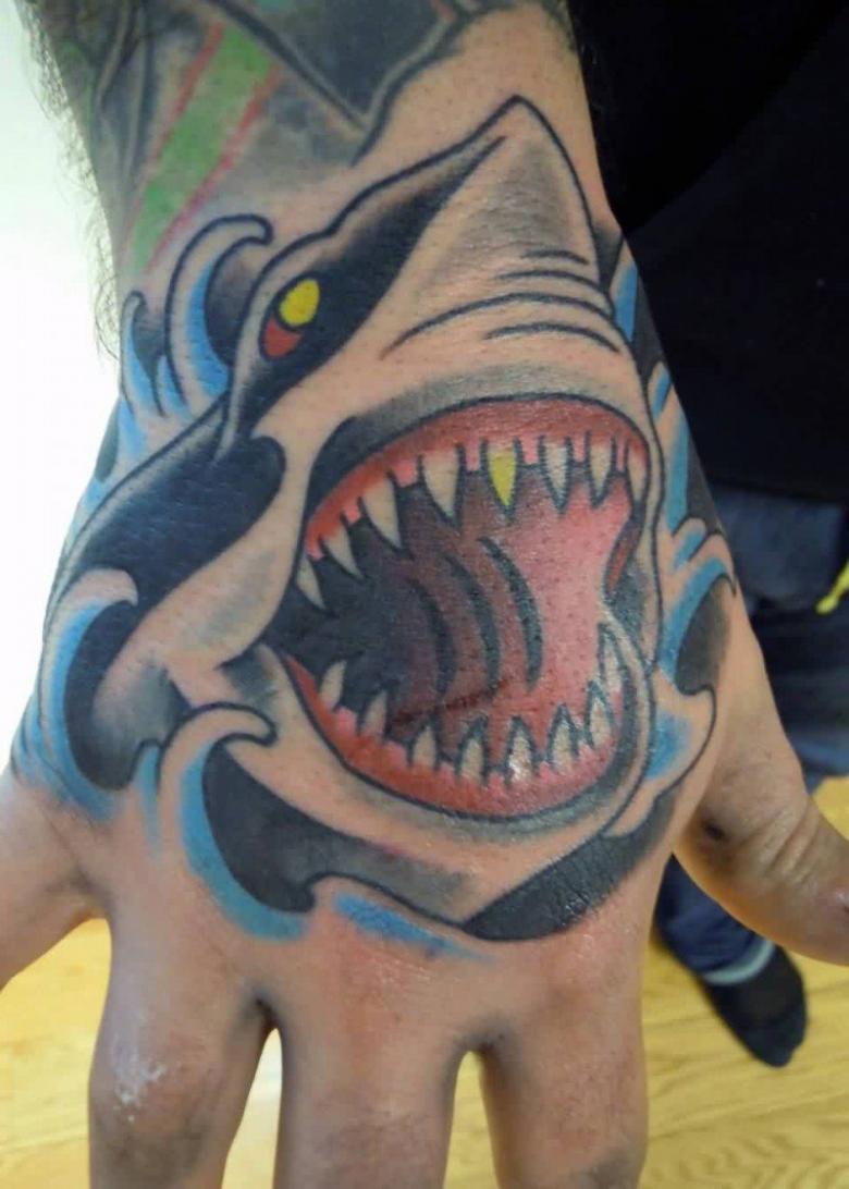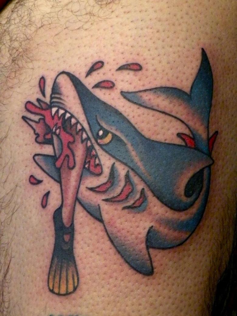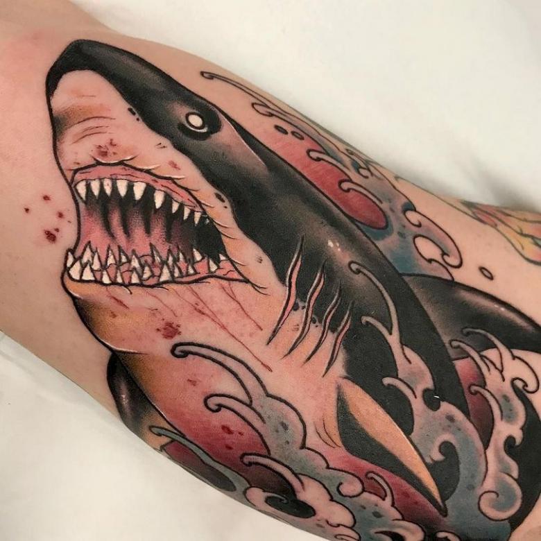 C'est un excellent exemple du symbolisme littéral du tatouage corporel de requin. Le tatouage rappelle que le requin est capable d'attaquer et de mordre douloureusement. Le porteur est enclin à une agressivité incontrôlée. Il est préférable de ne pas se laisser perturber par les diverses blagues et les comportements inappropriés, car la moindre excuse pour une réaction inappropriée suffit.