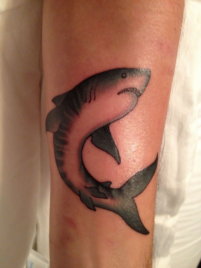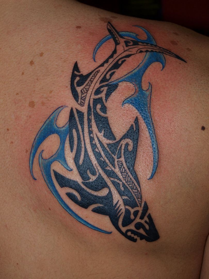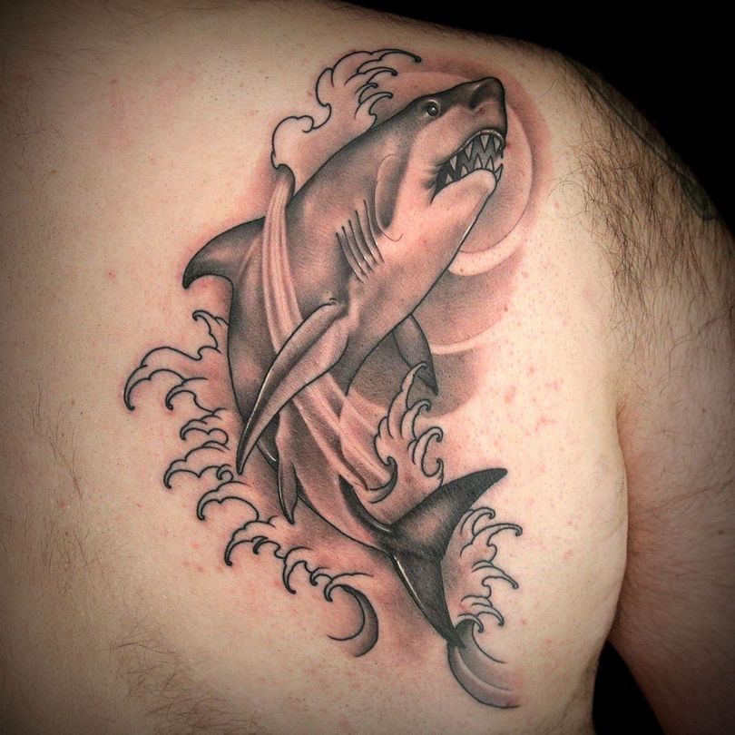 - La tendance polynésienne est similaire au style tribal. Ceci est avantageux lorsqu'un requin est appliqué sur le dos ou les épaules. L'utilisation du noir est une caractéristique distinctive ;