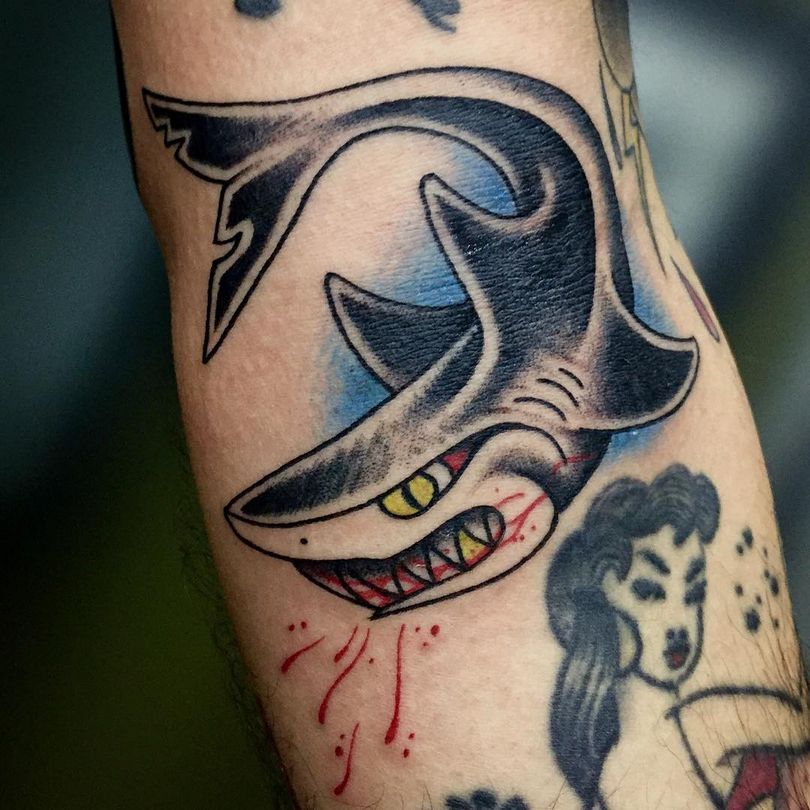Porter la photo d'un requin-marteau signifie le double symbolisme de la peur et du mystère du personnage qui le porte. Les scientifiques n'ont pas été en mesure d'étudier complètement le comportement du requin-marteau. Le prédateur est assoiffé de sang et a développé des compétences pour traquer et attaquer ses proies. Pour cette raison, elle a suscité un intérêt accru de la part des scientifiques de différents pays.