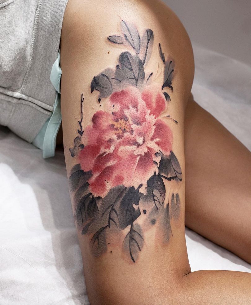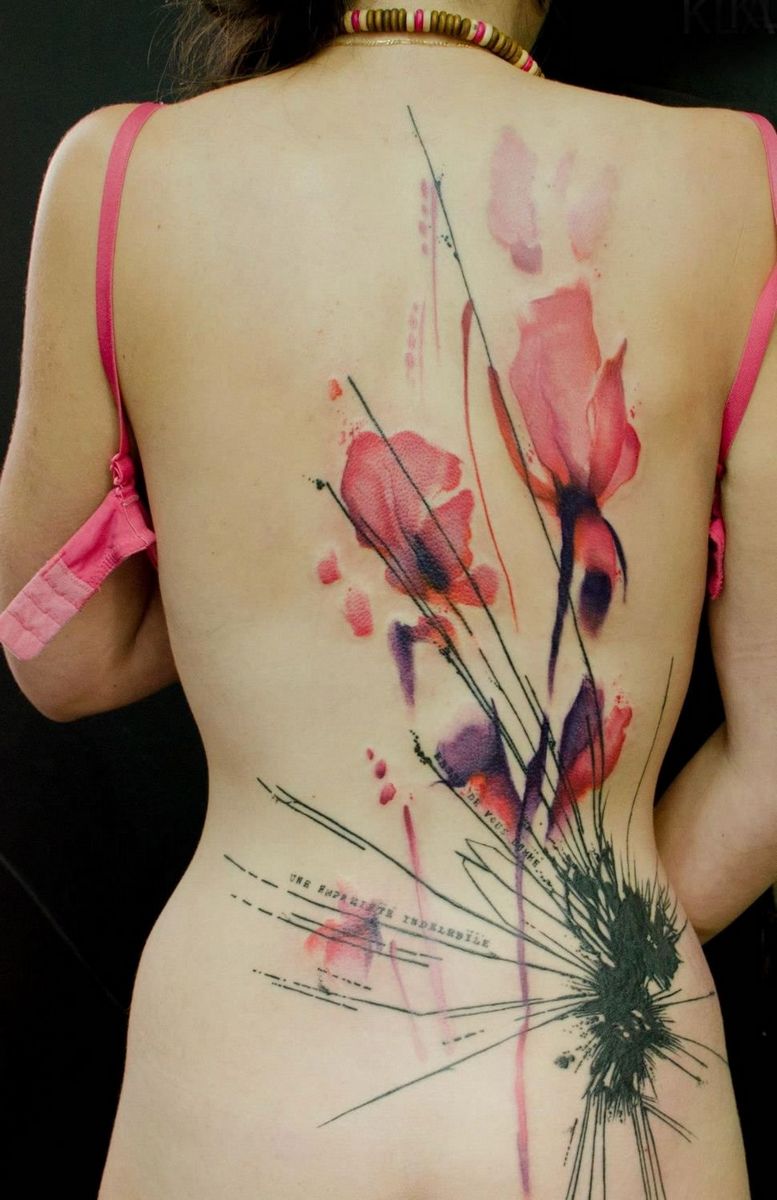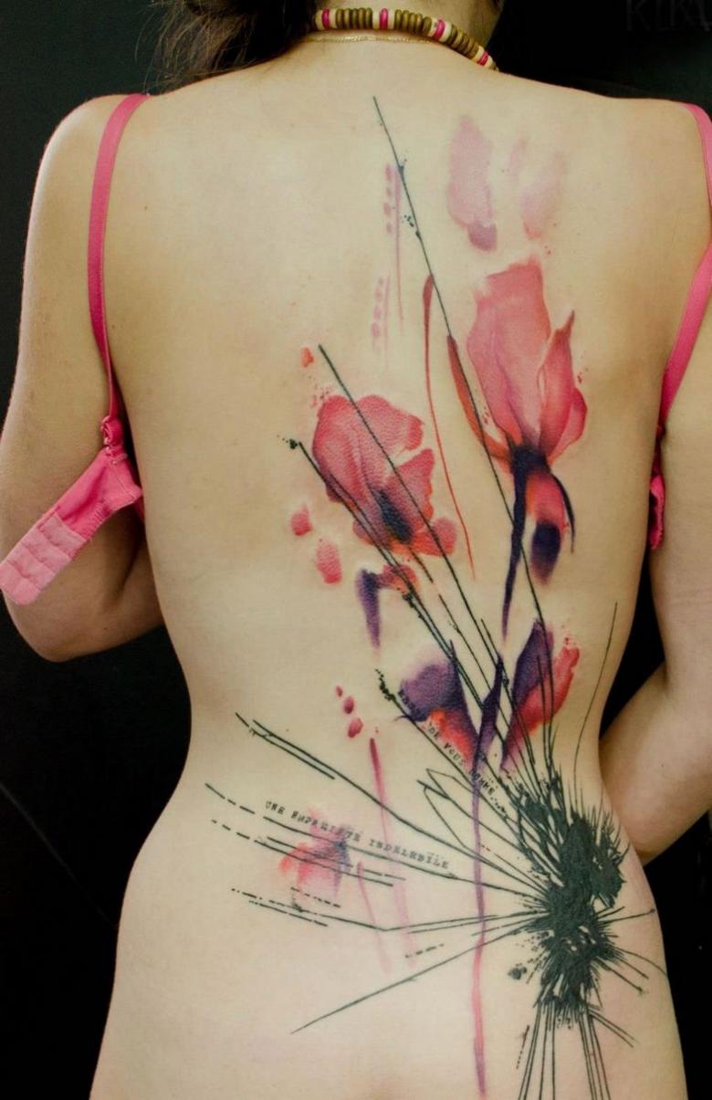 Le beau sexe choisit les tatouages à l'aquarelle pour leur légèreté et leur délicatesse. Le choix le plus courant pour les filles est le tatouage de fleurs. Les fleurs peuvent être petites ou grandes. L'art corporel abstrait est également populaire auprès d'eux.