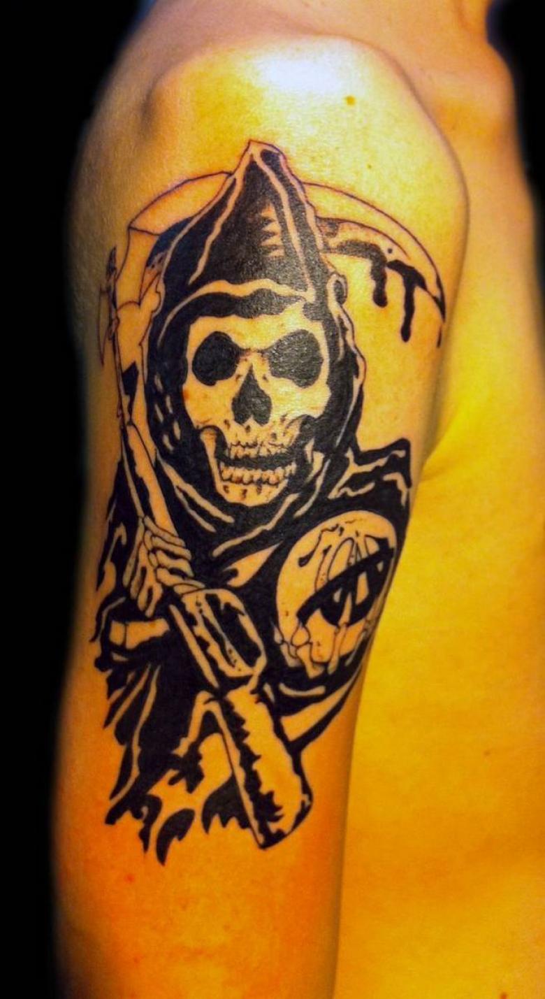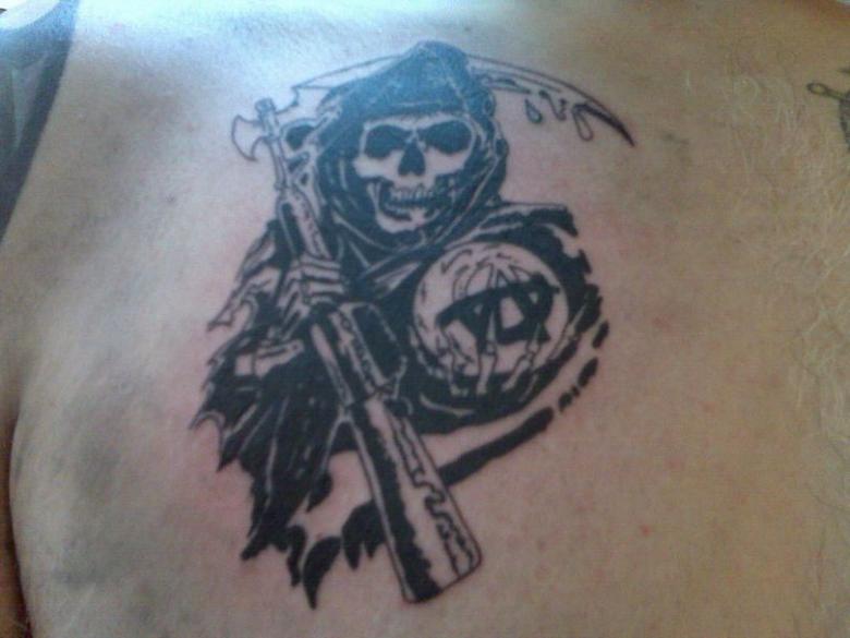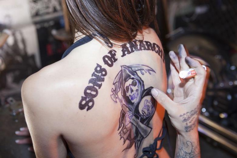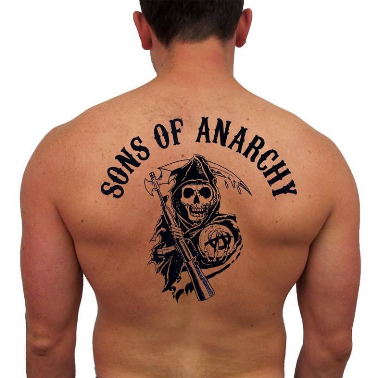 - Plus récemment encore, une tradition intéressante a vu le jour, liée aux personnages d'une série télévisée américaine populaire. Les personnages de Sons of Anarchy se sont fait faire des tatouages dans le dos. À partir de là, de nombreuses personnes ont également commencé à porter des dessins anarchistes dans le dos, et aujourd'hui, cette option est même considérée comme un classique.