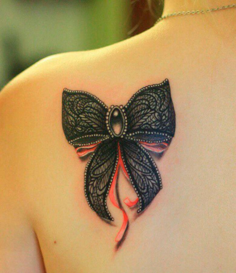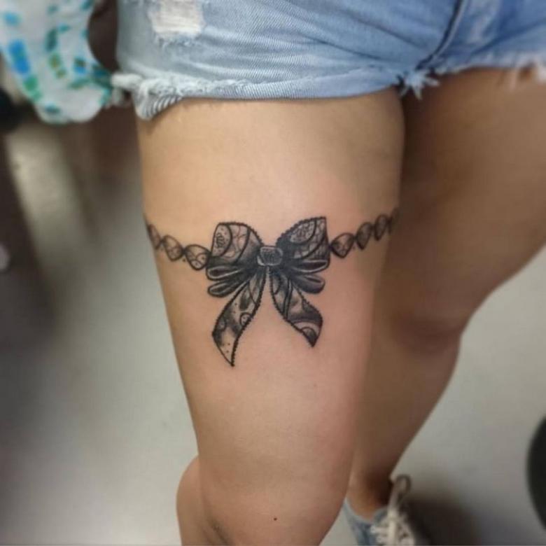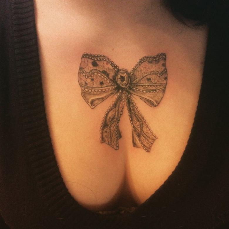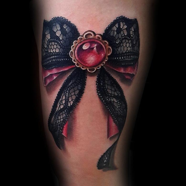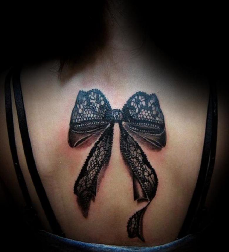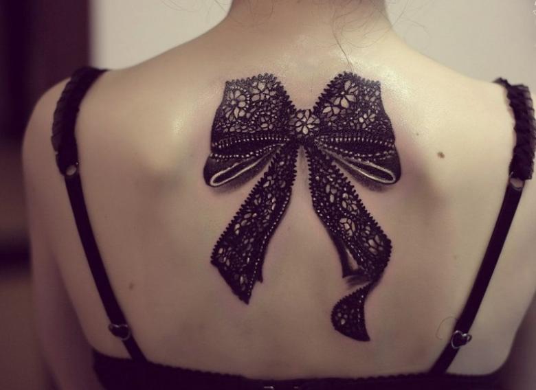 Les femmes sûres d'elles qui veulent attirer l'attention aimeront les nœuds de dentelle volumineux qui décorent la zone du décolleté, l'arrière de la jambe, les hanches, l'abdomen, la zone entre les omoplates et le bas du dos. Il est possible d'ajouter des éléments supplémentaires au motif de base : cœurs, fleurs, perles, crânes. Cela la rendra plus intéressante et plus mystérieuse.