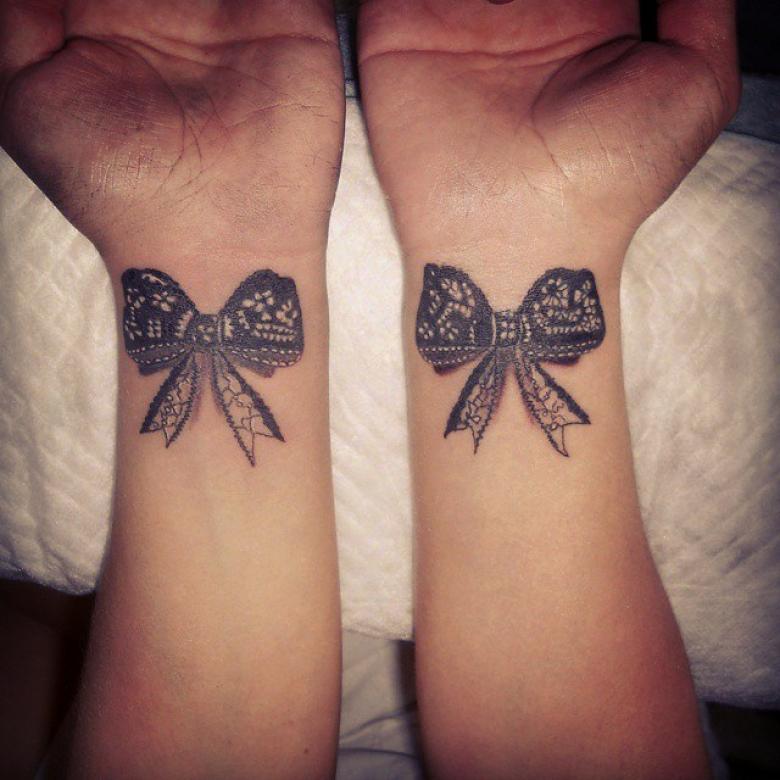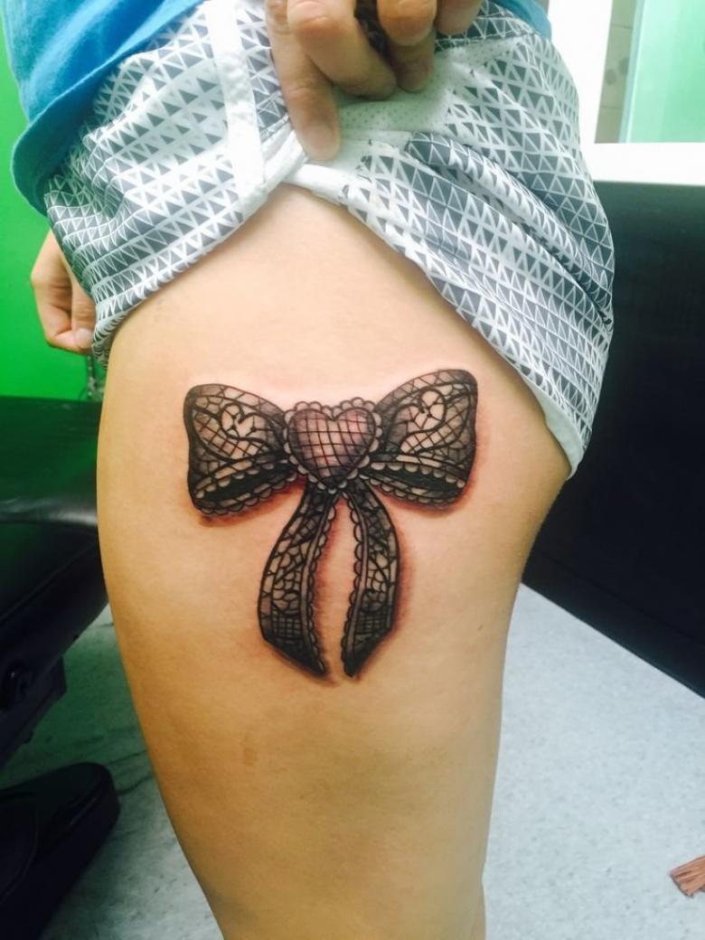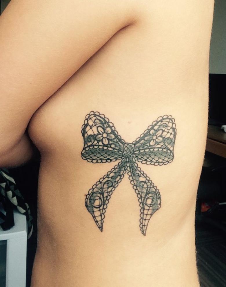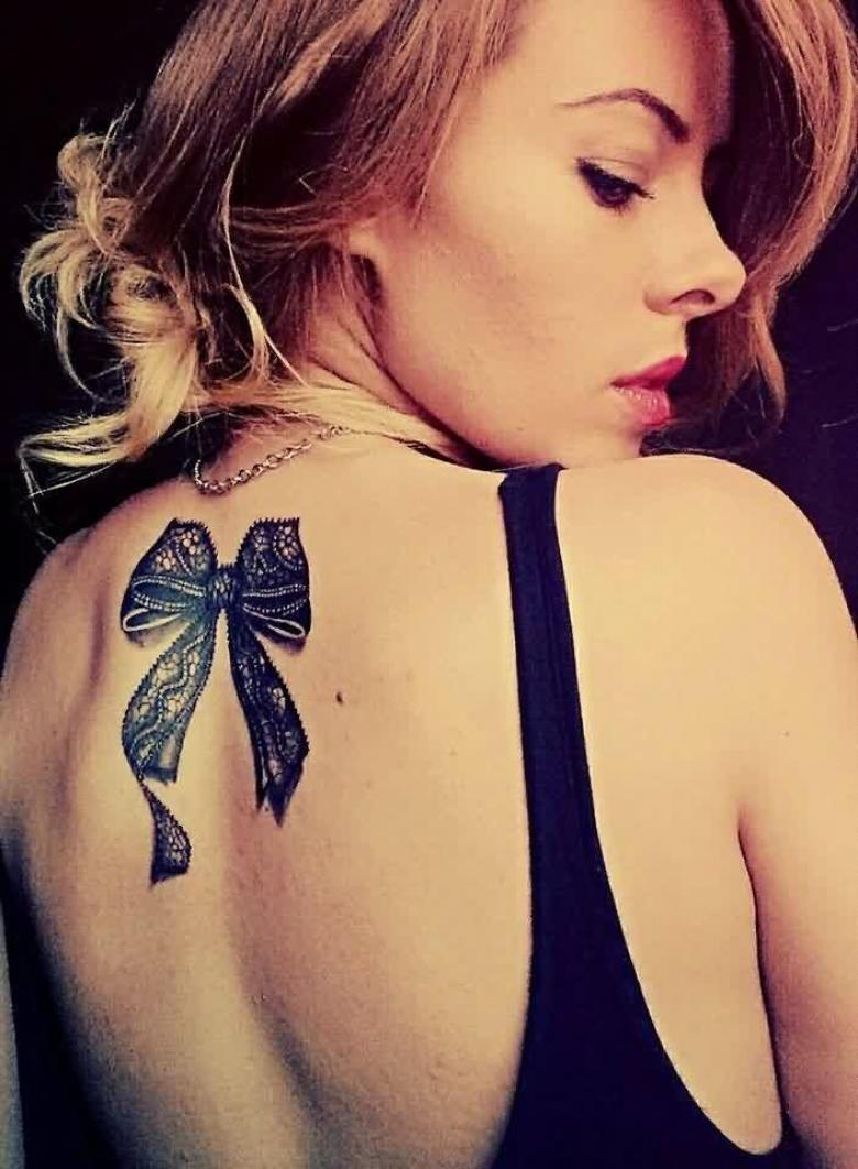 Les femmes sûres d'elles qui veulent attirer l'attention aimeront les nœuds de dentelle volumineux qui décorent la zone du décolleté, l'arrière de la jambe, les hanches, l'abdomen, la zone entre les omoplates et le bas du dos. Il est possible d'ajouter des éléments supplémentaires au motif de base : cœurs, fleurs, perles, crânes. Cela la rendra plus intéressante et plus mystérieuse.