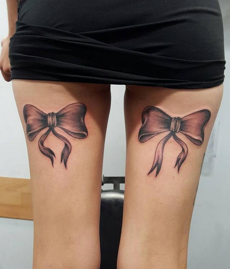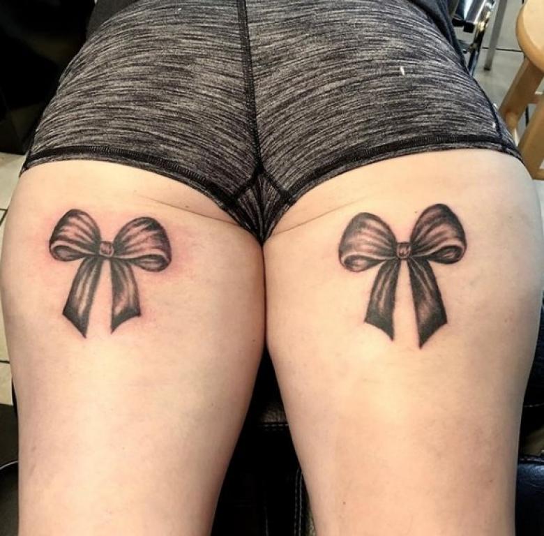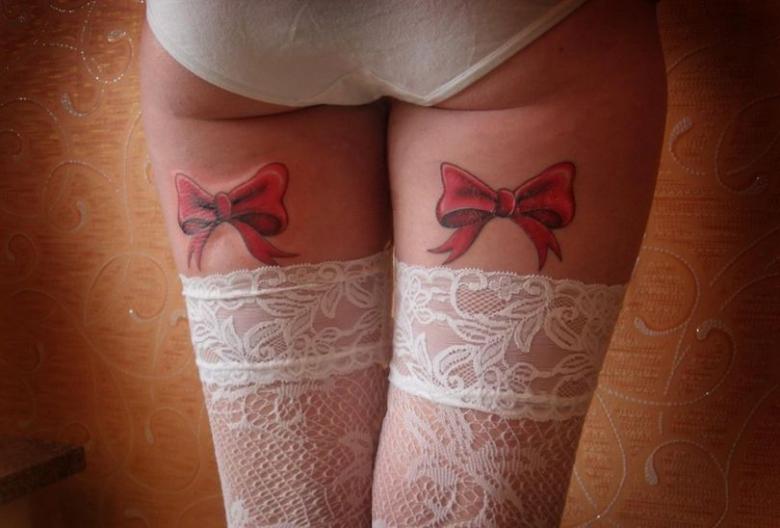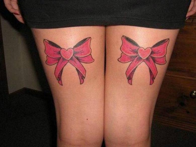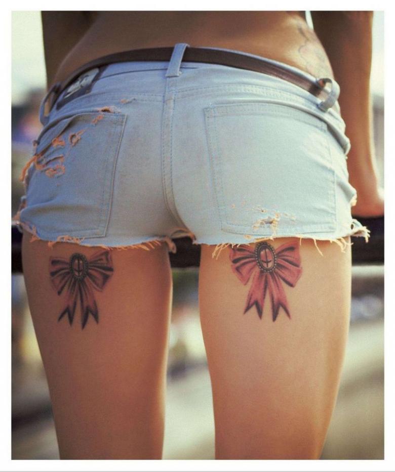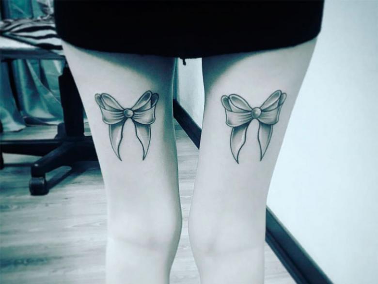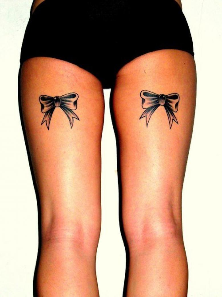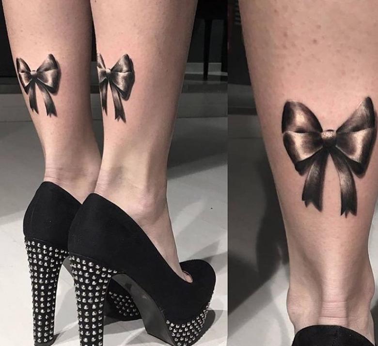 Tattoo bow - les sites d'application sur les jambes sur le côté ou le dos, les chevilles, les hanches, les cuisses, les cuisses, des croquis amusants et des photos