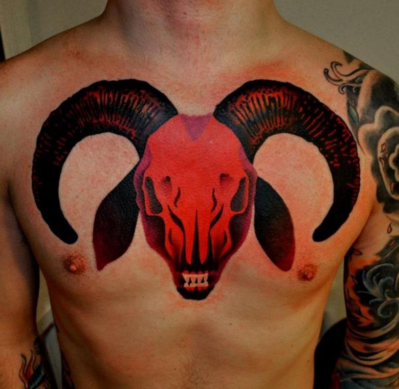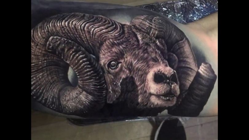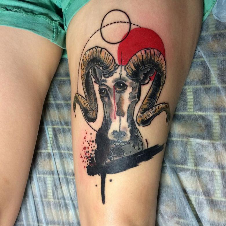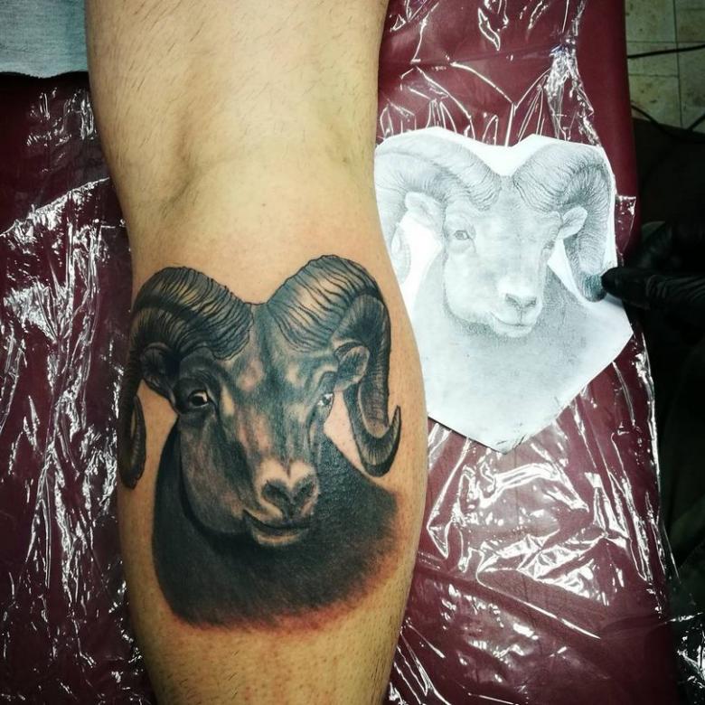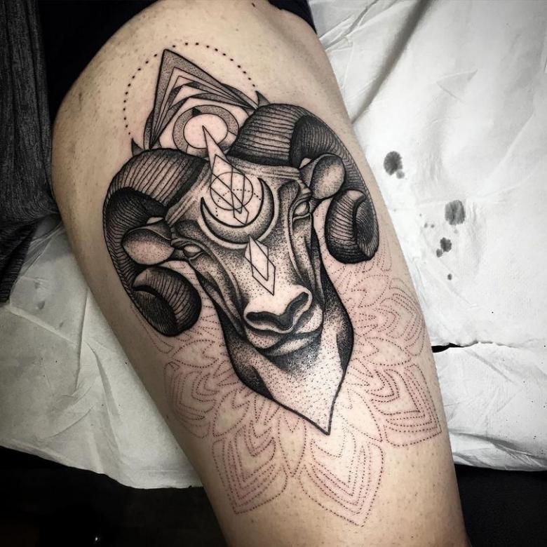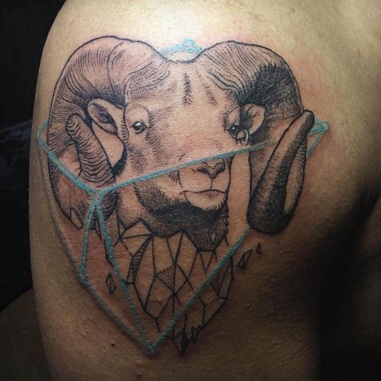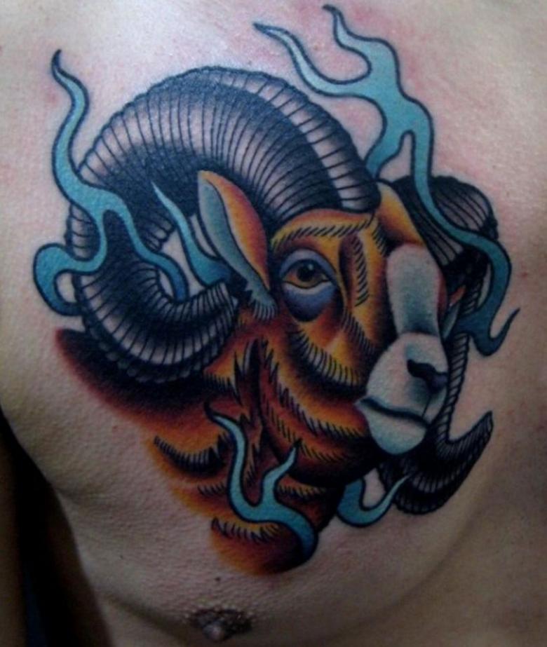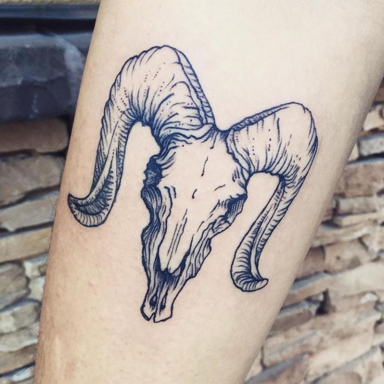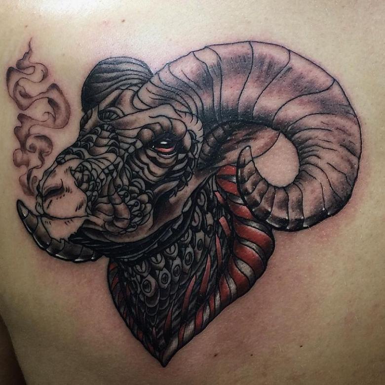 Souvent, le croquis d'un mouton est choisi de manière à ce que seule la tête soit dessinée, et non la tête entière du mouton. En fait, c'est une solution réussie, que ce soit la tête ou le crâne, le design est coloré et imposant. Tout cela est dû à la forme de la tête elle-même et aux cornes. Un emplacement approprié pour un tatouage à grande échelle serait la poitrine ou le dos. N'importe quelle couleur peut être choisie, mais généralement le tatouage de la tête de bélier est réalisé dans des couleurs sombres avec l'ajout d'une ou deux couleurs et exécuté dans le style "réalisme".