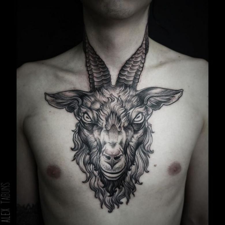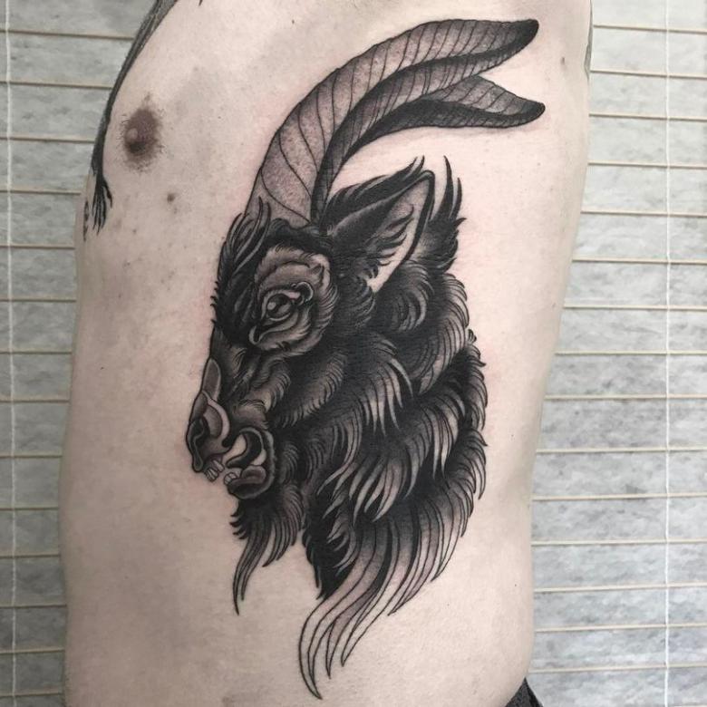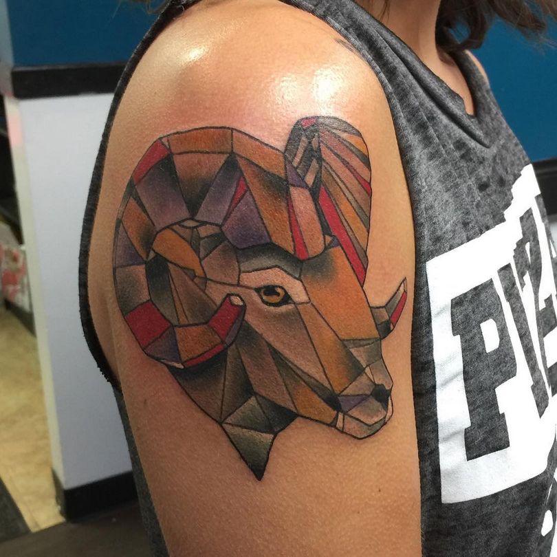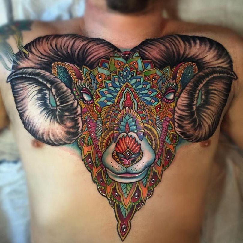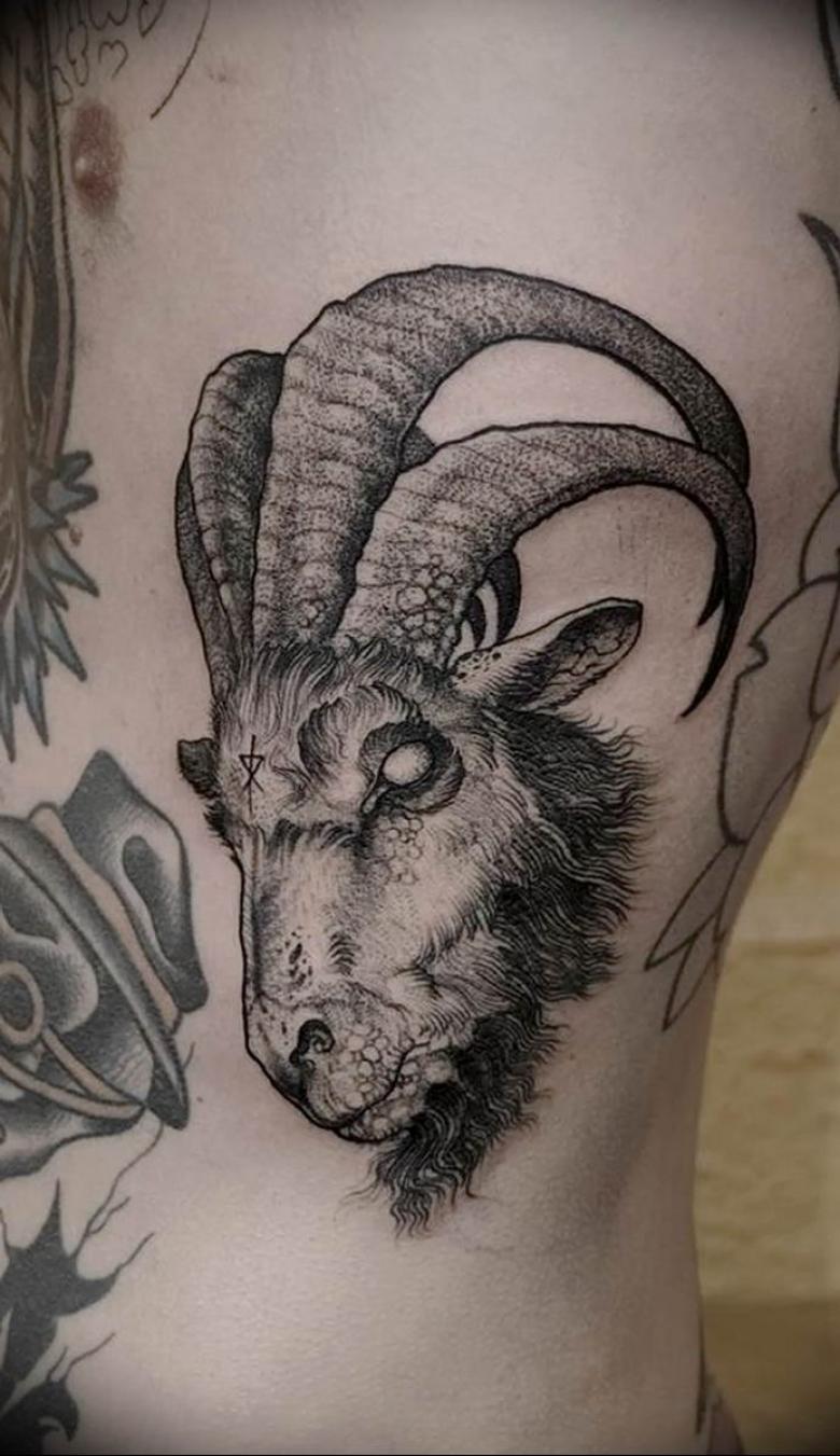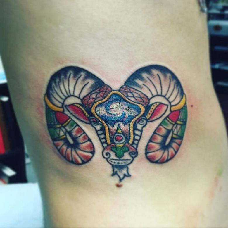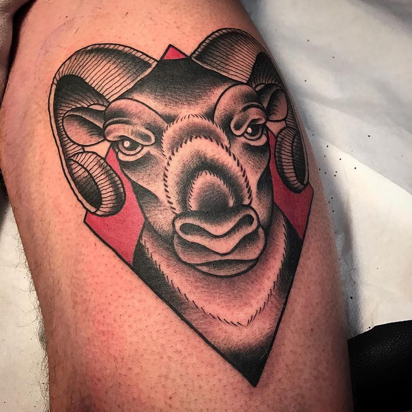 Souvent, le croquis d'un mouton est choisi de manière à ce que seule la tête soit dessinée, et non la tête entière du mouton. En fait, c'est une solution réussie, que ce soit la tête ou le crâne, le design est coloré et imposant. Tout cela est dû à la forme de la tête elle-même et aux cornes. Un emplacement approprié pour un tatouage à grande échelle serait la poitrine ou le dos. N'importe quelle couleur peut être choisie, mais généralement le tatouage de la tête de bélier est réalisé dans des couleurs sombres avec l'ajout d'une ou deux couleurs et exécuté dans le style "réalisme".