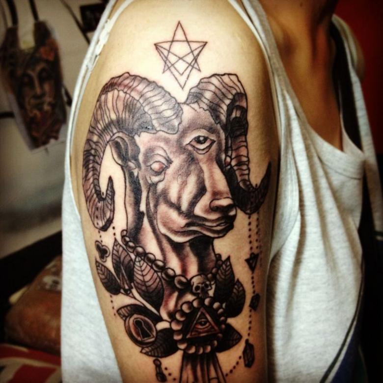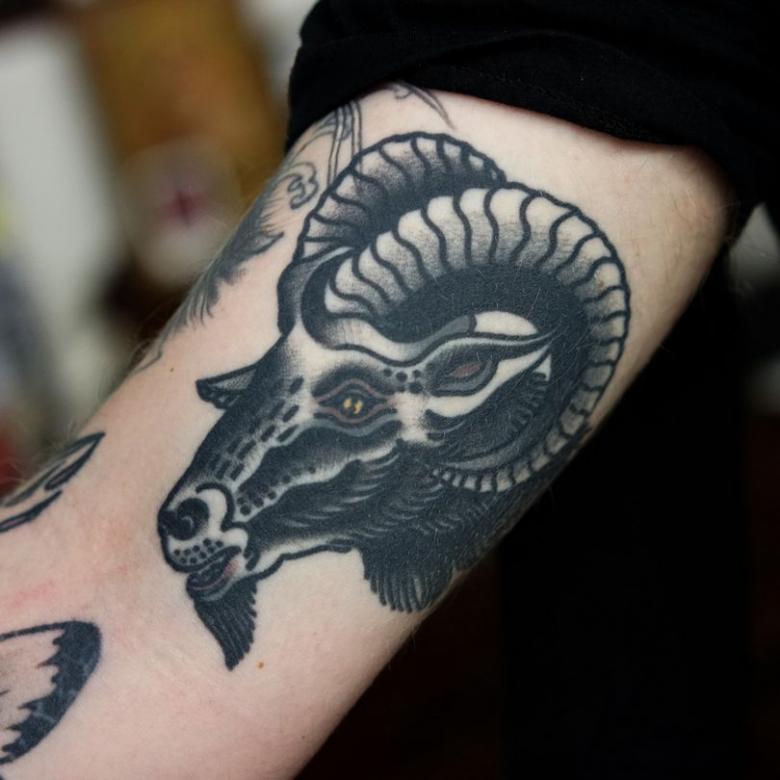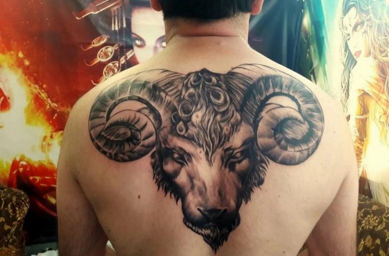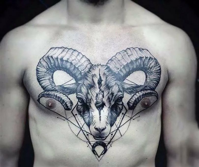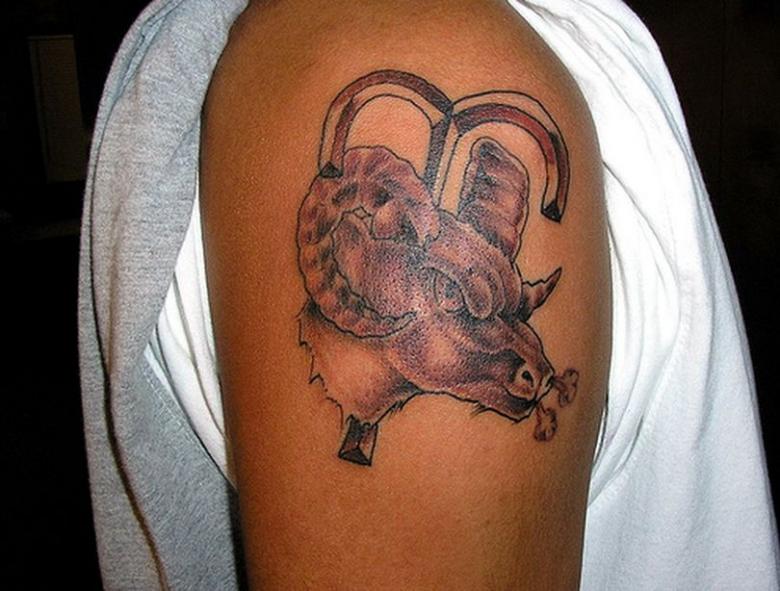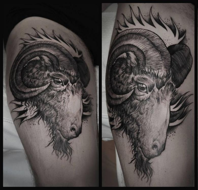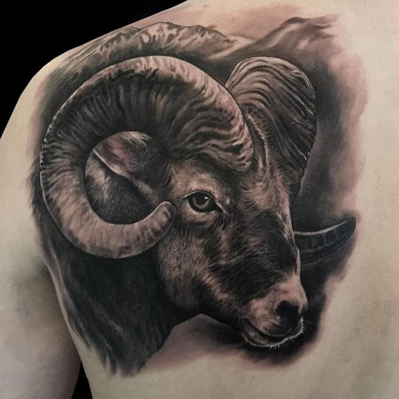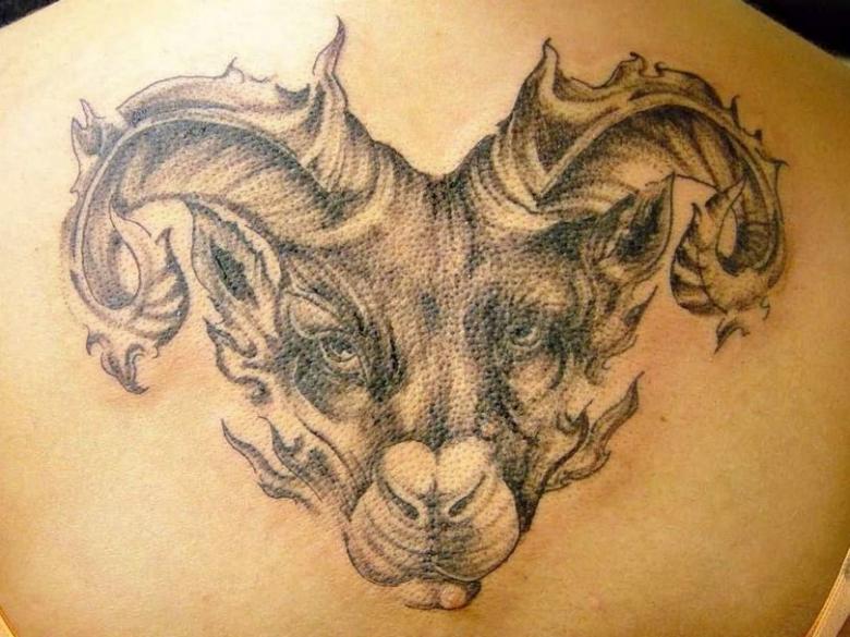 Sur les épaules et les avant-bras, faites une tête de bélier noire et blanche. Sur ces sites, le tatouage semble intéressant. Sélectionnez le style "point-work", "réalisme" ou "graphique".