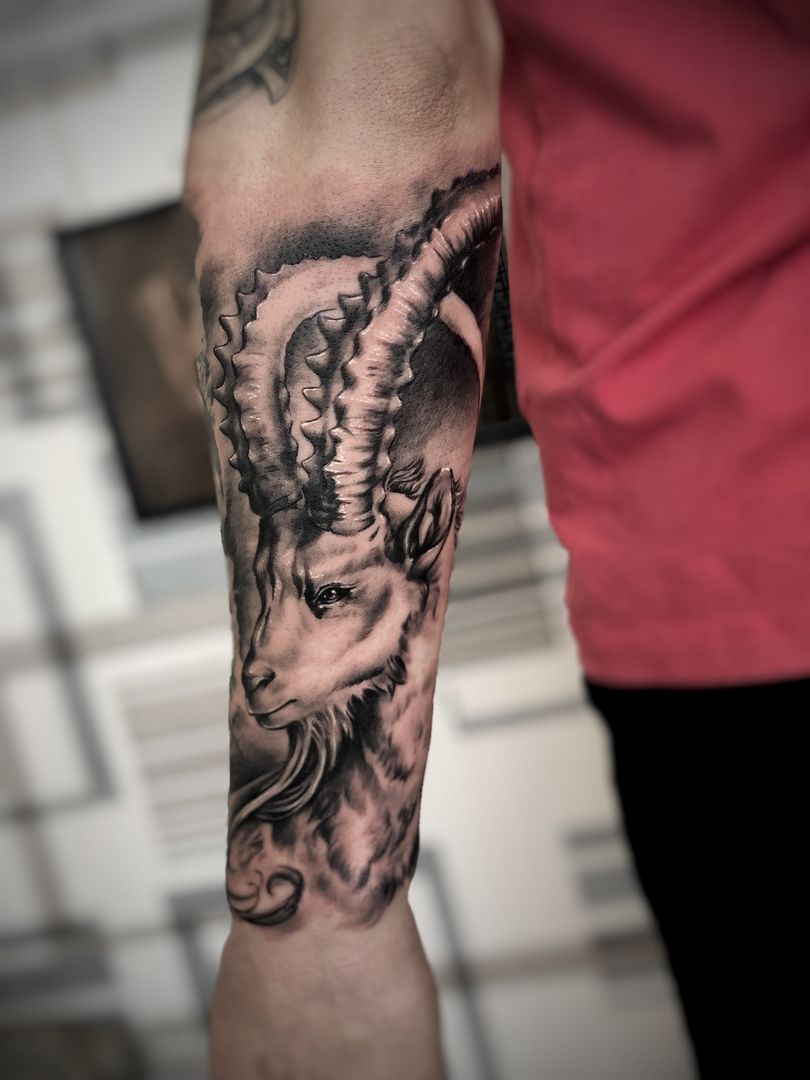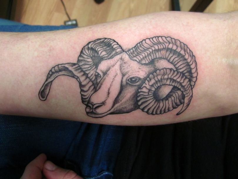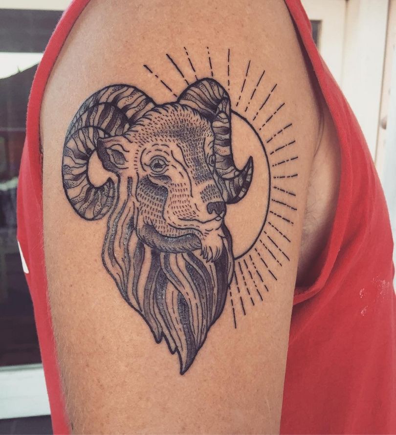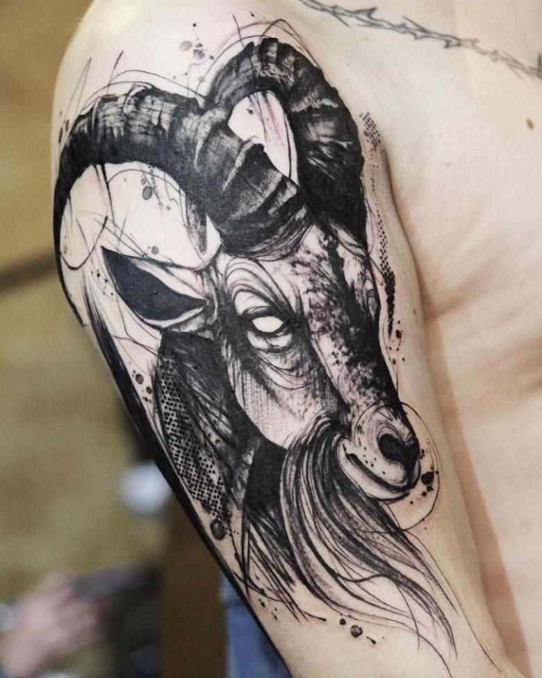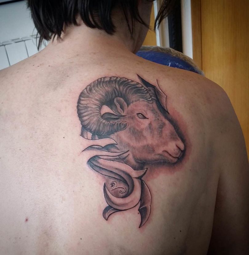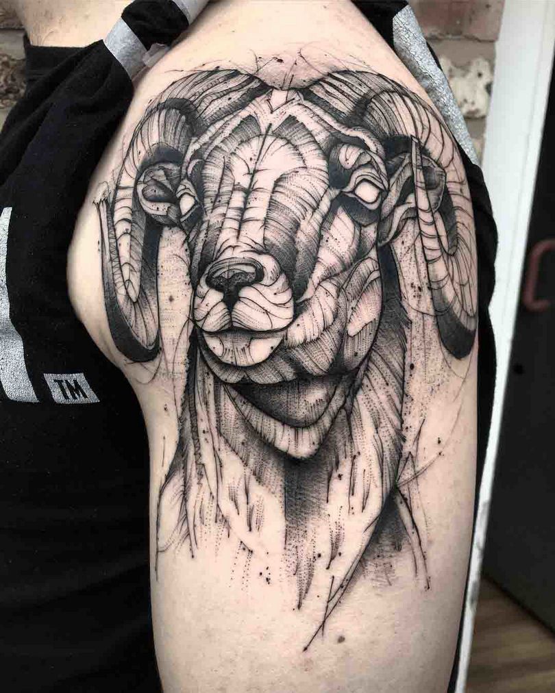 Sur les épaules et les avant-bras, faites une tête de bélier noire et blanche. Sur ces sites, le tatouage semble intéressant. Sélectionnez le style "point-work", "réalisme" ou "graphique".