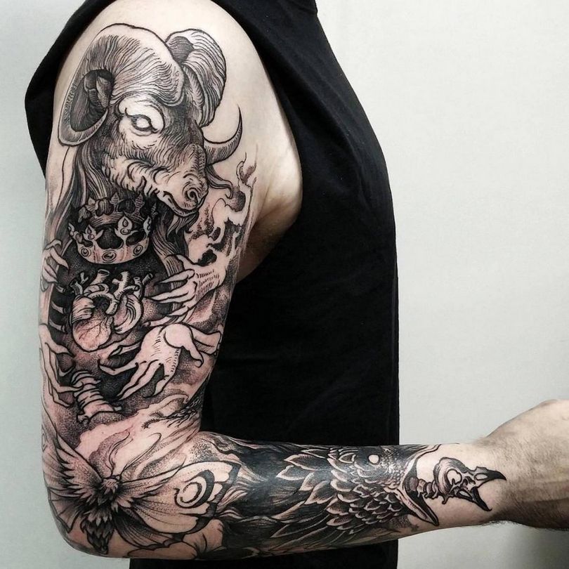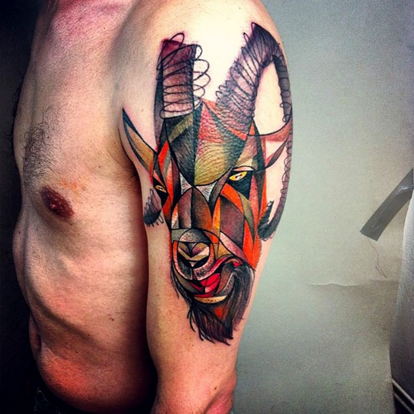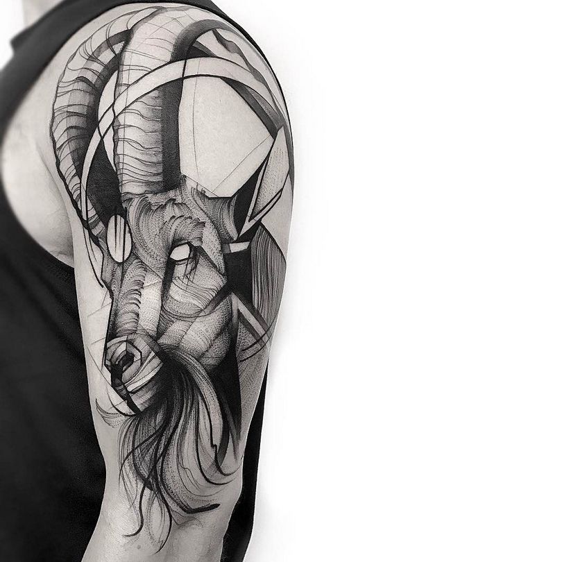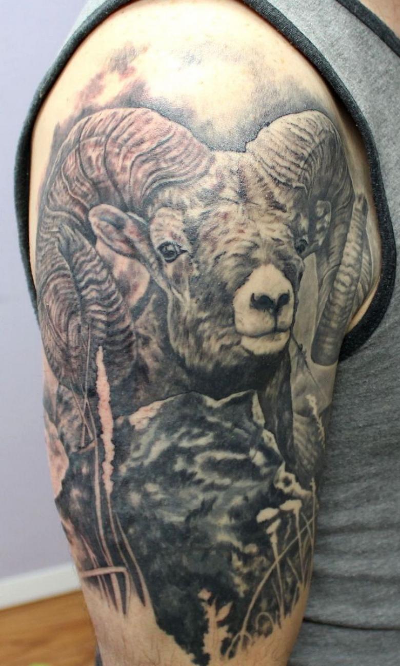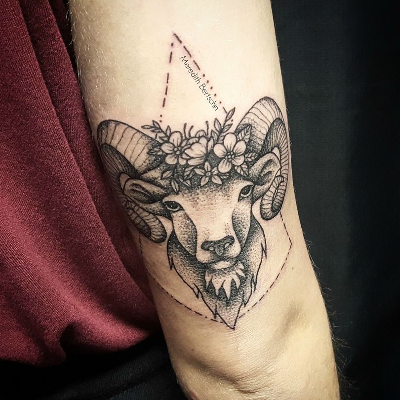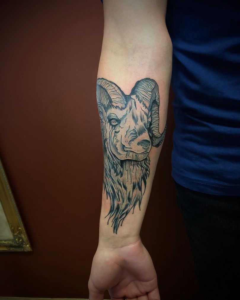 Sur les épaules et les avant-bras, faites une tête de bélier noire et blanche. Sur ces sites, le tatouage semble intéressant. Sélectionnez le style "point-work", "réalisme" ou "graphique".