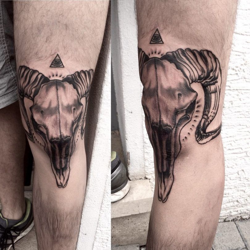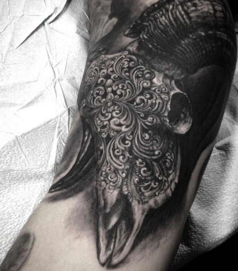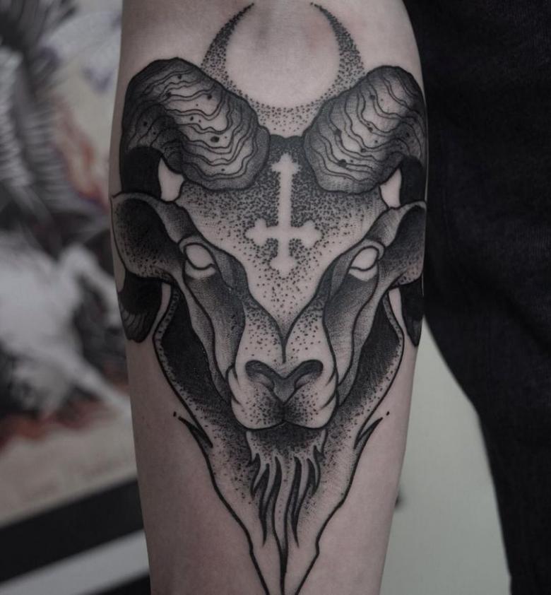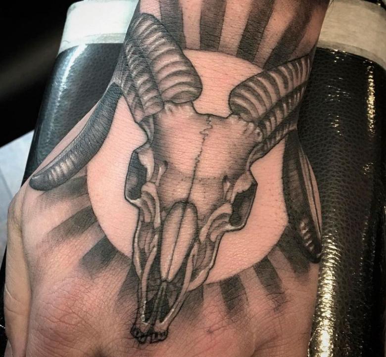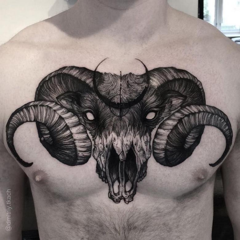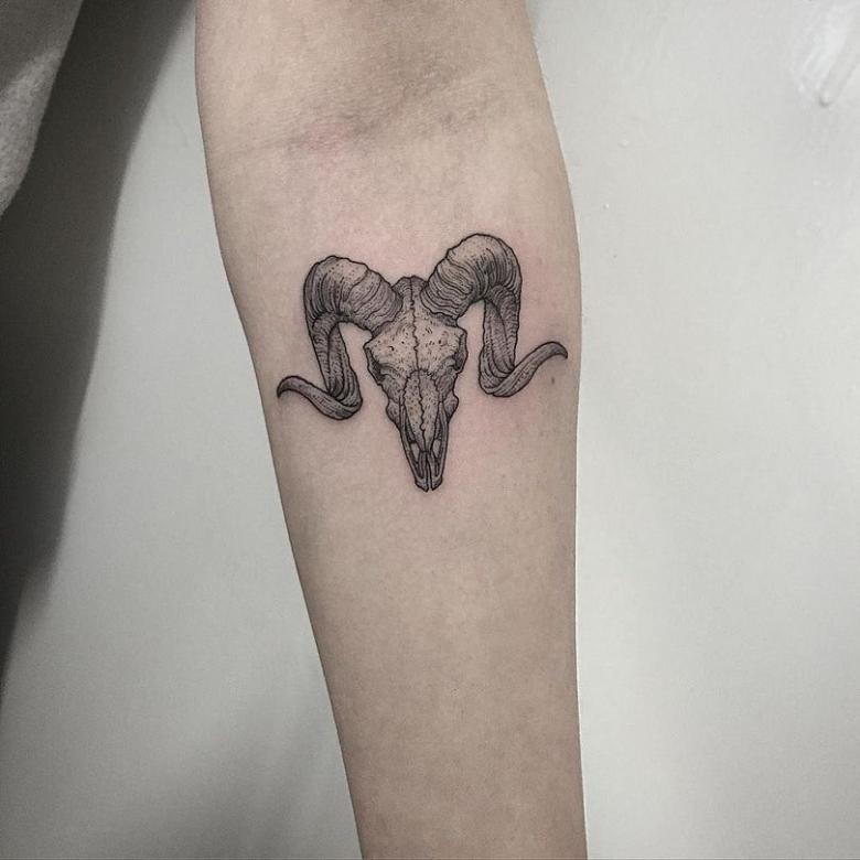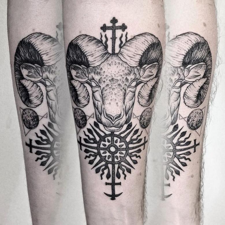 Le crâne est considéré comme un symbole du monde souterrain et le crâne de bélier est considéré comme un symbole des attributs démoniaques et des forces de l'autre monde. Le tatouage du crâne de bélier peut être comparé au tatouage du crâne de chèvre. Ce sont des symboles de Satan. Les crânes de ces animaux apparaissent dans les communautés occultes. On peut les voir en personne ou les photographier avec les crânes de ces animaux sur divers objets ou vêtements informels.