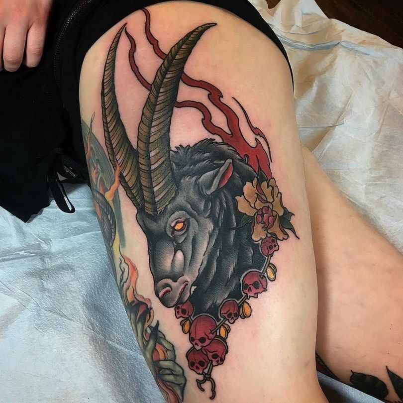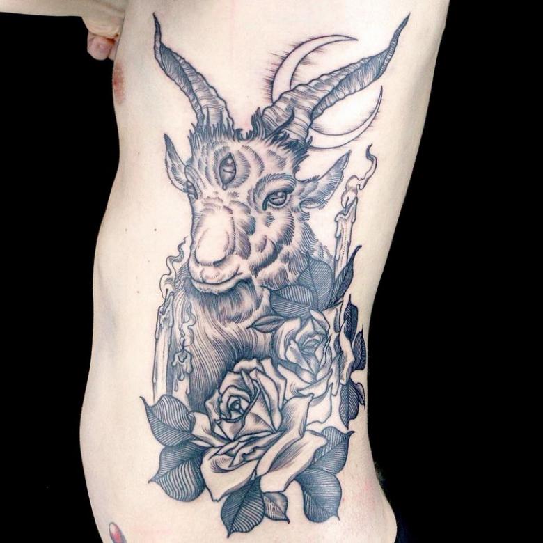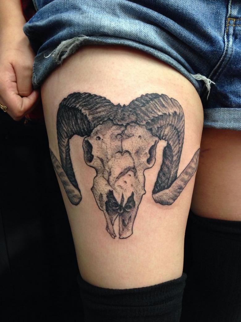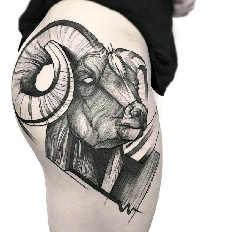 Les filles peuvent se faire tatouer une jolie tête de mouton ou un crâne sur la hanche. L'esquisse choisie peut être complétée par des roses ou un paysage en remplissant le fond avec de la couleur. Le style peut être varié.