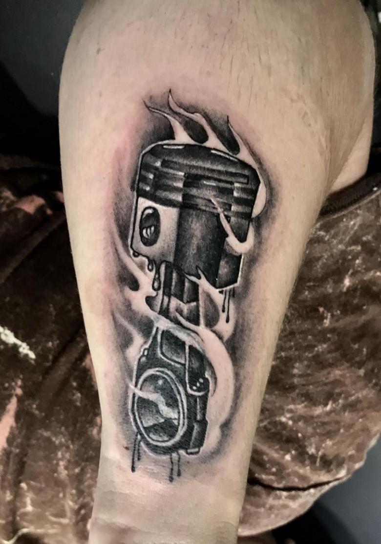- L'image d'un piston signifie l'amour de la grande vitesse de la moto. Le motard l'utilise intentionnellement à la limite.
