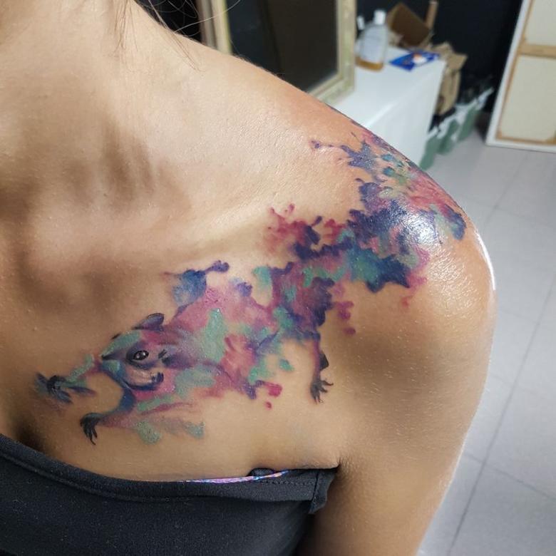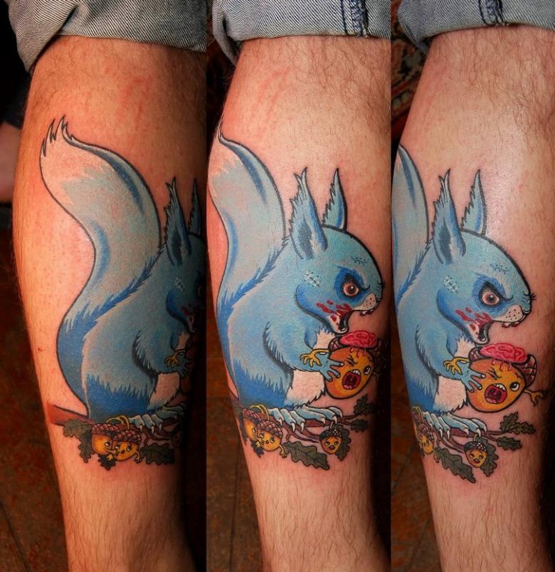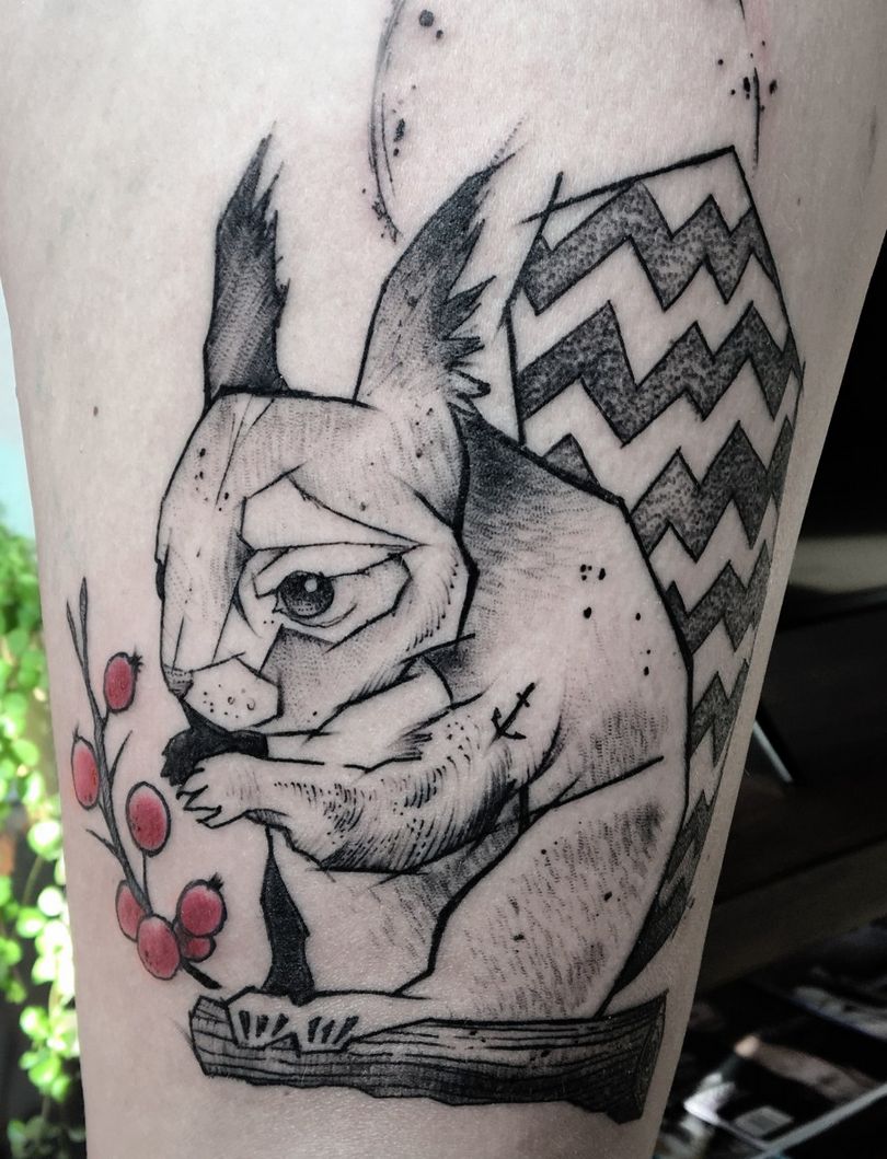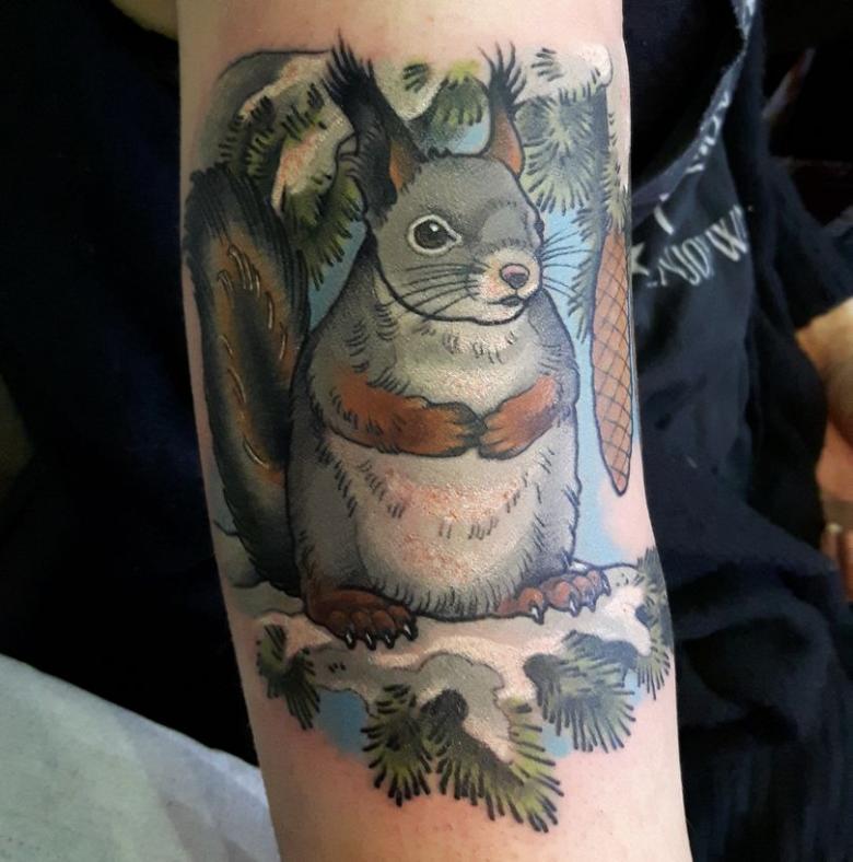 - Les caractéristiques brutes et inachevées du style Art Brut étaient généralement utilisées par des tatoueurs inexpérimentés. Mais par la suite, cette variante s'est transformée en une tendance à part entière capable de véhiculer l'image d'un écureuil de manière charmante. Bien que beaucoup n'aiment pas la qualité de ce tatouage et ne sont pas enclins à le considérer comme bon et acceptable pour un usage personnel ;