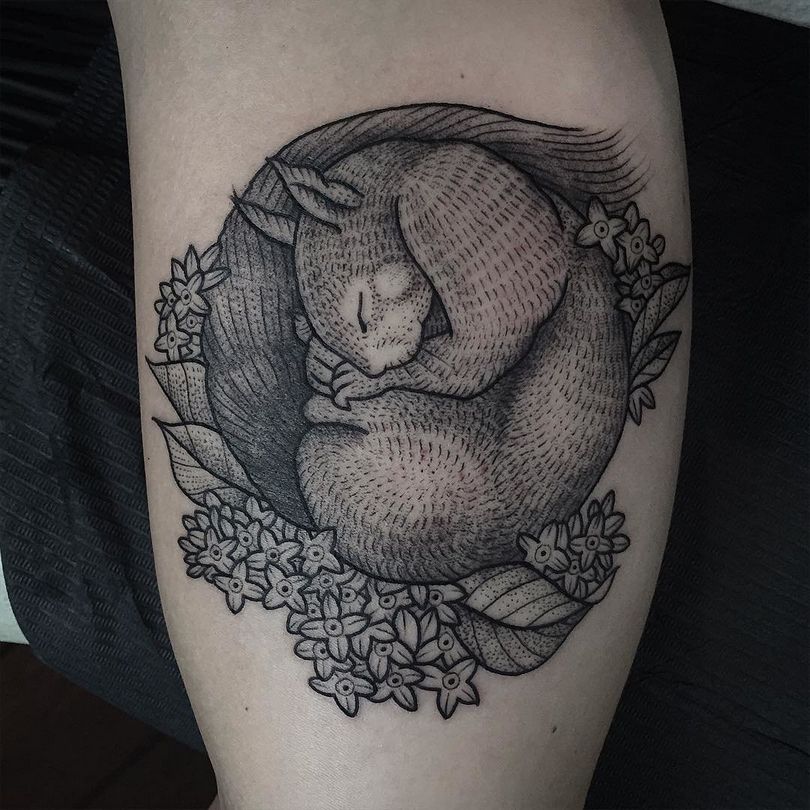 - Le Linework est considéré comme une ramification du Dotwork, mais il permet de transmettre parfaitement l'image d'un écureuil sur la peau en exploitant l'image linéaire du motif.
