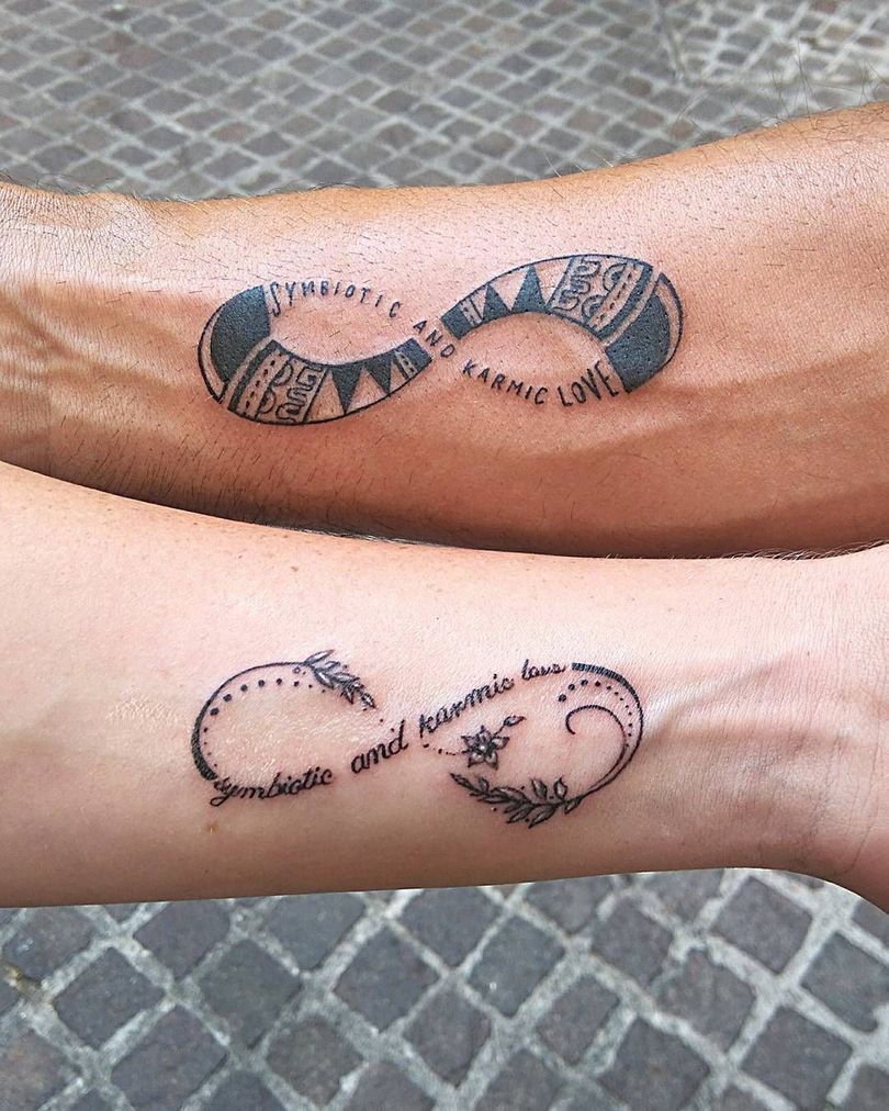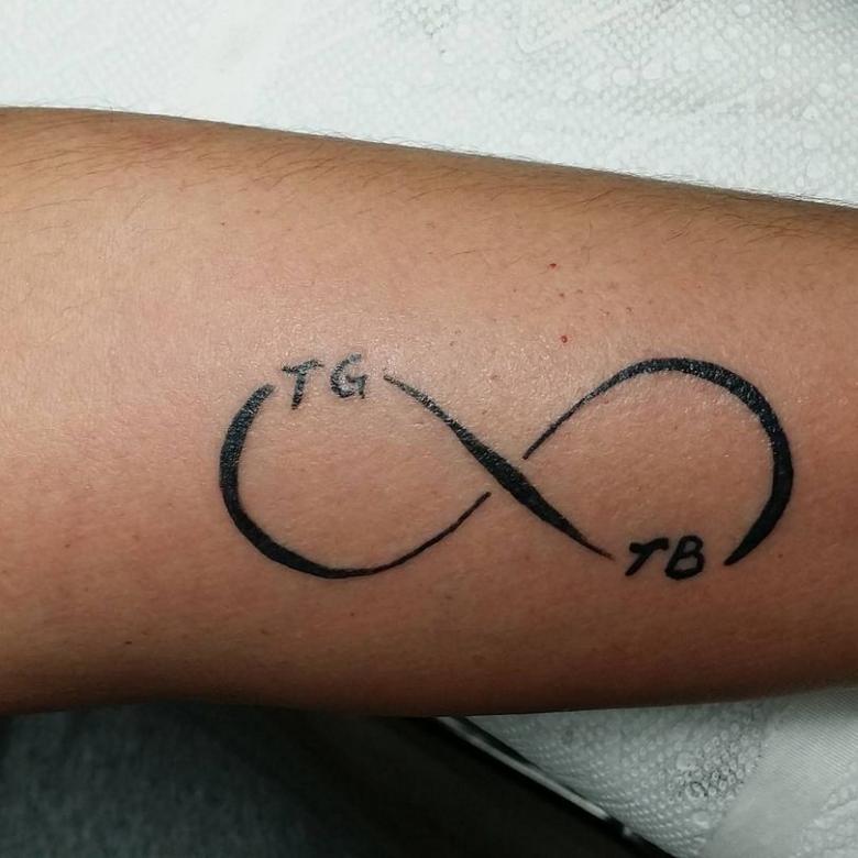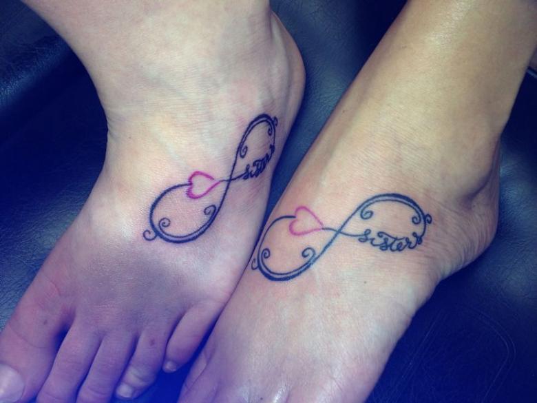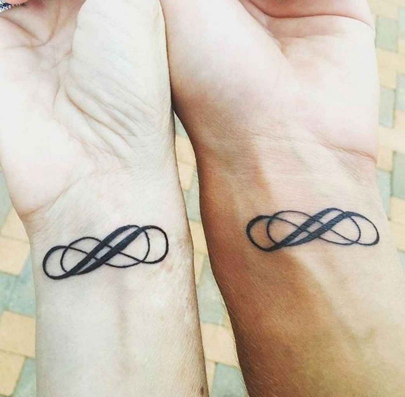 - Paire de "figures de huit". L'éternité des sentiments et l'infinité de l'attachement des amoureux l'un envers l'autre sont ainsi symbolisés. Souvent, le tatouage jumelé est complété par les noms des amoureux.