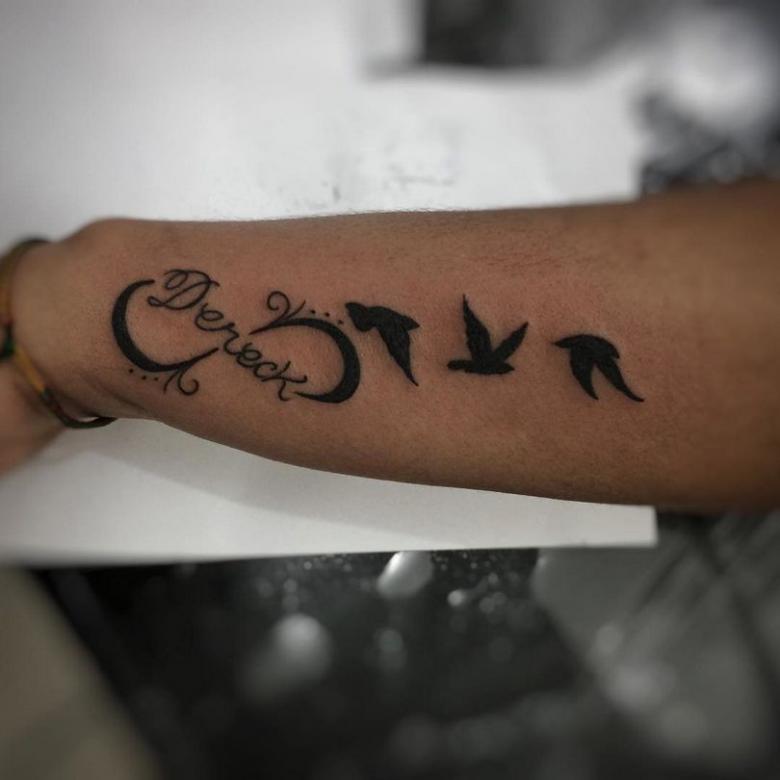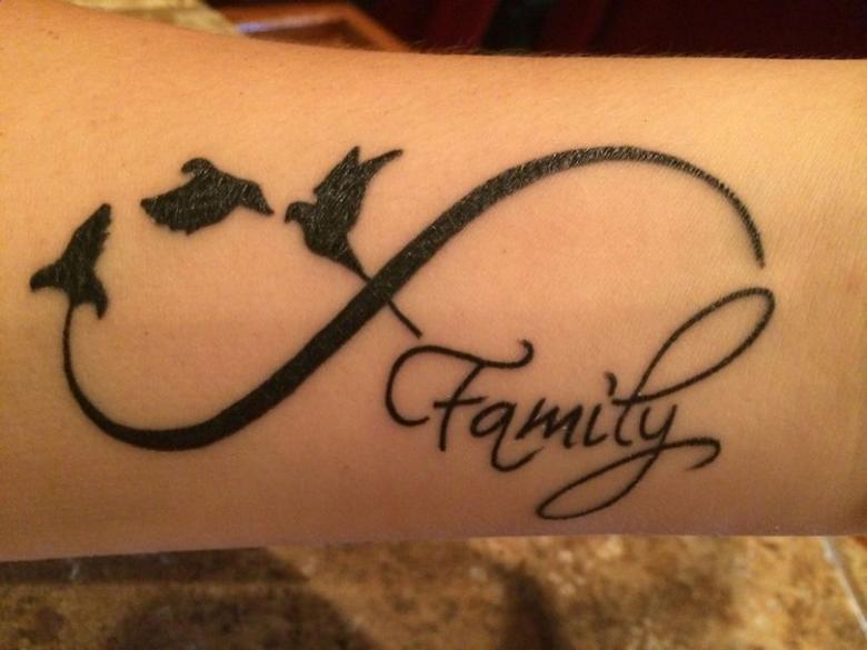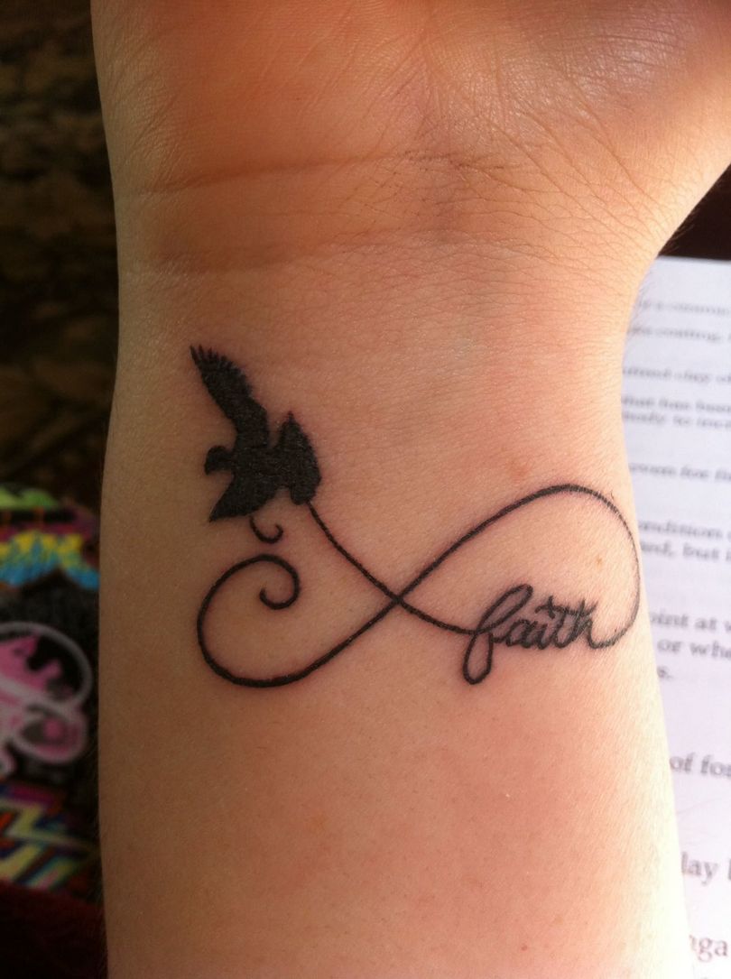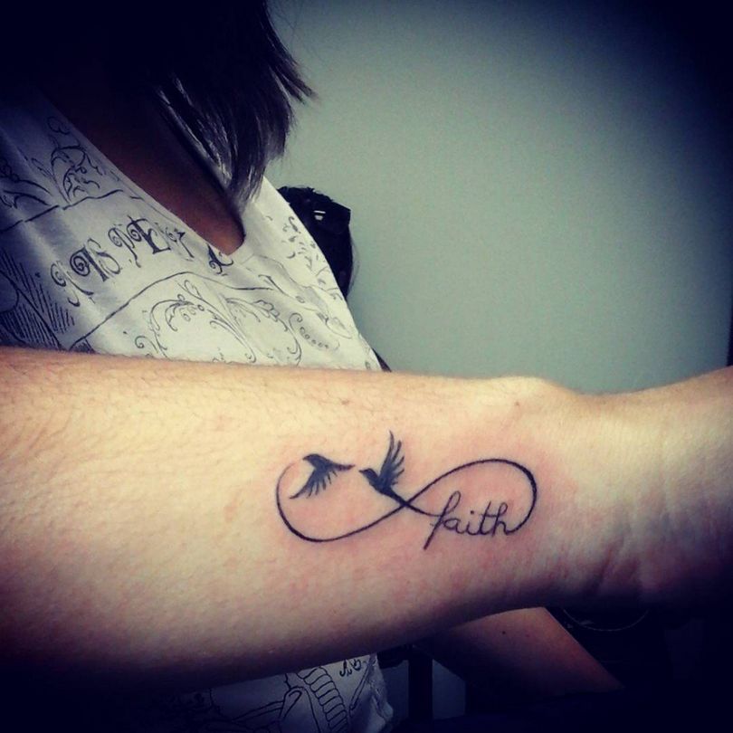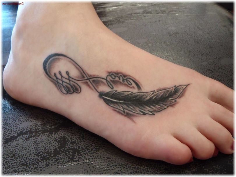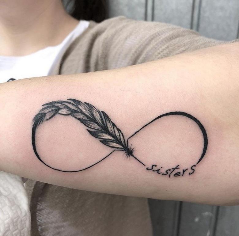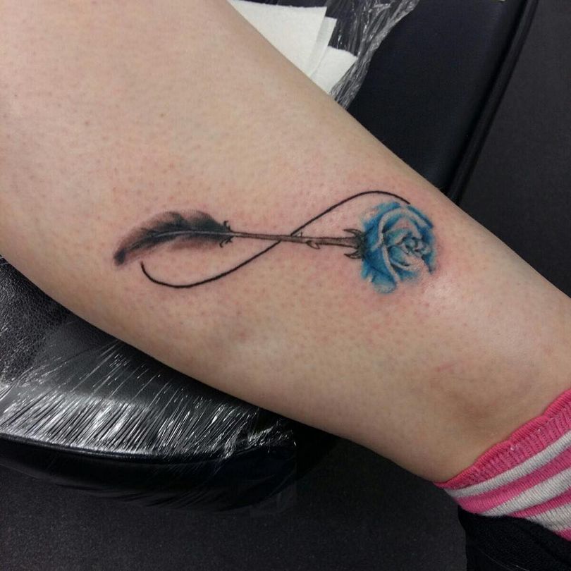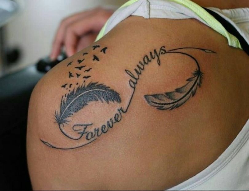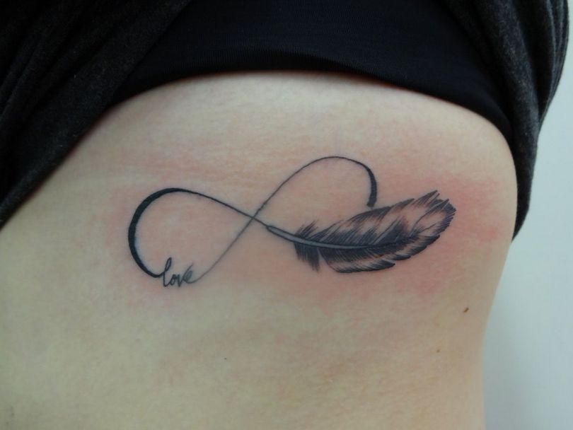 - L'infini avec les éléments d'une plume et une inscription. Le porteur de ce tatouage peut être considéré non seulement comme une personne vulnérable, mais aussi comme une personne très sensible. La plume représente la légèreté et la liberté et, associée au symbole de l'éternité, elle symbolise l'aspiration constante et la recherche de la liberté. Ce tatouage est idéal pour les personnes créatives.