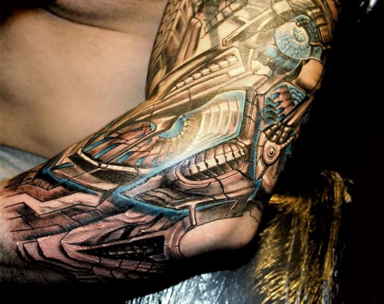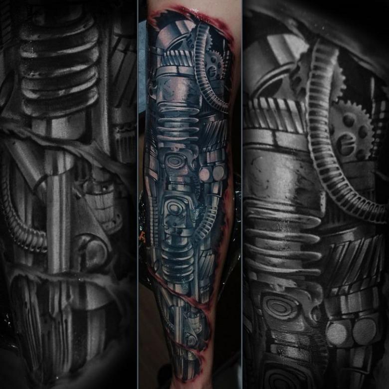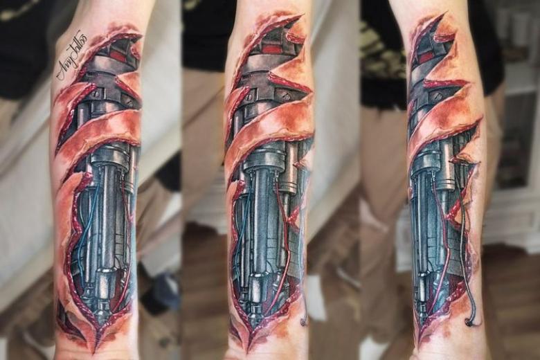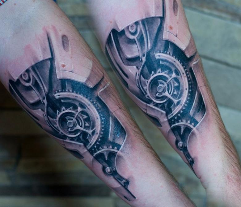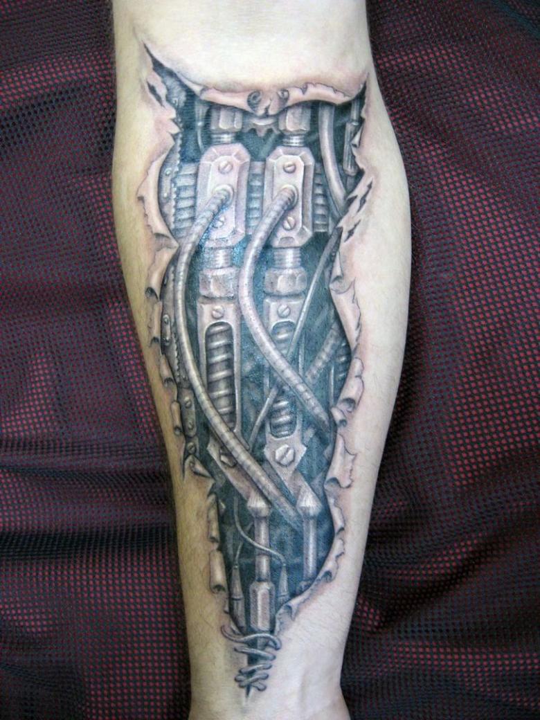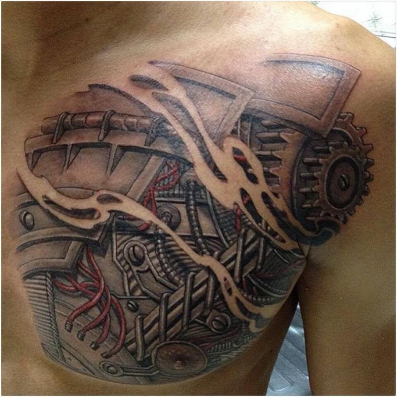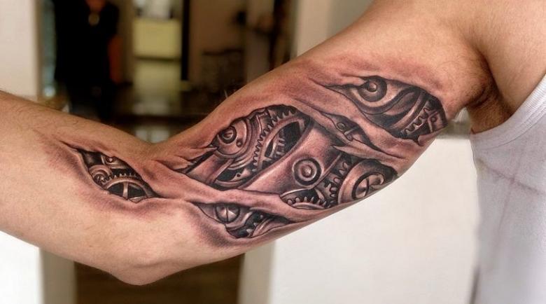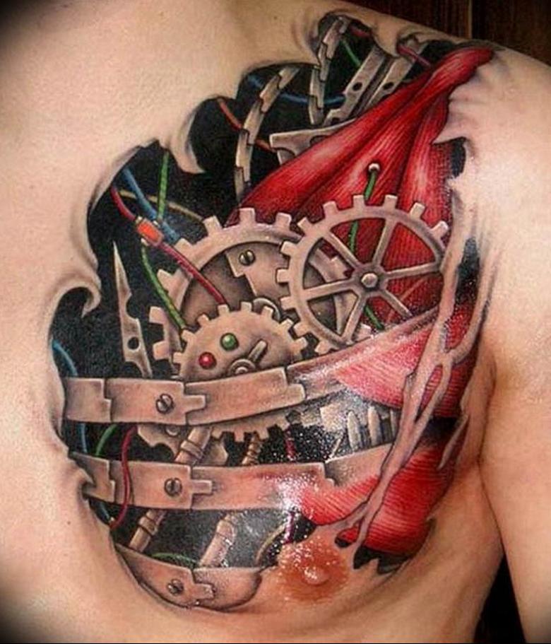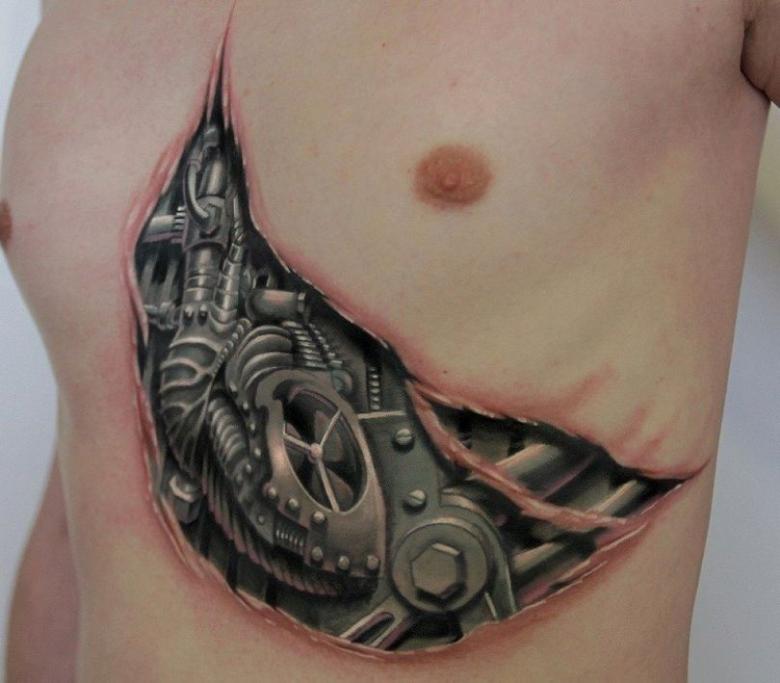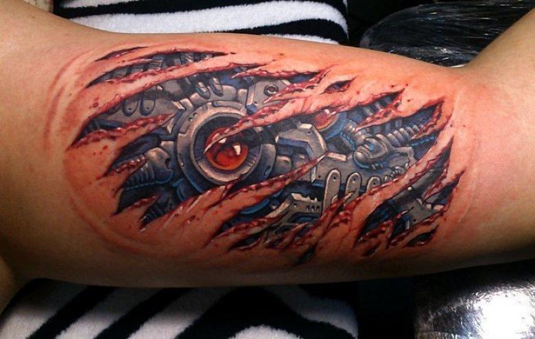 Les motifs appliqués sur le corps ont l'apparence de la chair déchirée, à travers laquelle transparaissent les engrenages, les puces, les fils entrelacés, les panneaux de commande et autres éléments mécaniques. Un tatouage biomécanique de qualité peut être une véritable œuvre d'art.