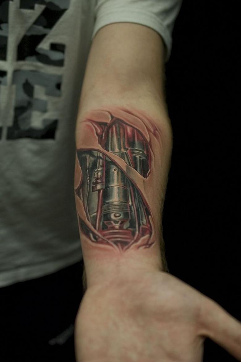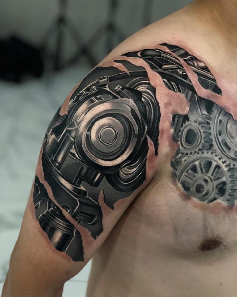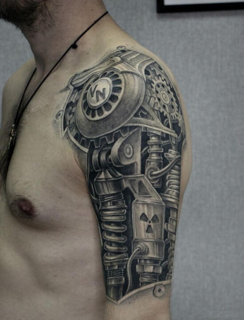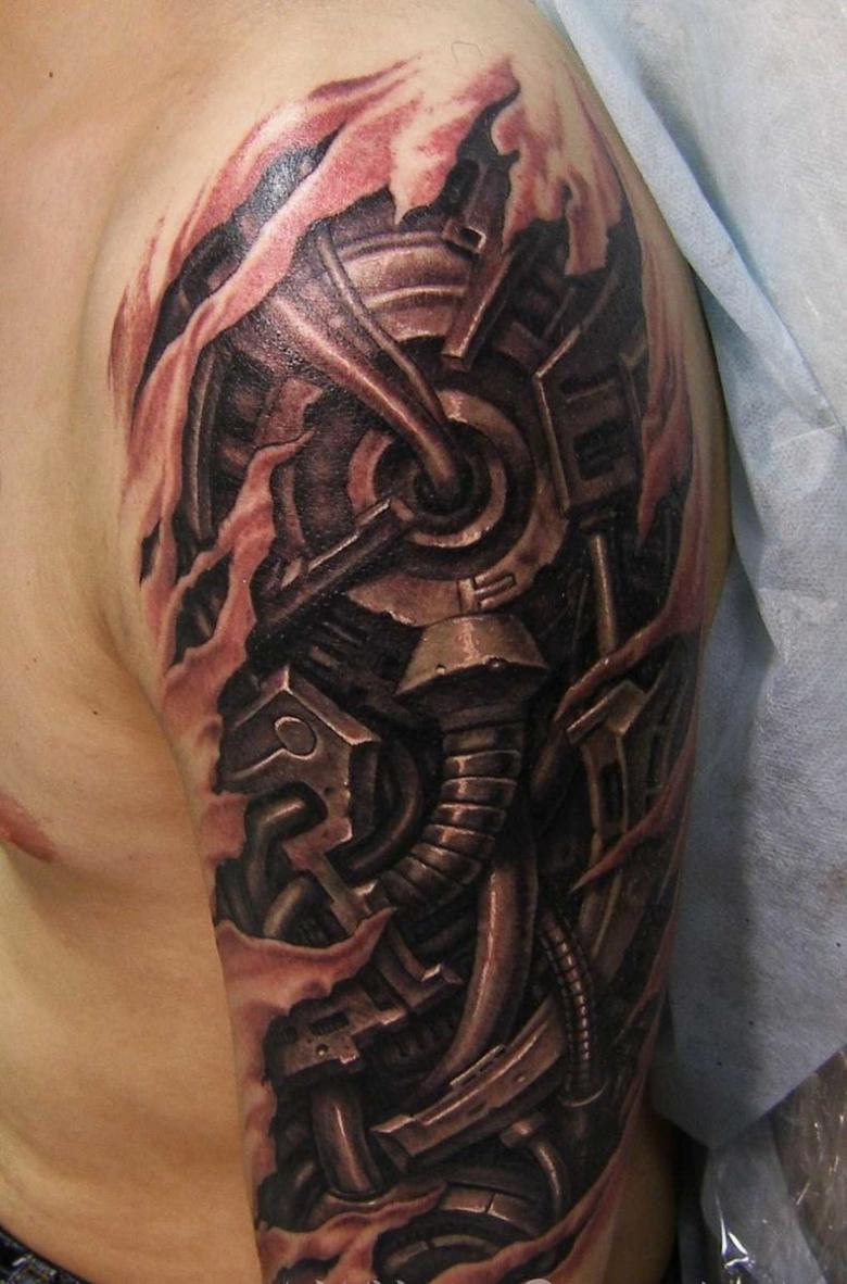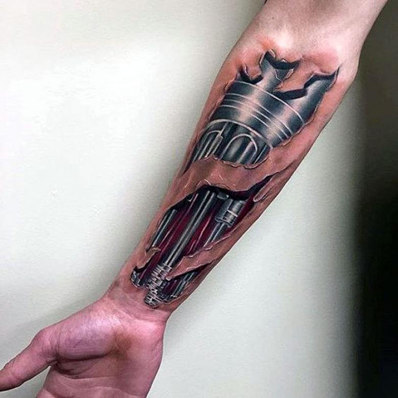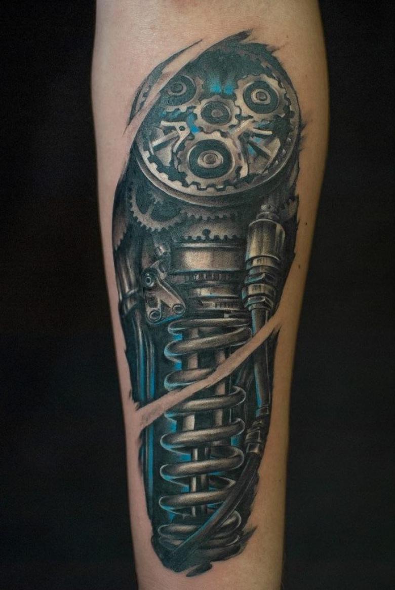 Les motifs appliqués sur le corps ont l'apparence de la chair déchirée, à travers laquelle transparaissent les engrenages, les puces, les fils entrelacés, les panneaux de commande et autres éléments mécaniques. Un tatouage biomécanique de qualité peut être une véritable œuvre d'art.