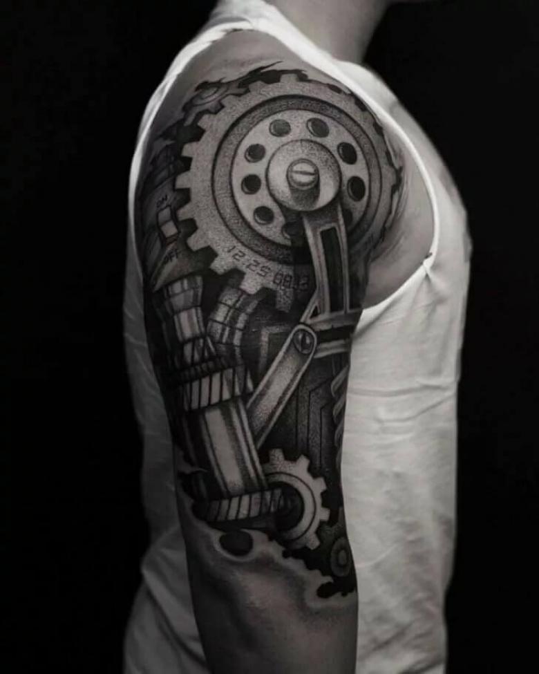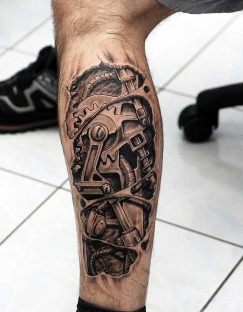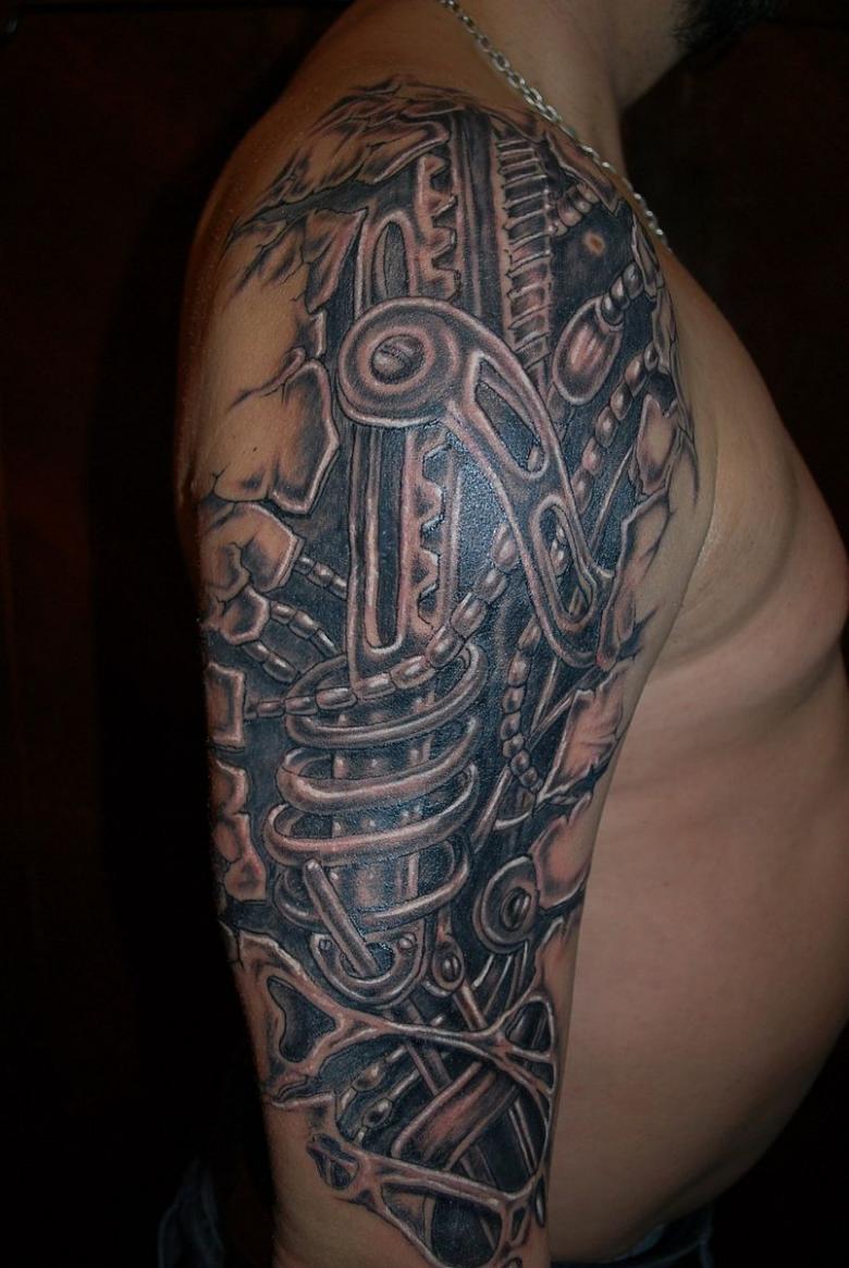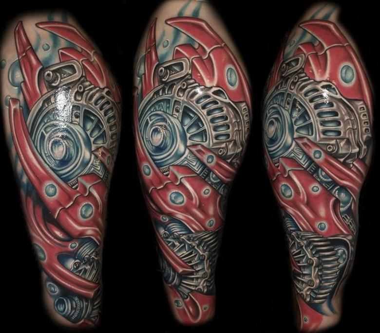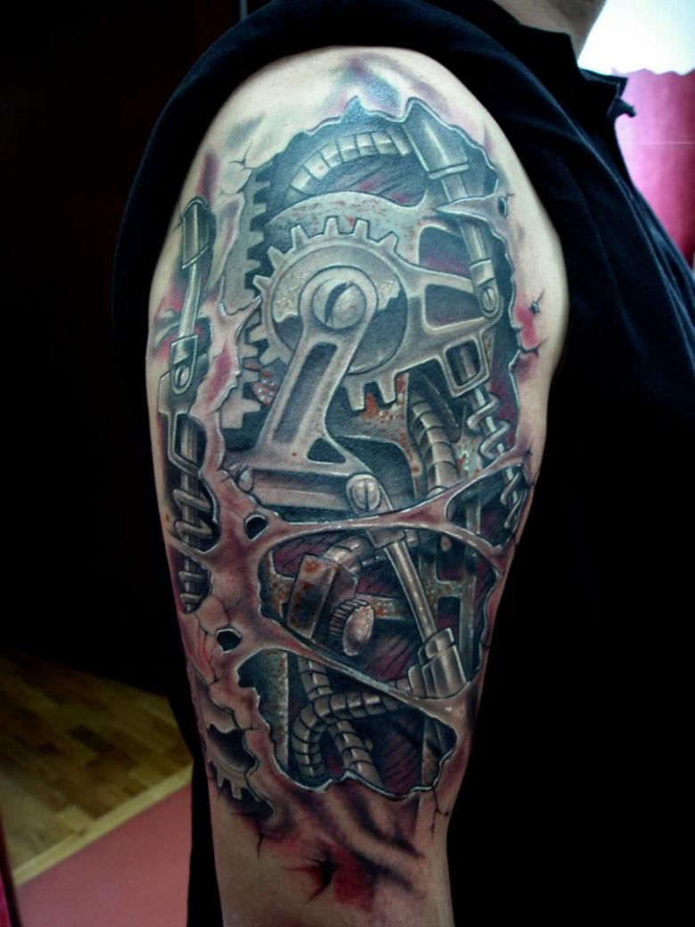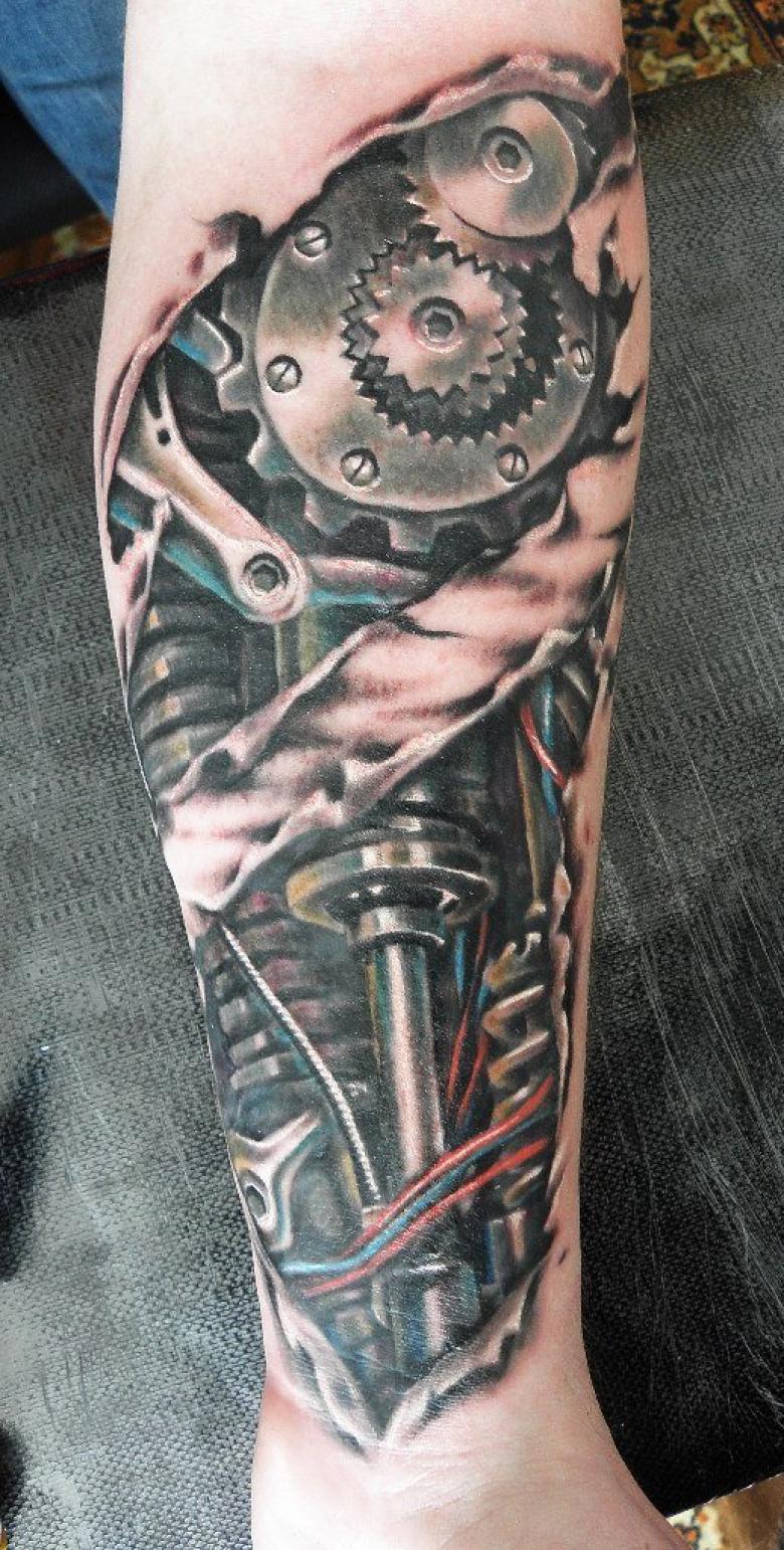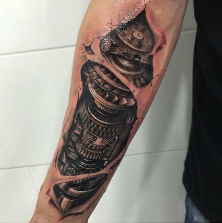 Les motifs appliqués sur le corps ont l'apparence de la chair déchirée, à travers laquelle transparaissent les engrenages, les puces, les fils entrelacés, les panneaux de commande et autres éléments mécaniques. Un tatouage biomécanique de qualité peut être une véritable œuvre d'art.