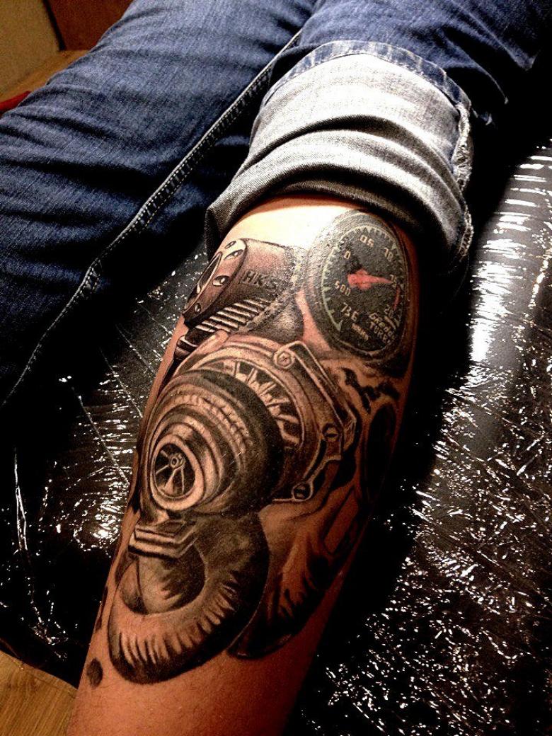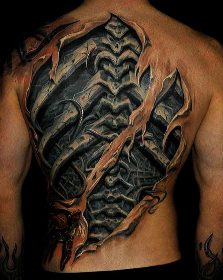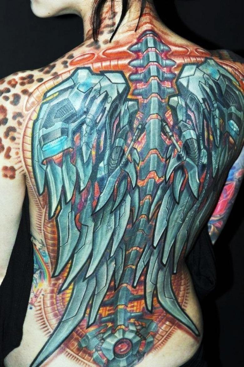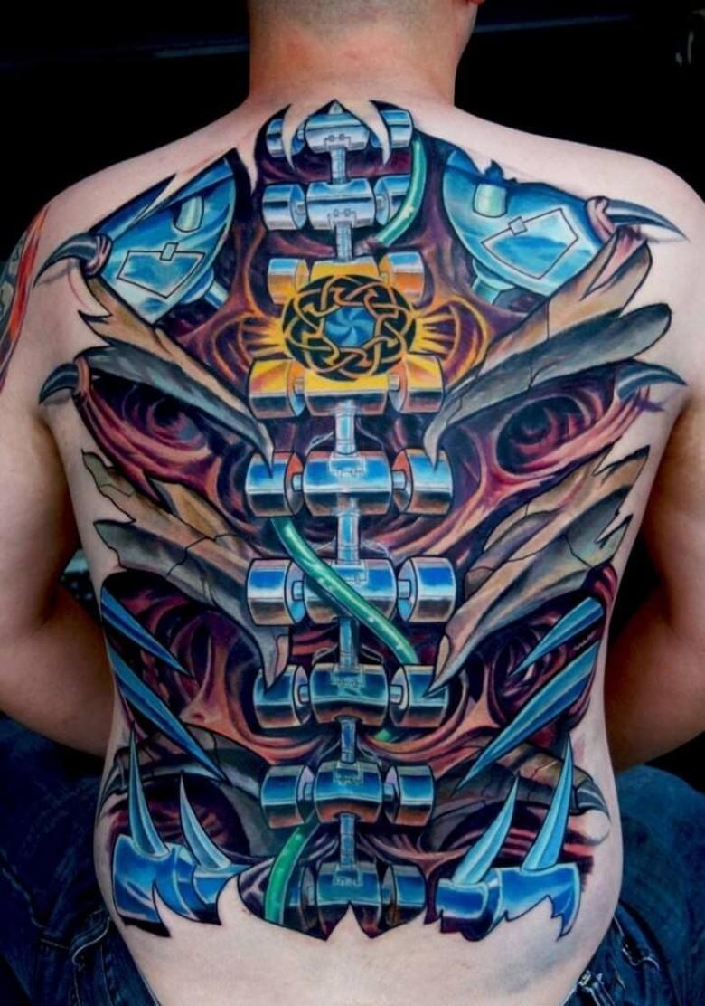 La grande surface de la peau fait du dos un endroit idéal pour les tatouages. L'artiste peut y réaliser ses visions les plus ambitieuses. Un plus grand nombre d'éléments mécaniques peut être utilisé pour donner à l'image un impact maximal.