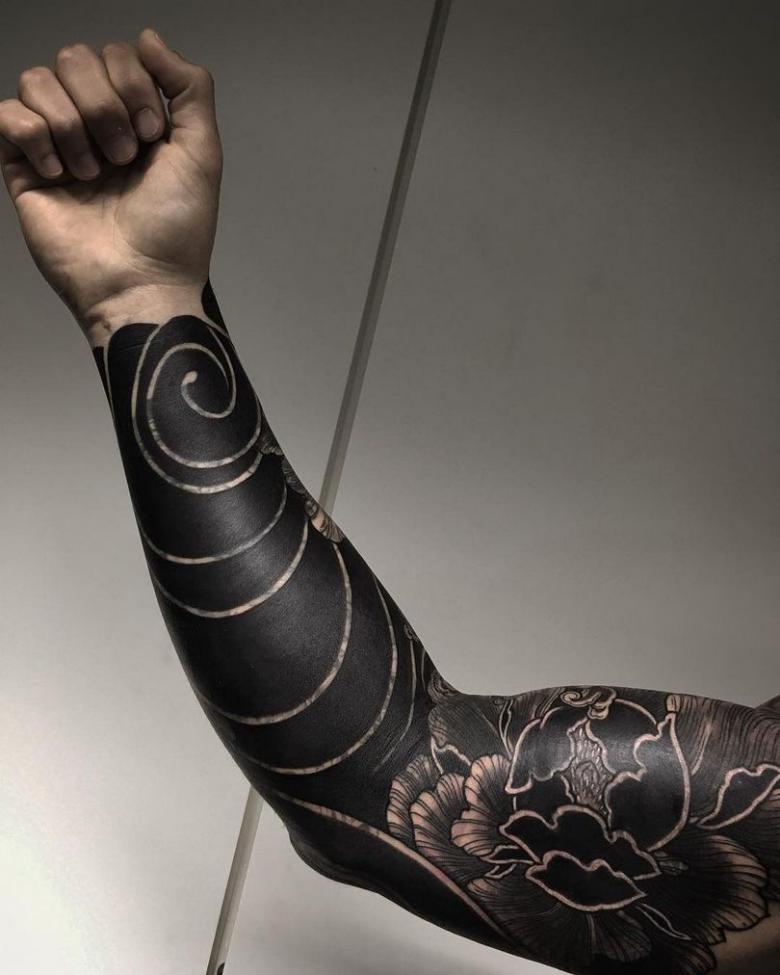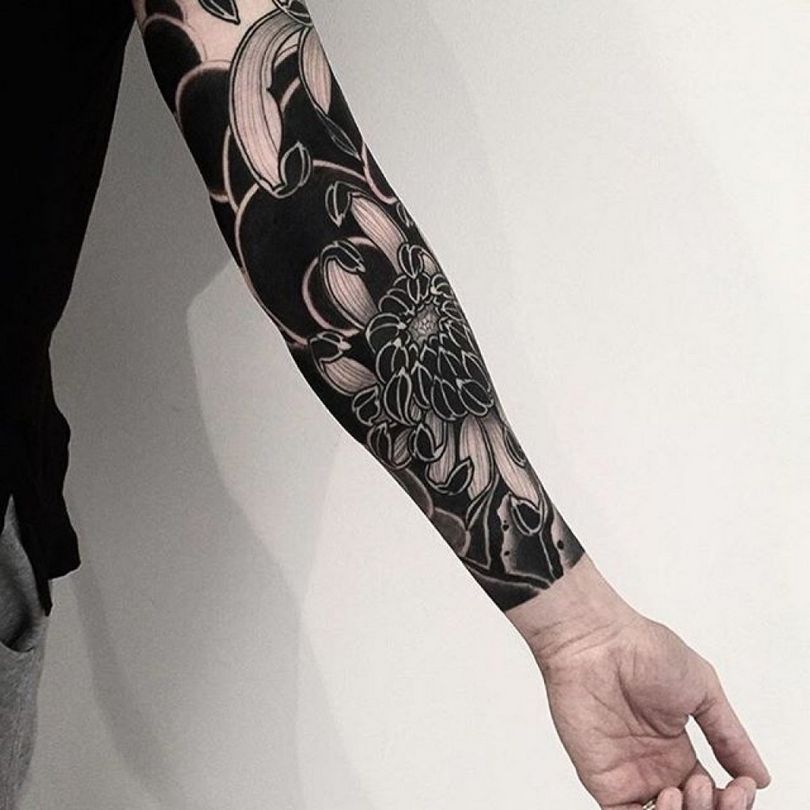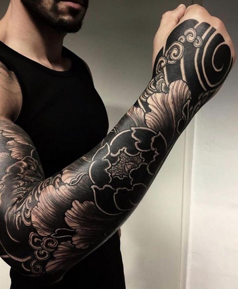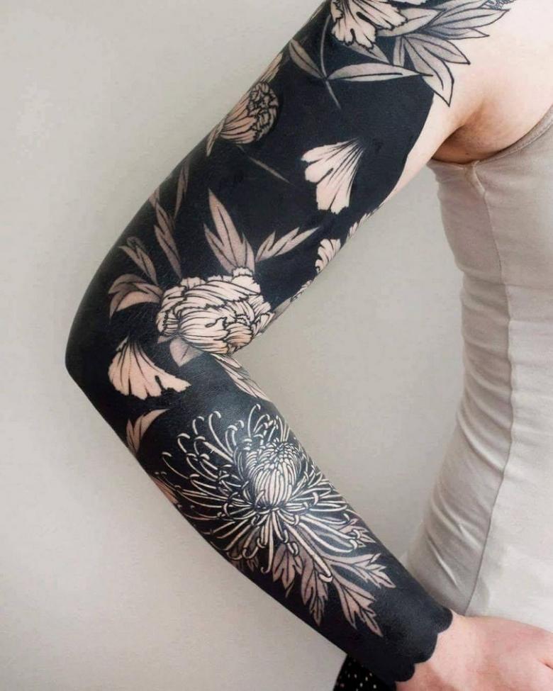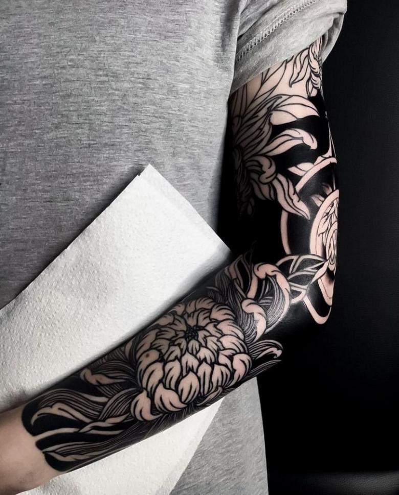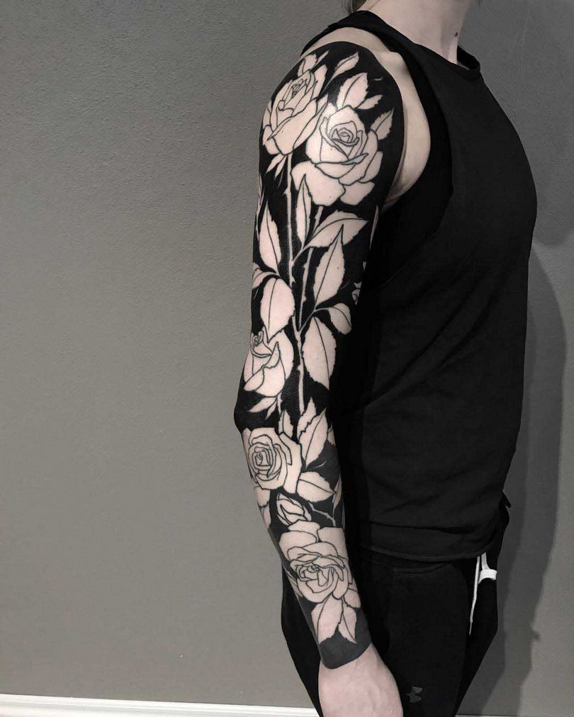 La manche blackwork, qui occupe une niche à part dans l'art du tatouage, est particulièrement intéressante. Une version audacieuse du tatouage sans âge, il commence généralement à la tête de l'épaule et coule joliment le long du bras, couvrant le poignet.