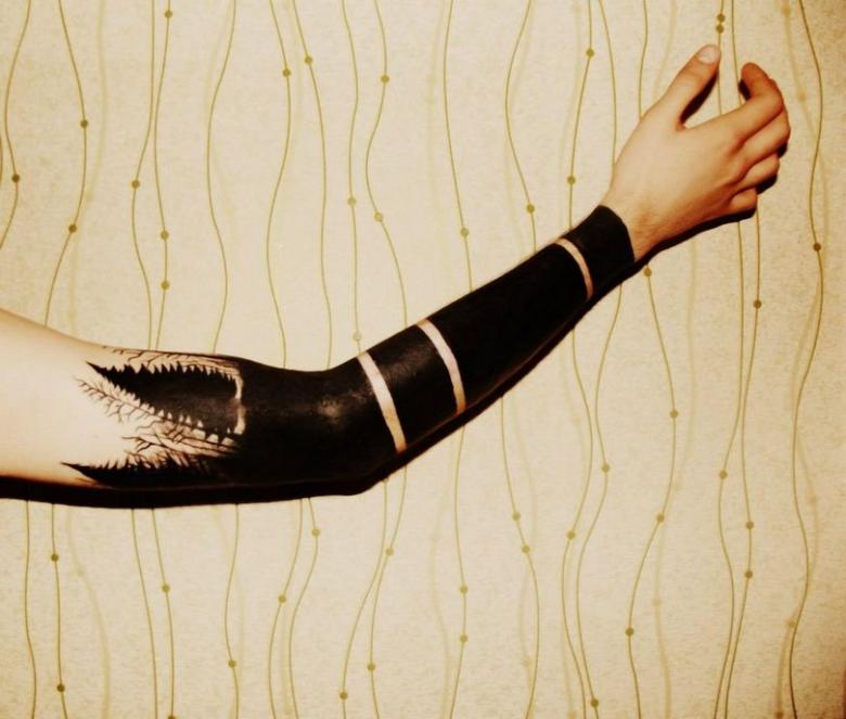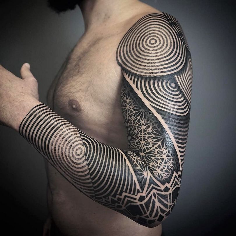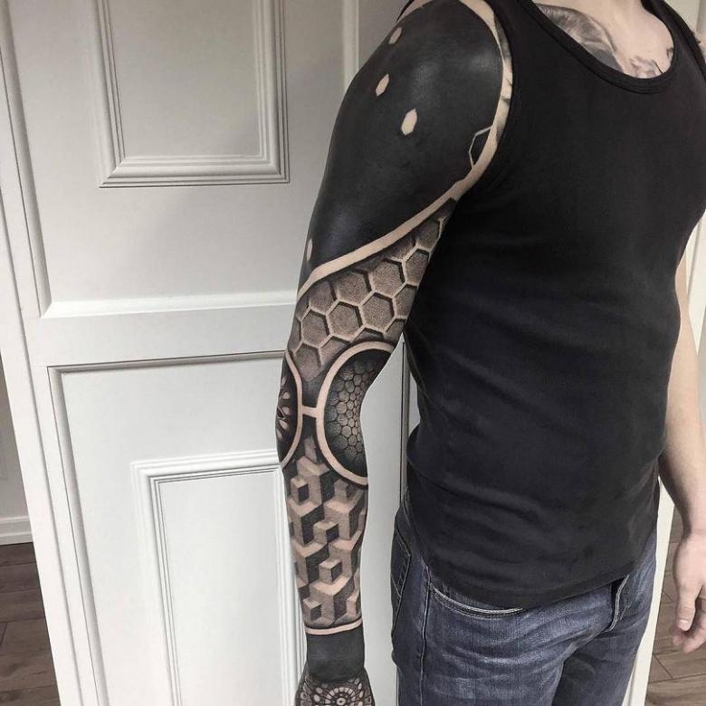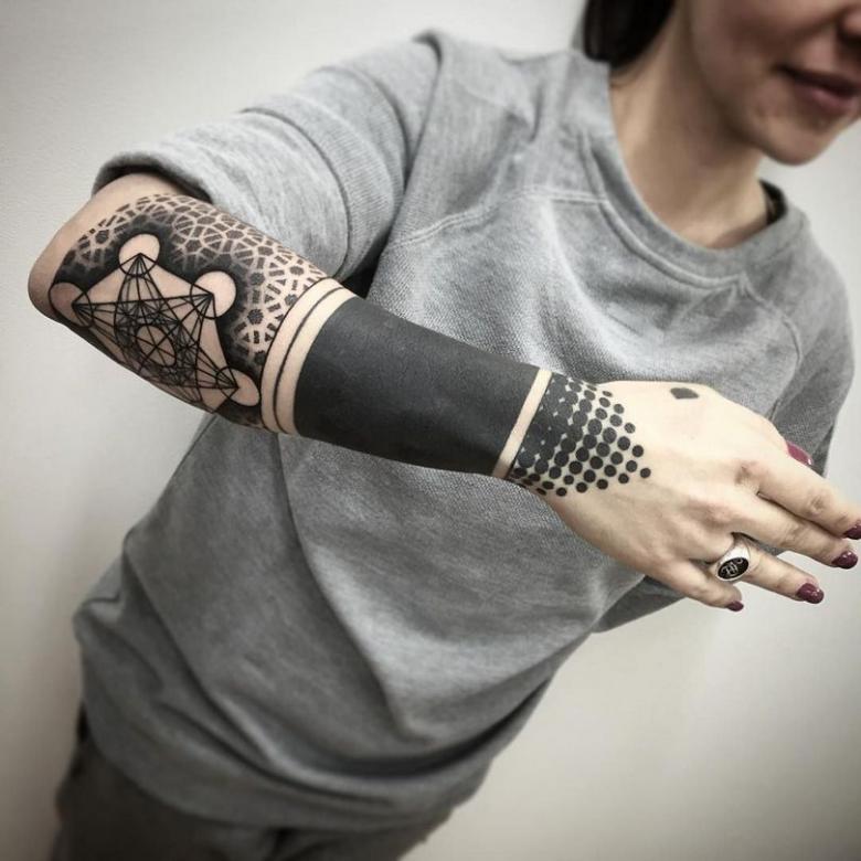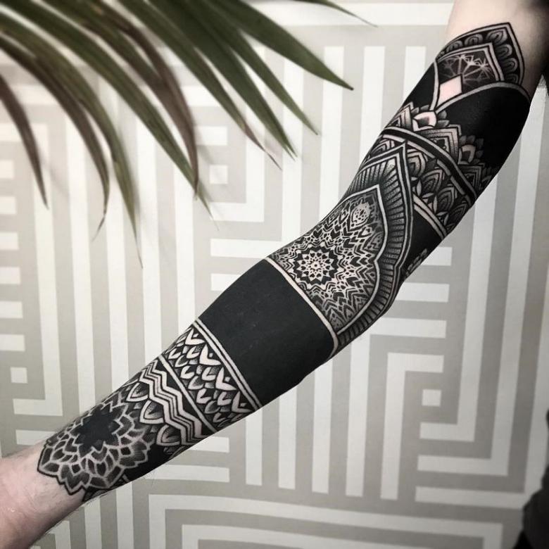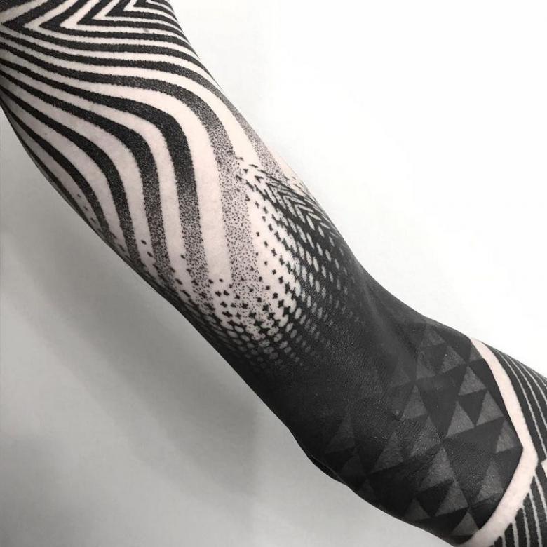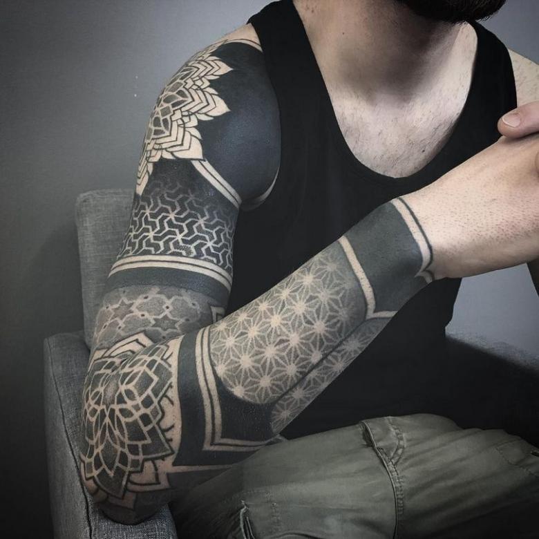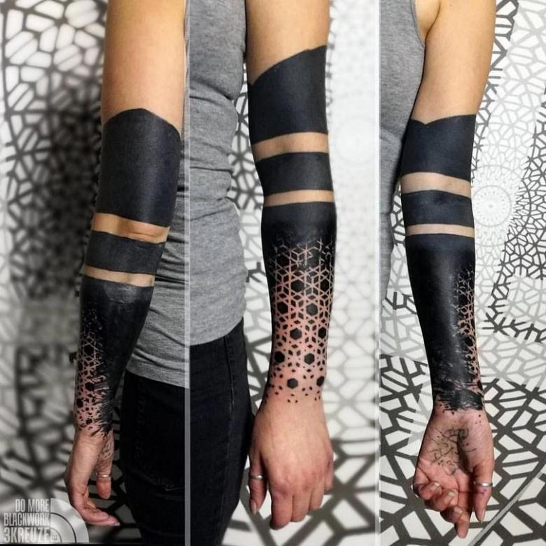De nombreux amateurs d'art graphique ont été attirés par la possibilité de remplir complètement de pigment noir des parties du corps de taille impressionnante (cou, bras ou jambes). Pour adoucir les limites du tatouage, les maîtres utilisent des combinaisons de différents styles. Par exemple, le raccordement d'un manchon blackwork avec un petit élément dotwork, réalisé avec la technique du pointillé.