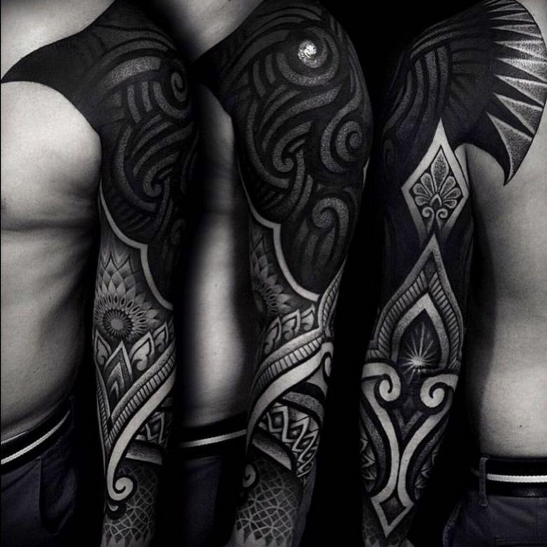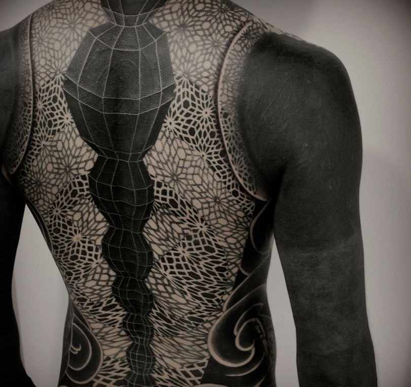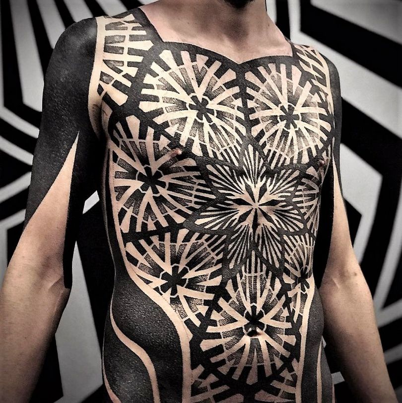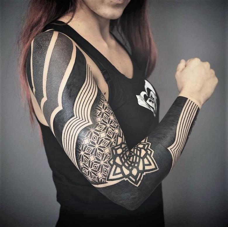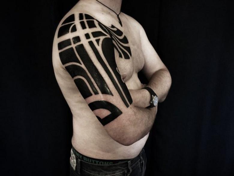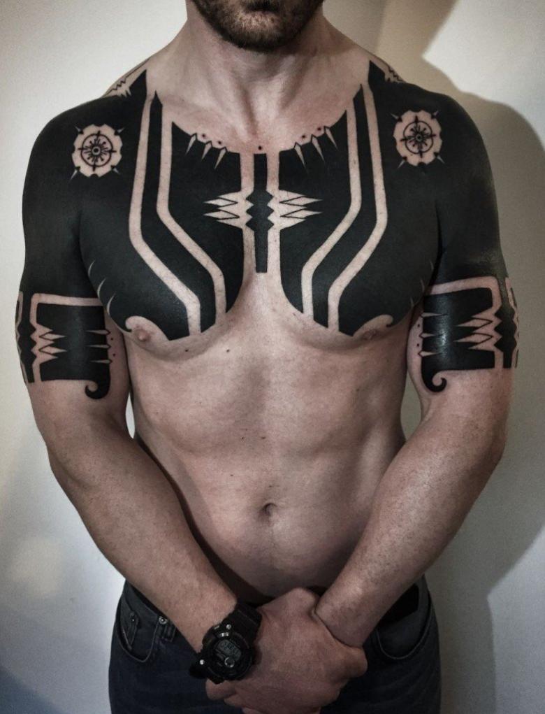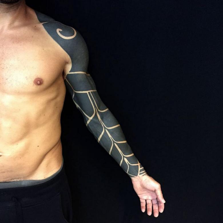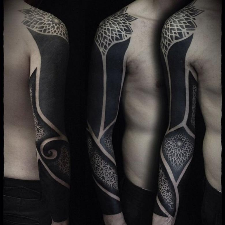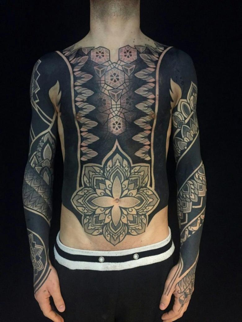 Dans certains cas, le motif se déplace vers le dos et la poitrine avec un jeu original de nuances de couleur sombre. Parmi les nombreuses options d'armure Blackwork, vous pouvez choisir la fantaisie la plus insolite, en commandant à un artiste Blackwork de concevoir votre propre esquisse.