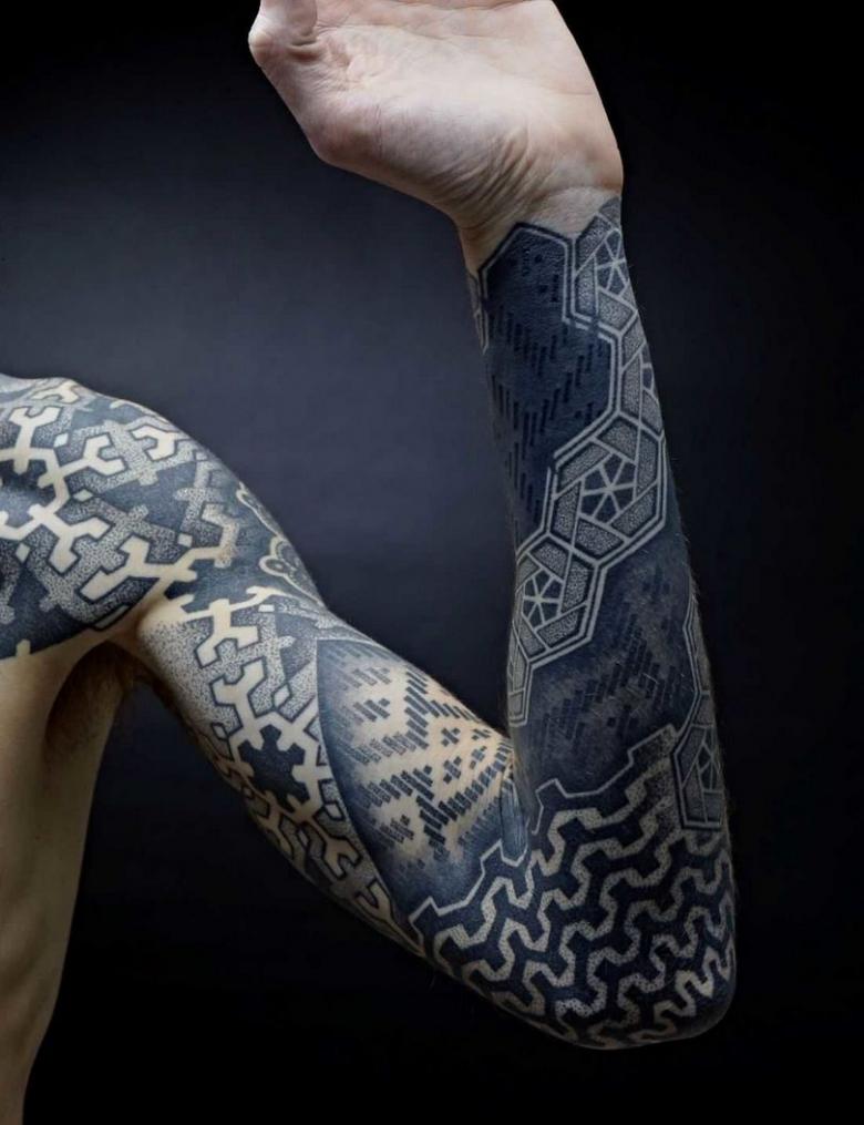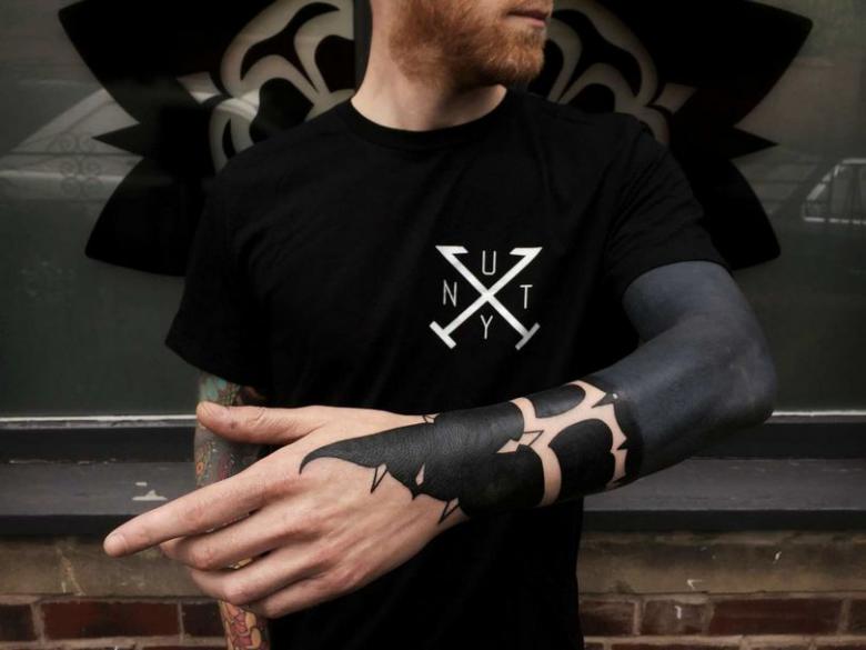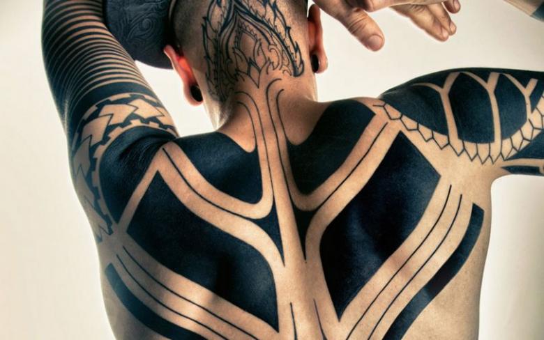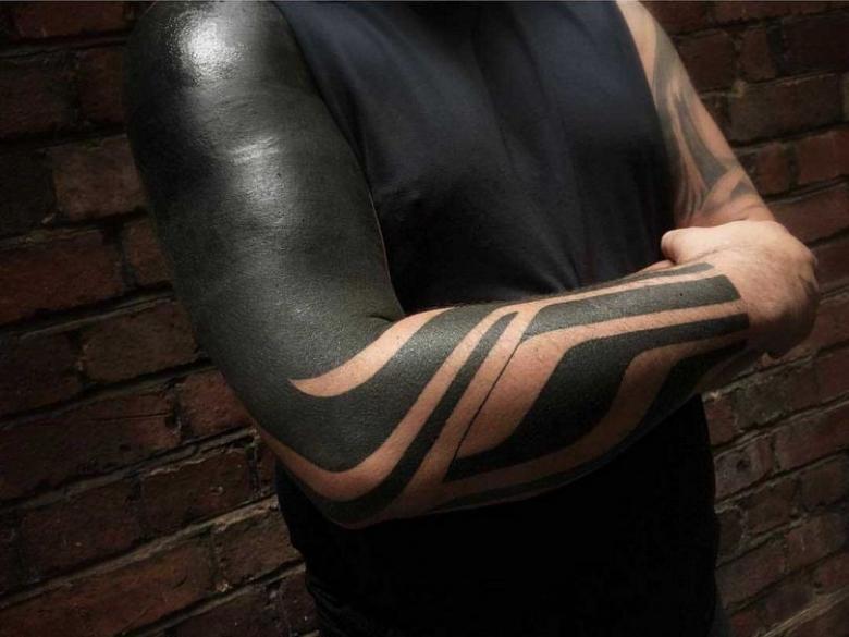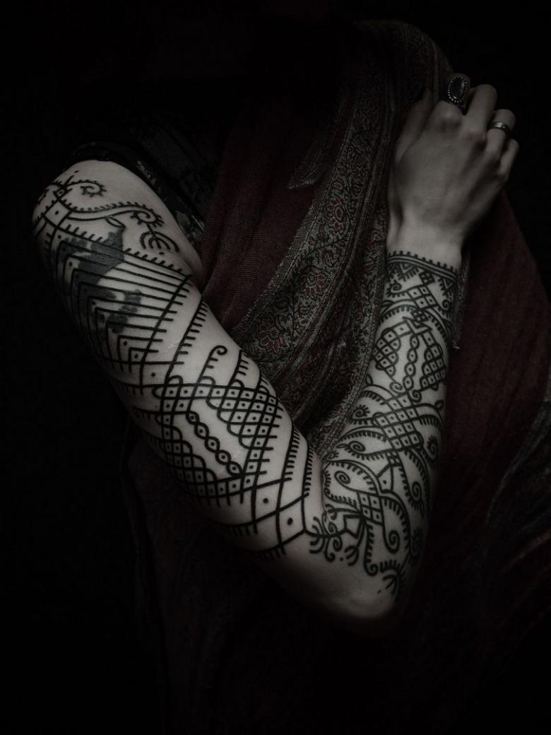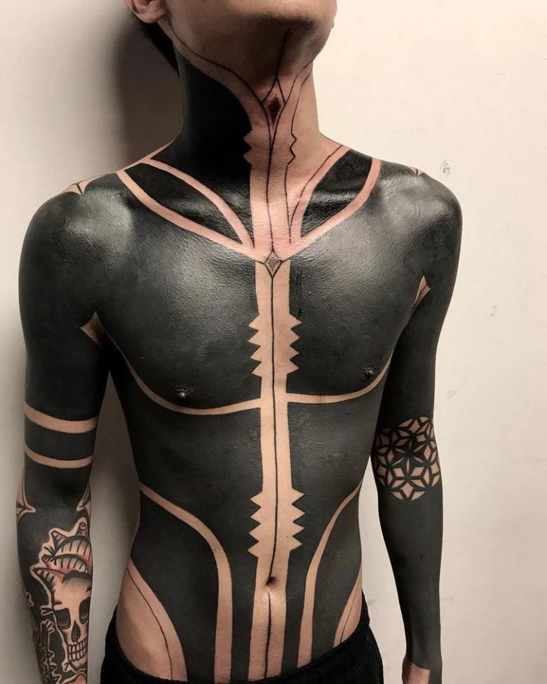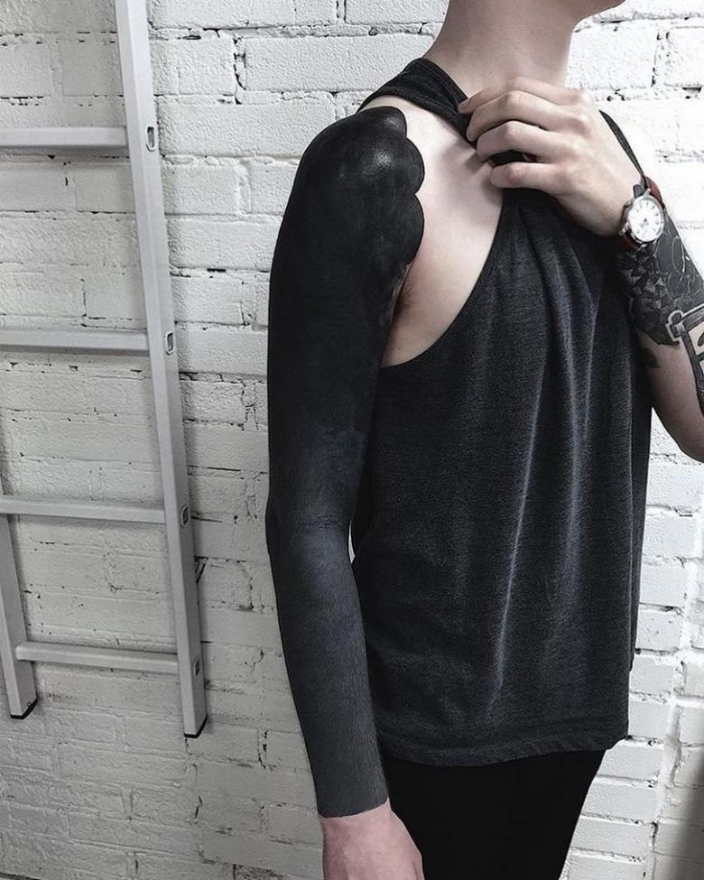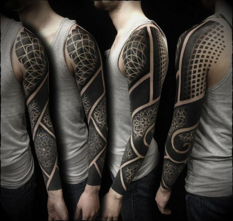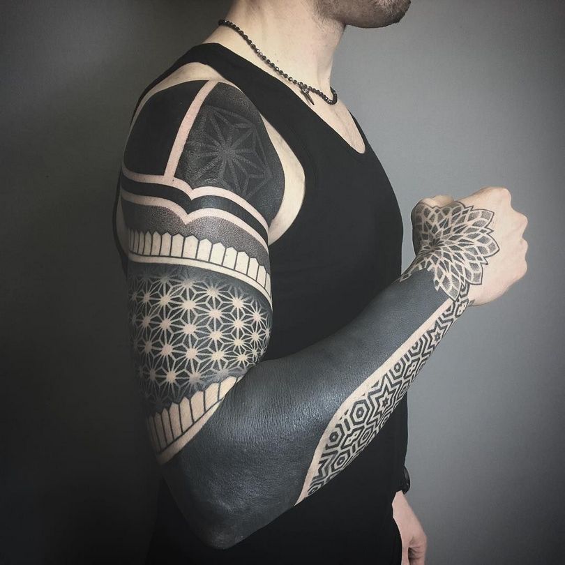 Dans certains cas, le motif se déplace vers le dos et la poitrine avec un jeu original de nuances de couleur sombre. Parmi les nombreuses options d'armure Blackwork, vous pouvez choisir la fantaisie la plus insolite, en commandant à un artiste Blackwork de concevoir votre propre esquisse.