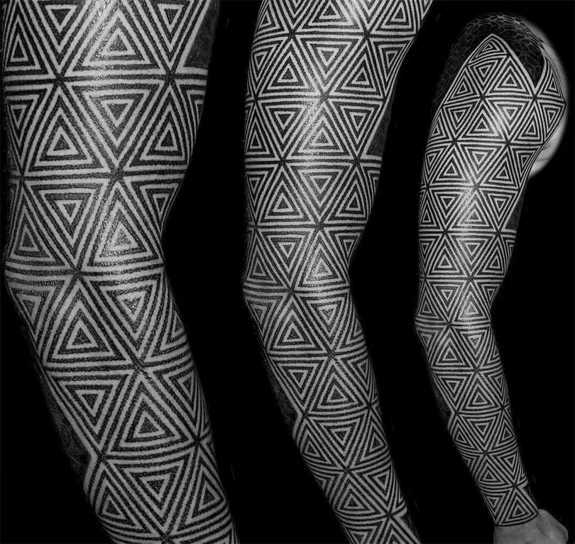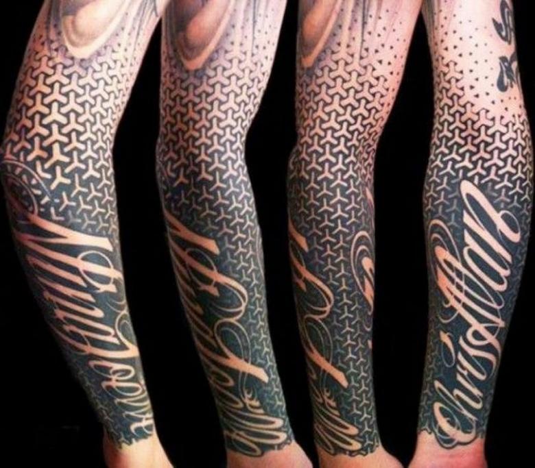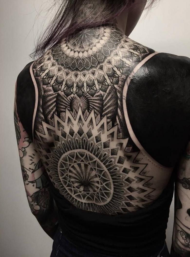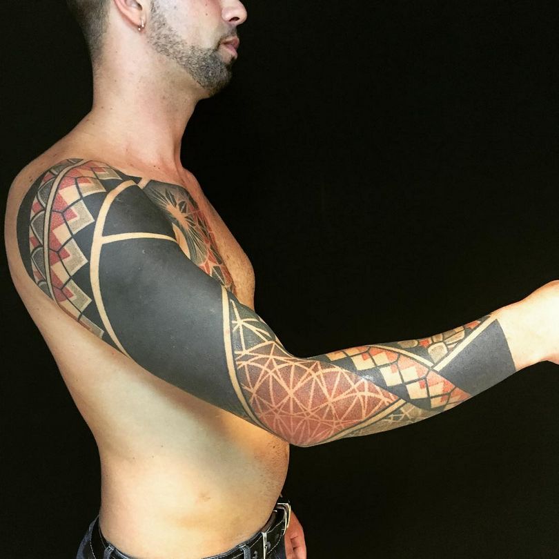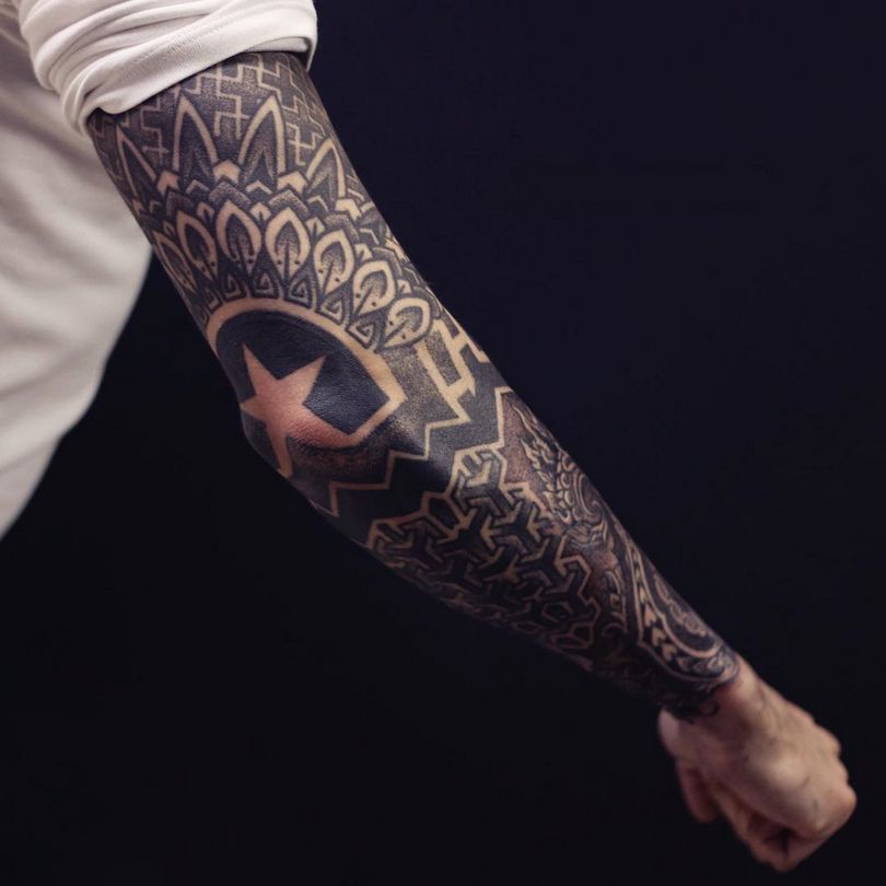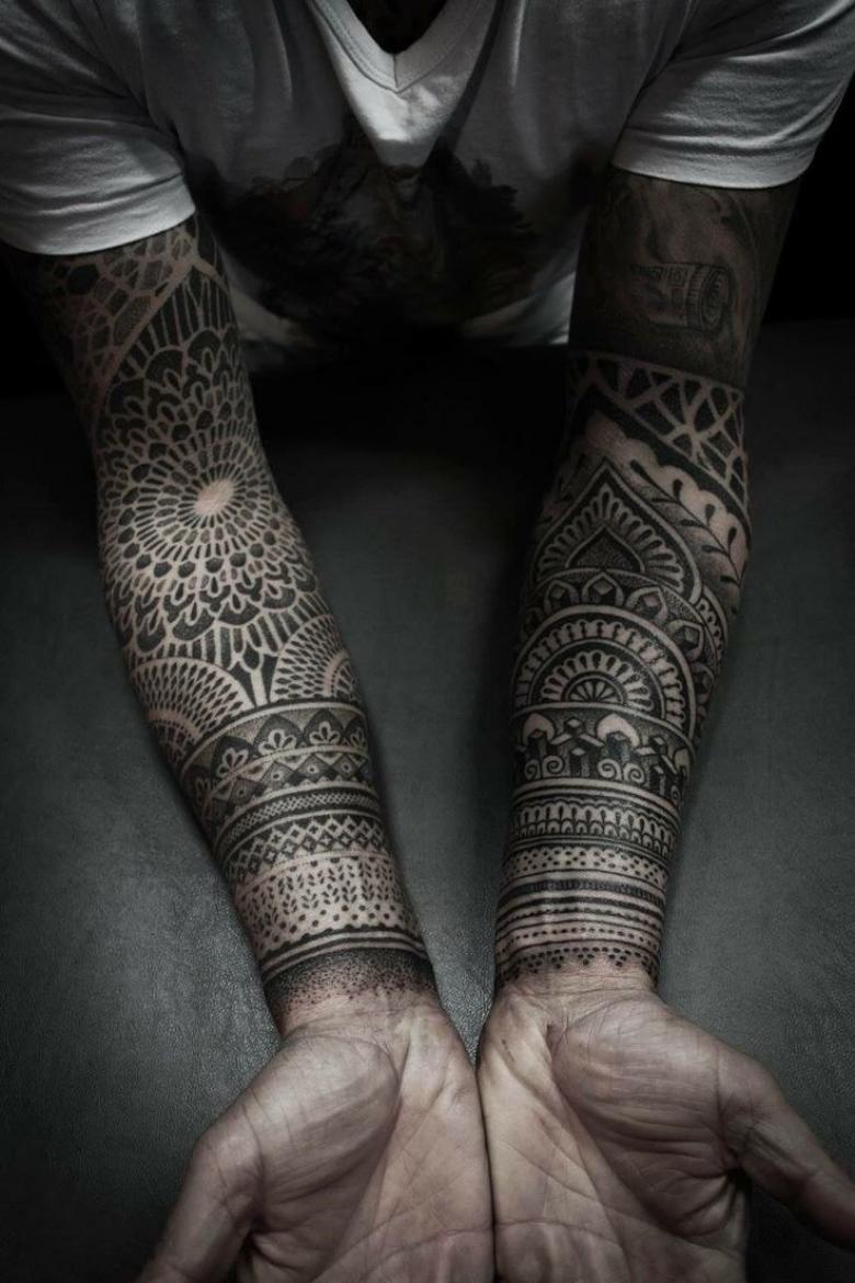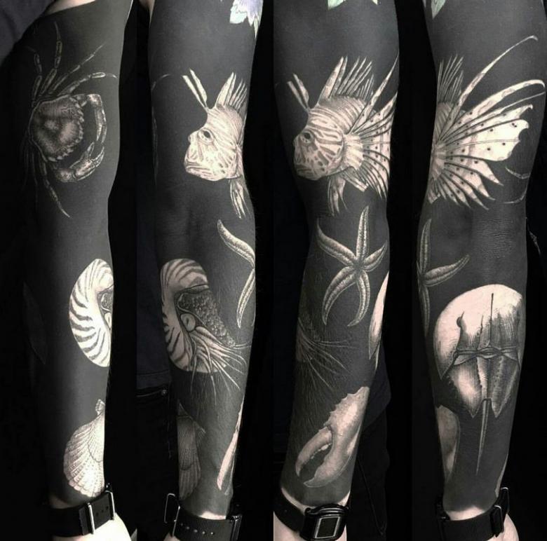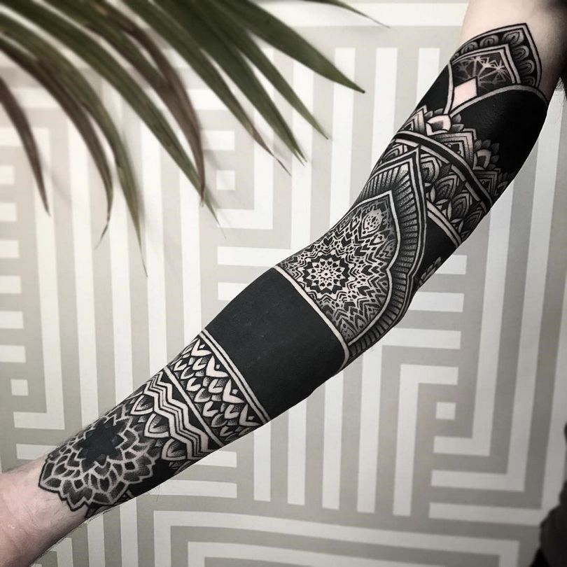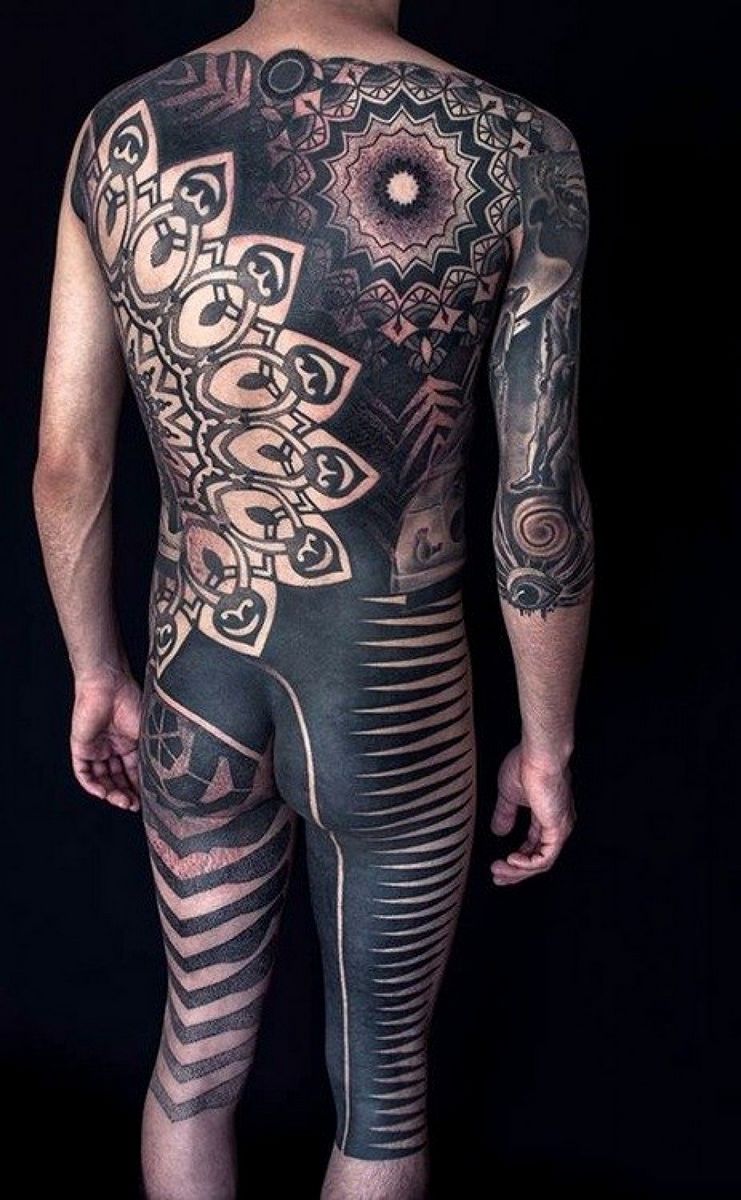 Dans certains cas, le motif se déplace vers le dos et la poitrine avec un jeu original de nuances de couleur sombre. Parmi les nombreuses options d'armure Blackwork, vous pouvez choisir la fantaisie la plus insolite, en commandant à un artiste Blackwork de concevoir votre propre esquisse.