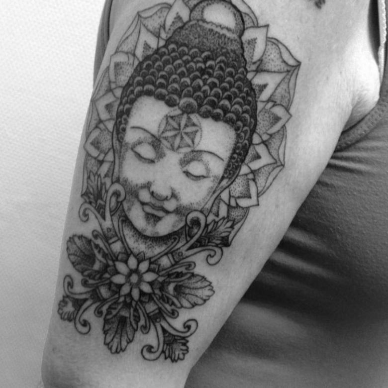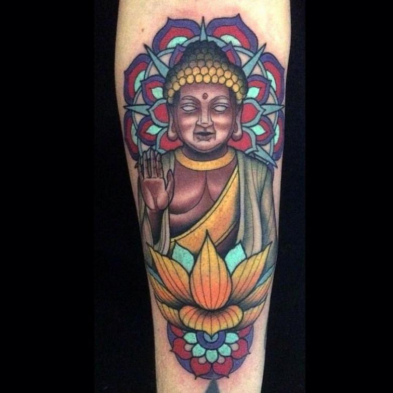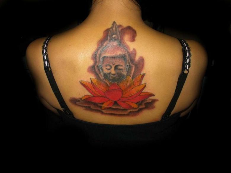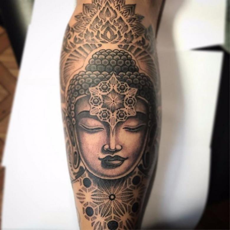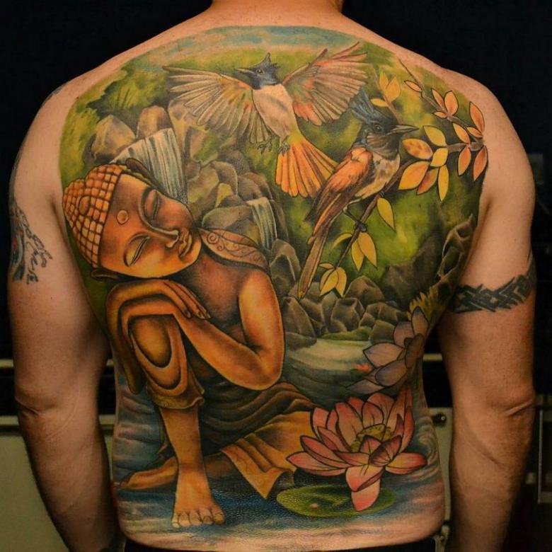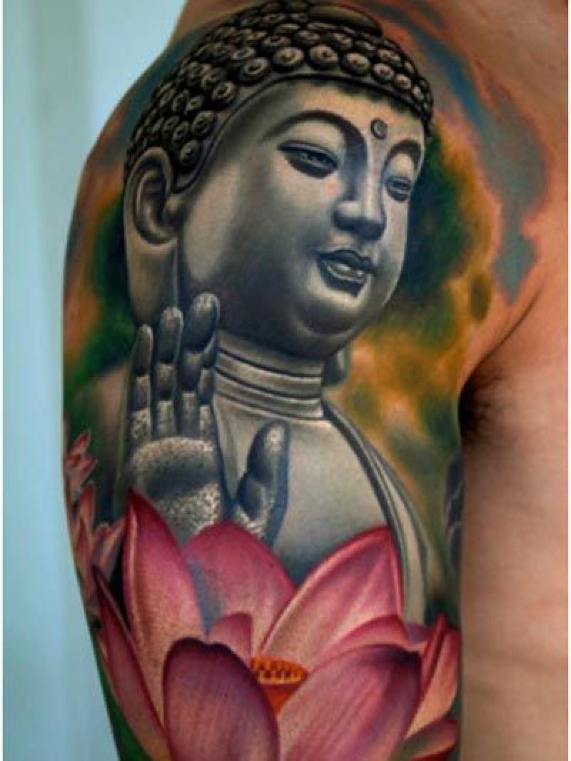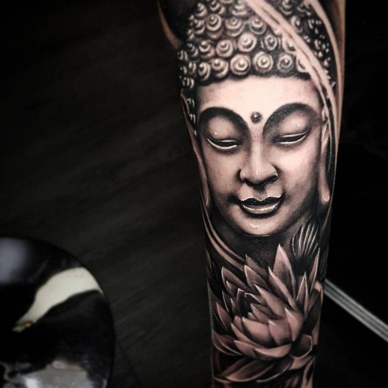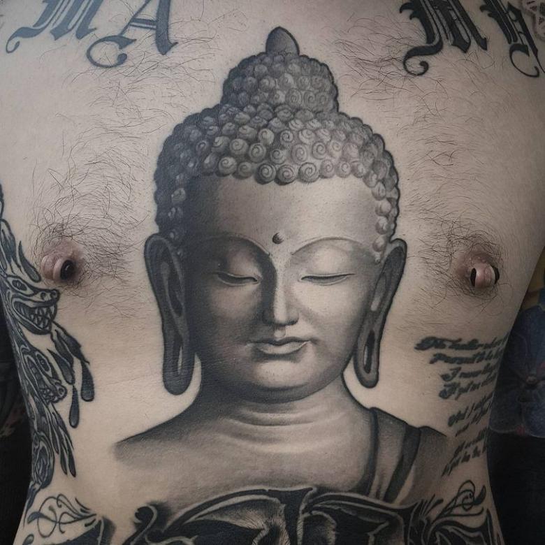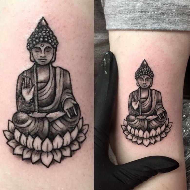 L'image de Gautama peut être portée par toute personne qui connaît la philosophie karmique du bouddhisme. Il est dit que ce que vous envoyez au monde, le monde vous le rend. Le tatouage peut être monochrome ou coloré. Si vous voyez le Bouddha et la fleur de lotus, cela signifie la pureté de pensée de la personne qui porte le tatouage.