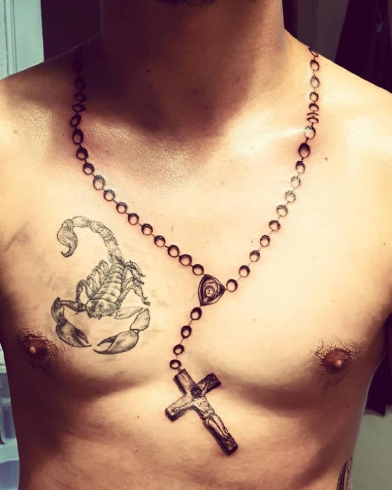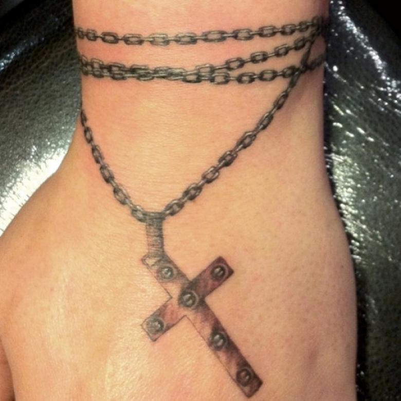 Complété par une croix ou une grande croix - une imitation d'un ornement corporel. Contrairement à la version originale, il ne noircira pas et ne disparaîtra pas. Si le tatouage lui-même est assez grand ou s'il est placé sur une zone de la peau autre que le cou, il est le symbole d'une croyance en soi, d'une conviction en quelque chose. La croix elle-même est portée par les gens comme un talisman.
