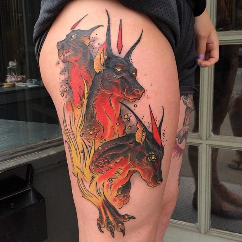 Dans ce cas, le choix se porte sur le style de réalisme. Esquisse d'un tatouage à choisir en noir et blanc ou en couleur, en ajoutant du rouge, du jaune, de l'orange. Le rouge est utilisé pour remplir les yeux ou la bouche des chiens à trois têtes et le jaune est utilisé pour les langues de flamme. Choisissez un tatouage sur la poitrine ou le dos. L'image à grande échelle est spectaculaire et envoûtante. Toute idée peut être réalisée par le maître dans le studio de tatouage.