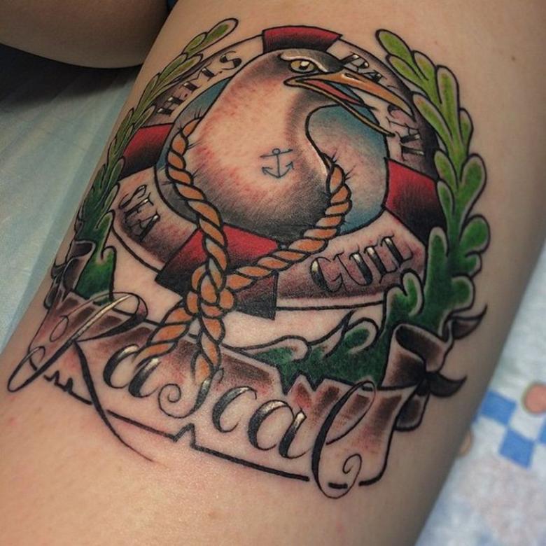 Les voleurs se déplaçant de ville en ville poignardaient une mouette sur leur main droite. S'ils voulaient montrer une amitié importante dans la nature, ils dessinaient l'oiseau contre un bouclier rayé. Ce signe serait tatoué sur la main. Il ne faut pas oublier que la mouette, comme tout oiseau, est associée aux trois éléments - l'eau, la terre et l'air. Un oiseau blanc est toujours un signe de bonnes nouvelles.